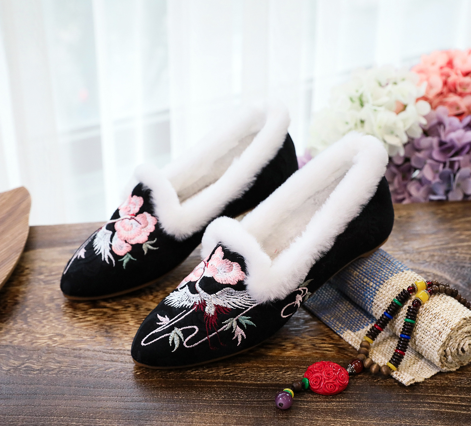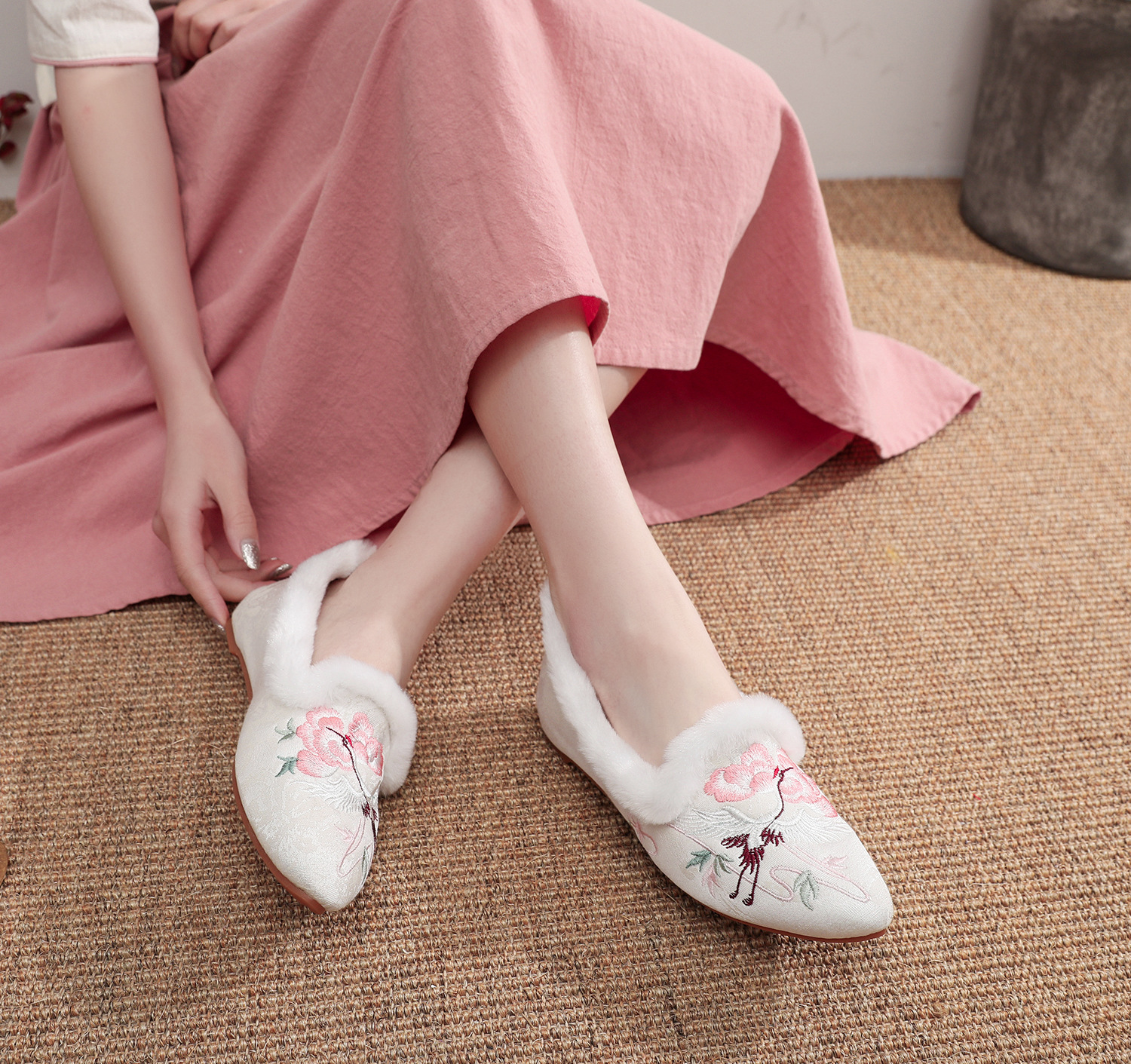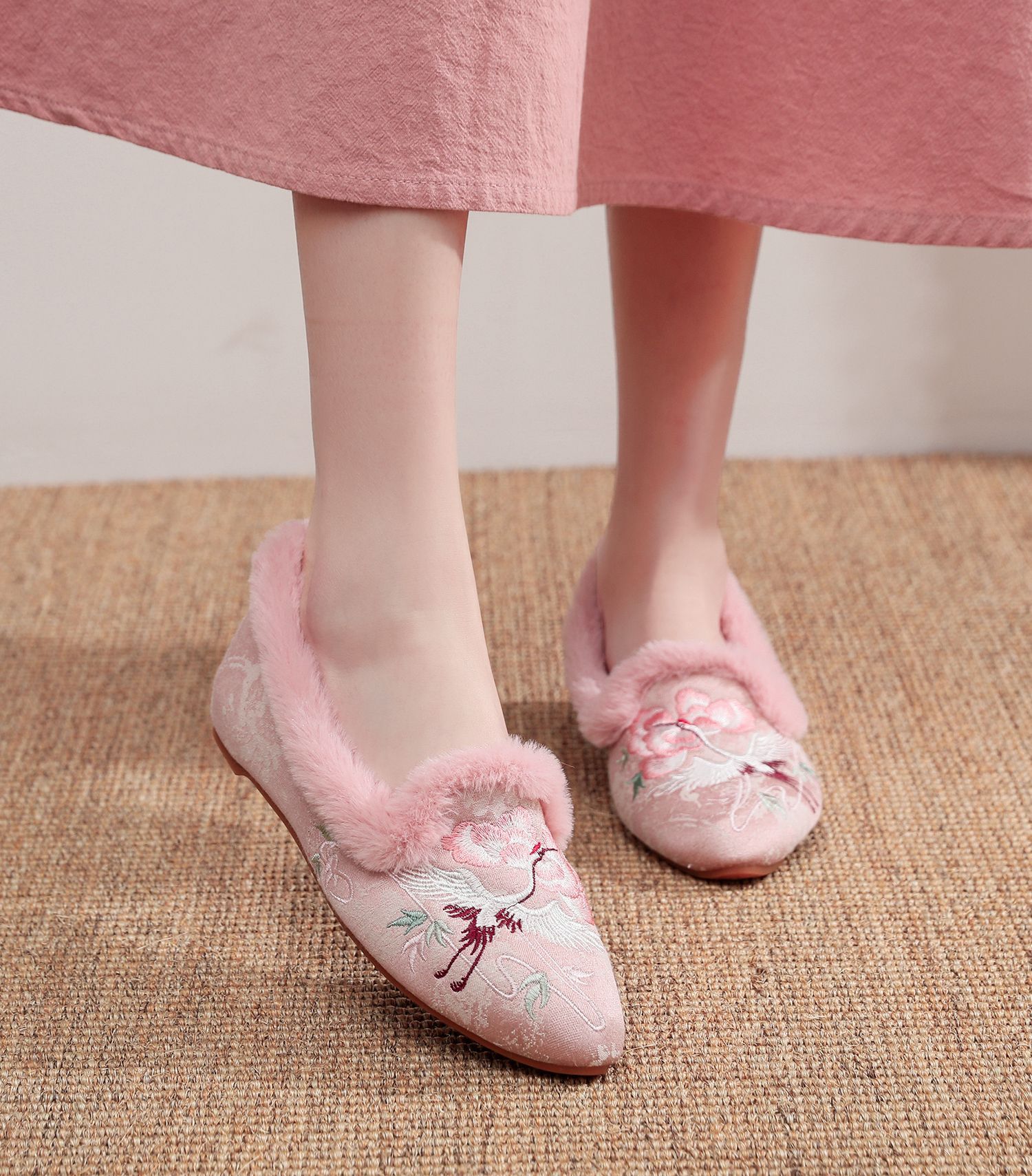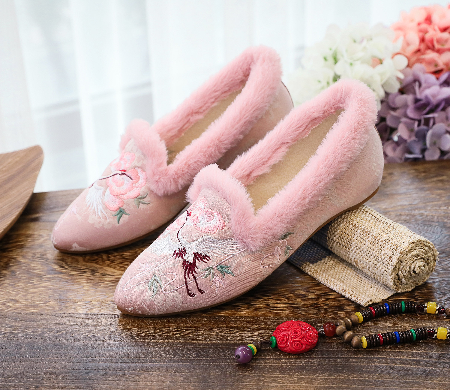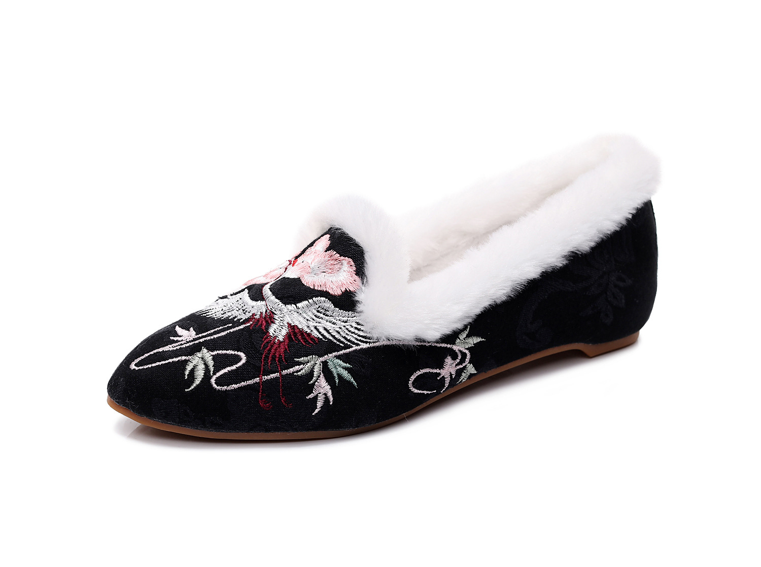 [Crane] новинки 2021 года с пушистым кантом, модная Тканевая обувь с остроконечной вышивкой, осенне-зимняя одношаговая Хлопковая женская обувь