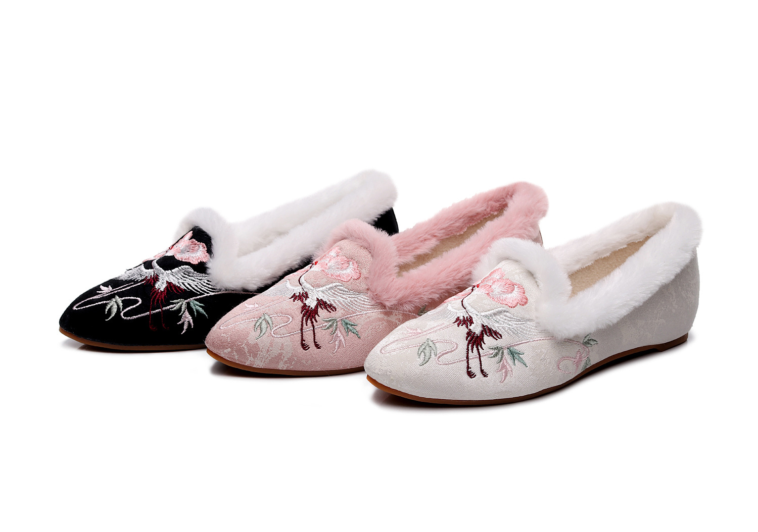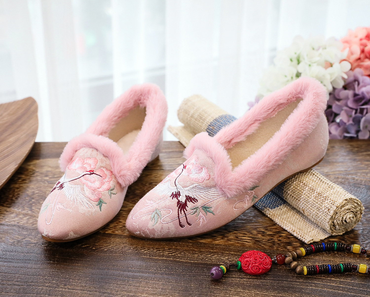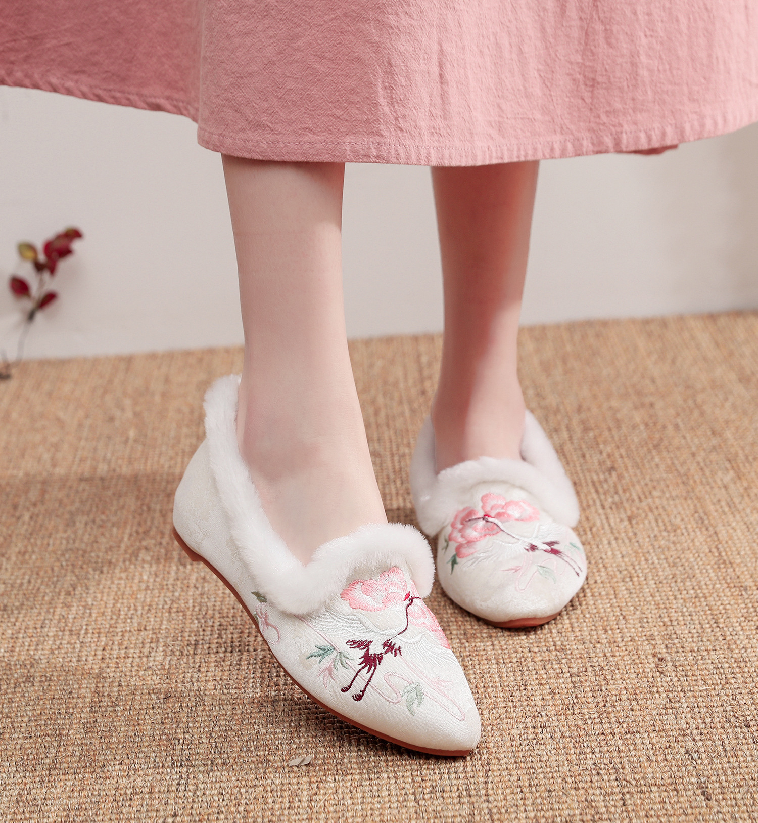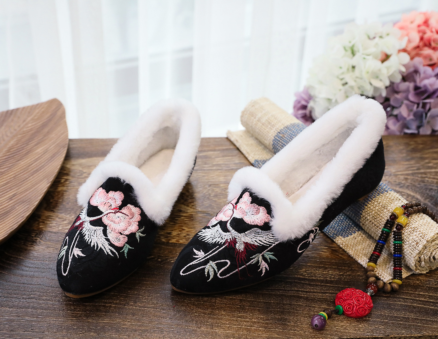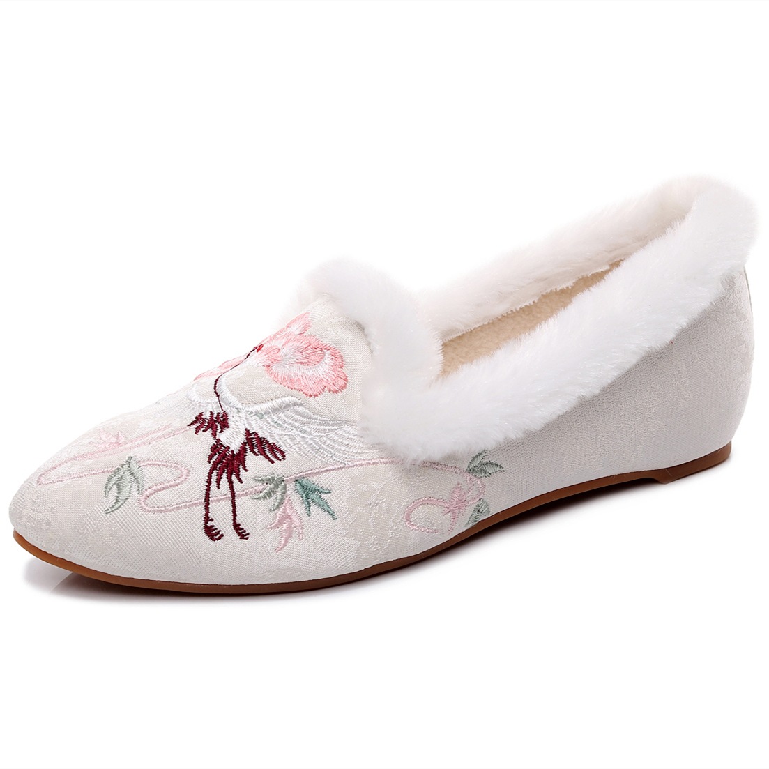 [Crane] новинки 2021 года с пушистым кантом, модная Тканевая обувь с остроконечной вышивкой, осенне-зимняя одношаговая Хлопковая женская обувь