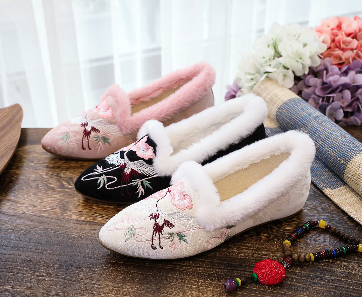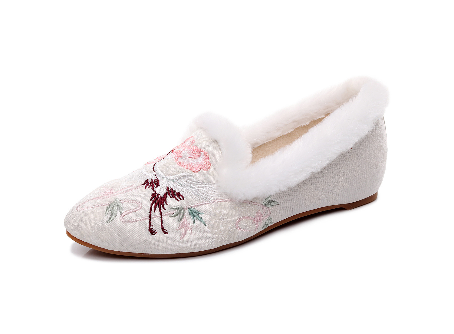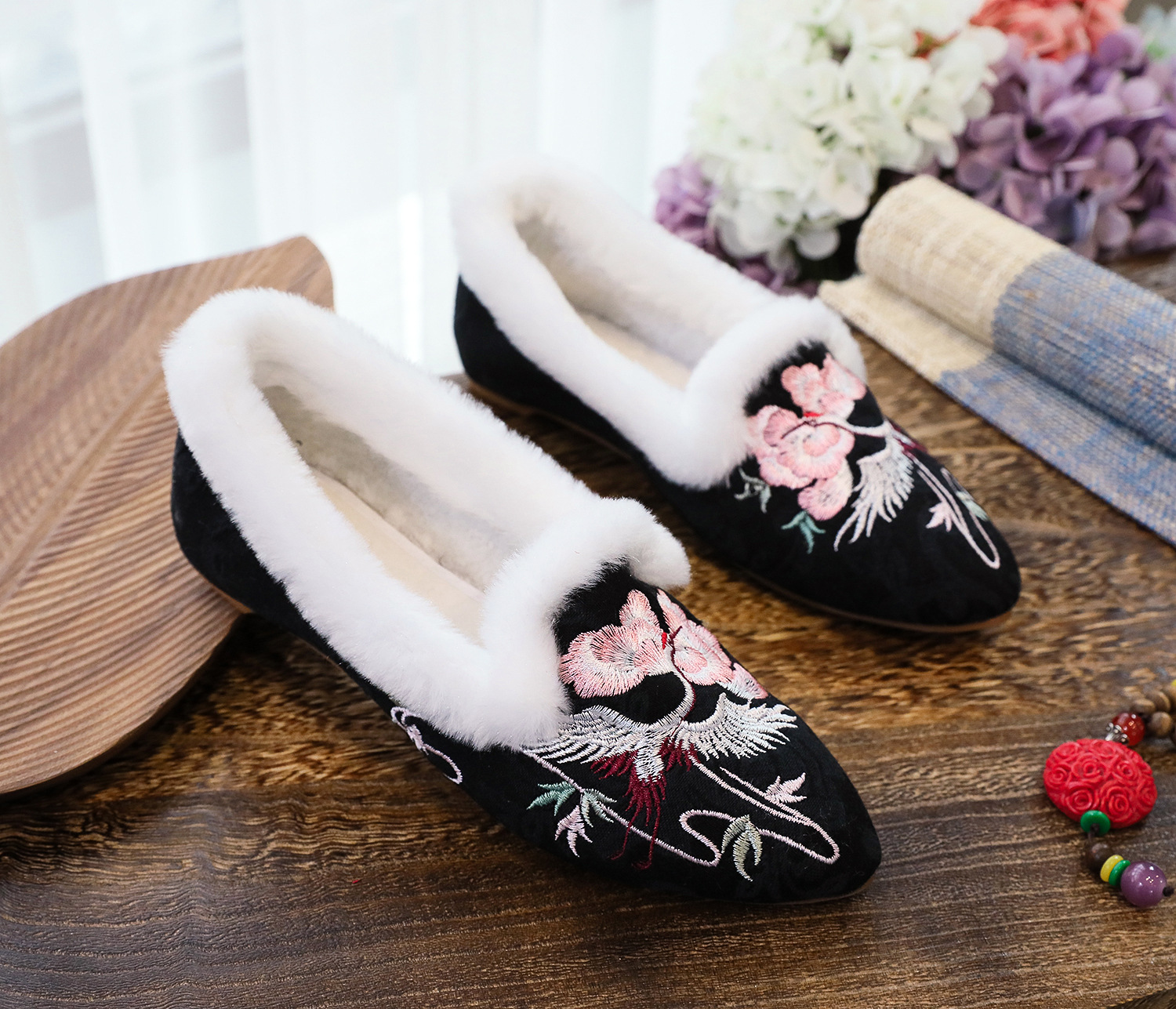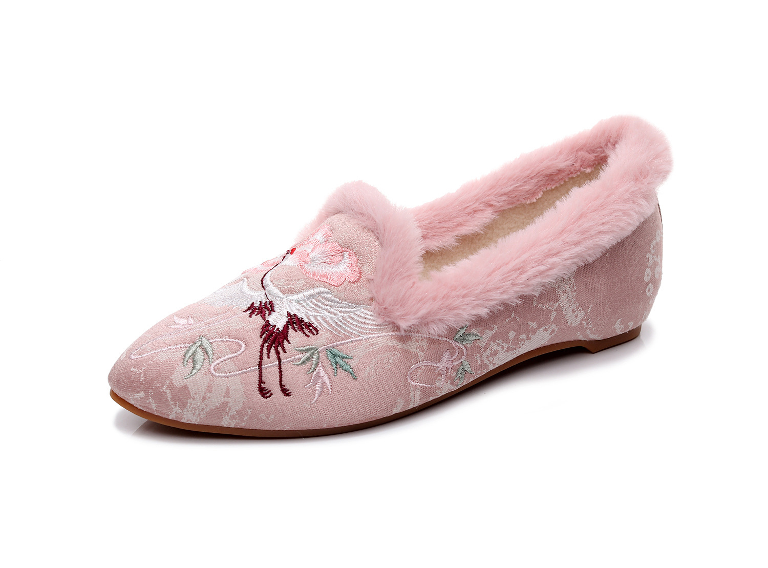 [Crane] новинки 2021 года с пушистым кантом, модная Тканевая обувь с остроконечной вышивкой, осенне-зимняя одношаговая Хлопковая женская обувь