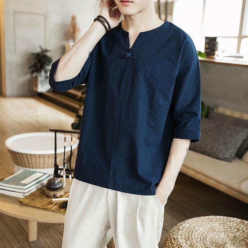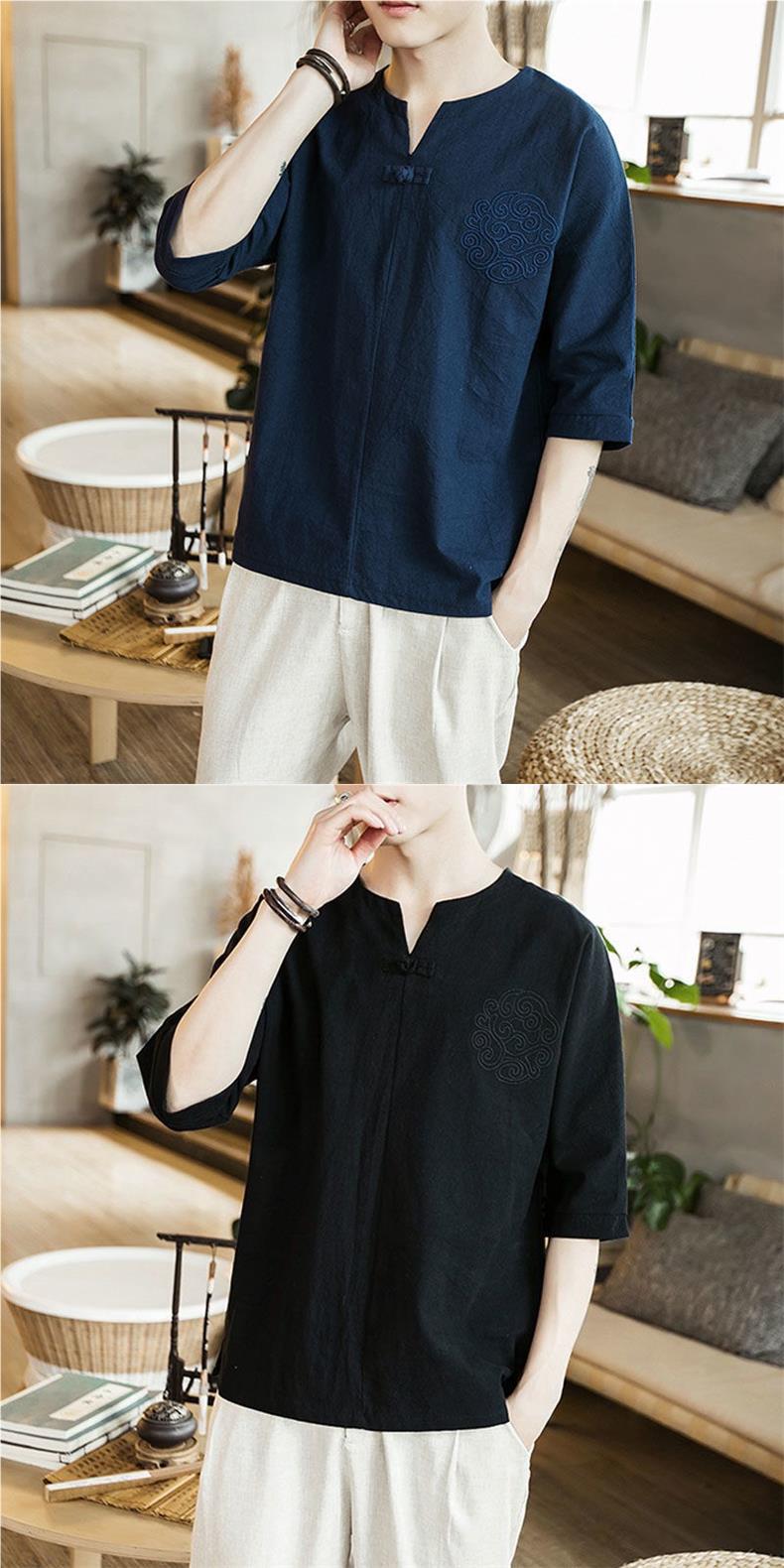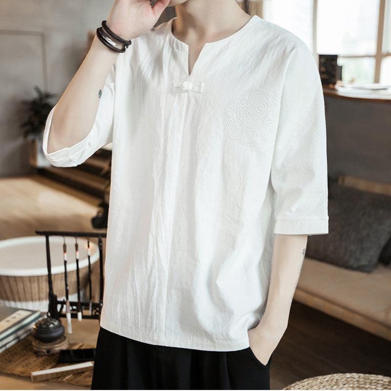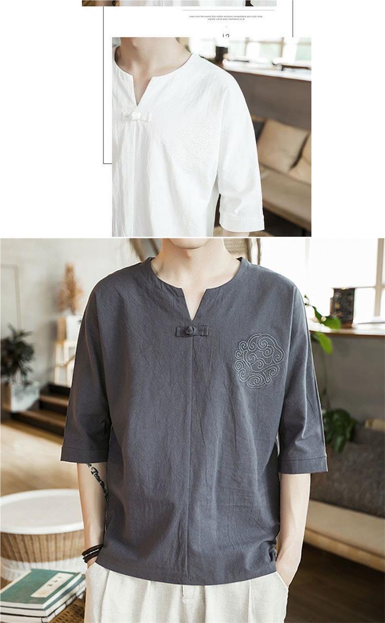 Футболка с короткими рукавами с вышивкой Tang мужской плюс толстый плюс большой размер тенденция толстяк свободный V-образный вырез с половиной рукава ретро летний китайский стиль