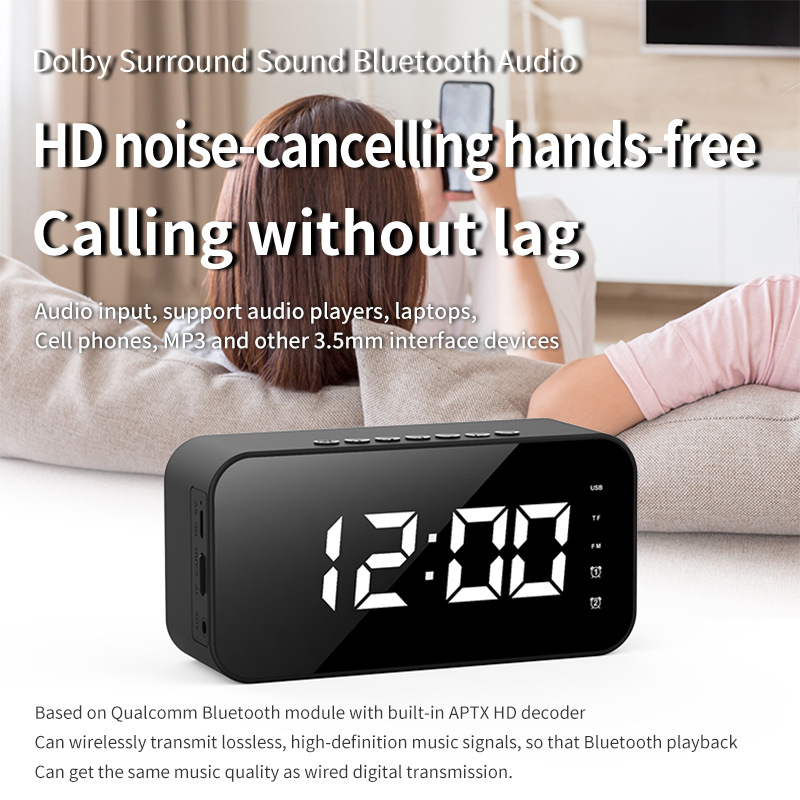 Features: mirror, Bluetooth, adjustable brightness, display clock, double alarm clock, temperature, TF card playback, payment broadcast, built-in FM radio, mobile phone call answering, AUX audio input