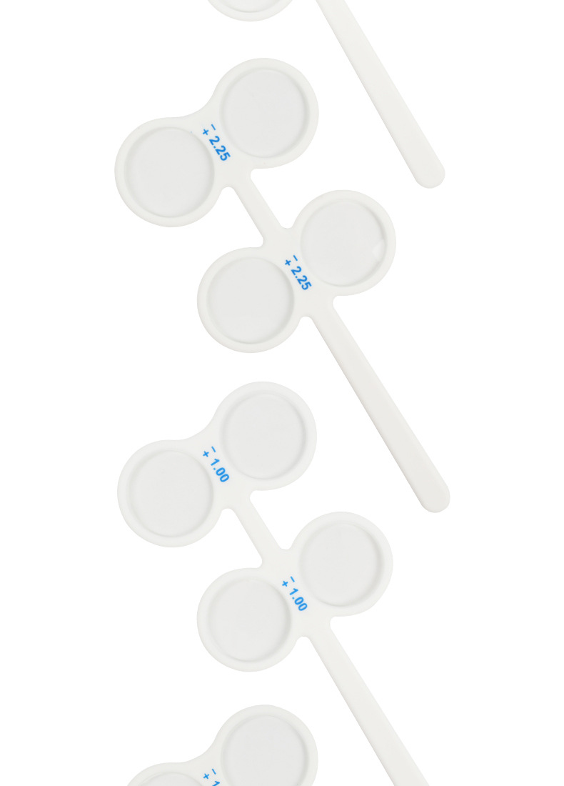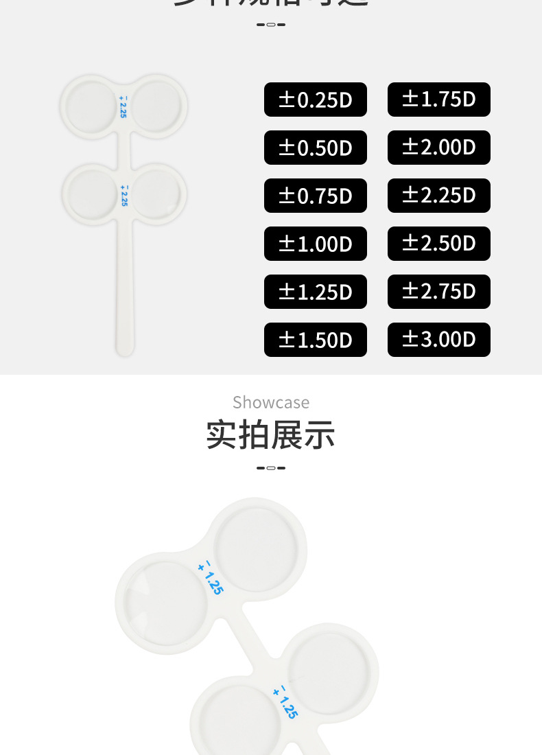 ±0.25D; ±0.50D; ±0.75D; ±1.00D; ±1.25D; ±1.50D; ±1.75D; ±2.00D; ±2.25; ±2.50; ±2.75D; ±3.00D; ±3.25; ±3.50