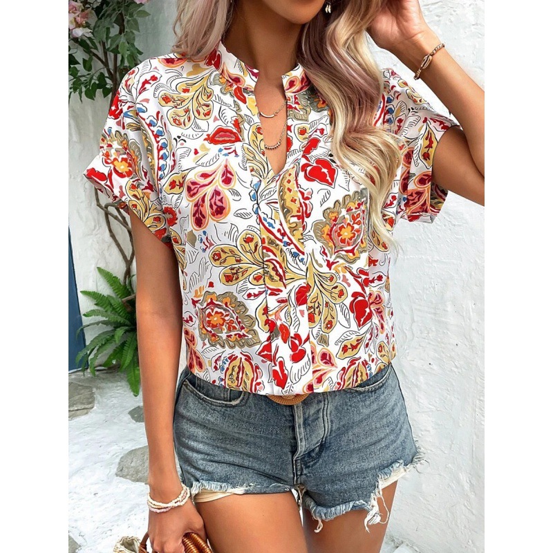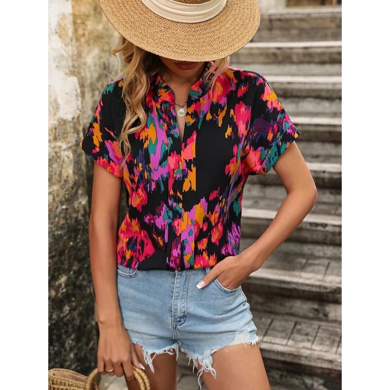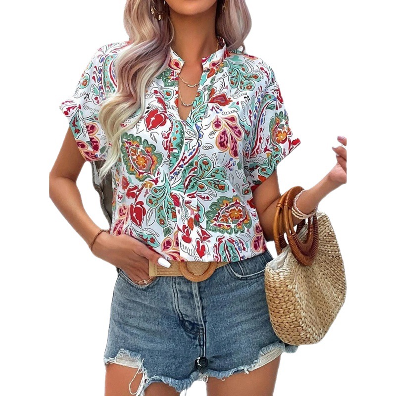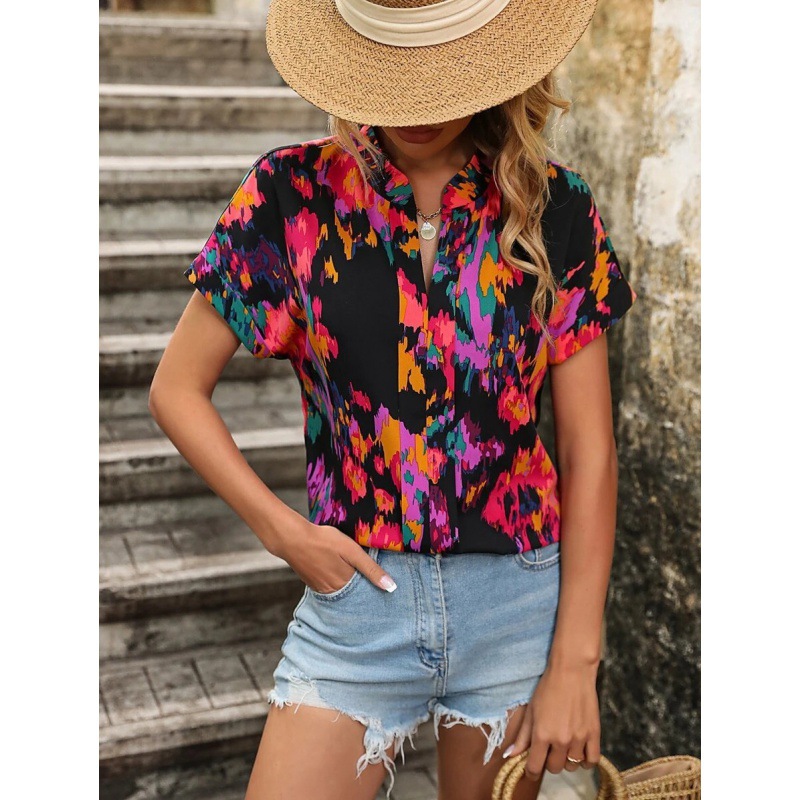 2023 Европа и Америка Amazon трансграничный Женский Летний Новый Модный женский топ с цветным принтом и V-образным вырезом и короткими рукавами