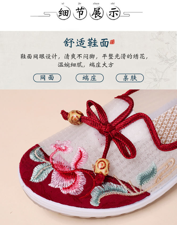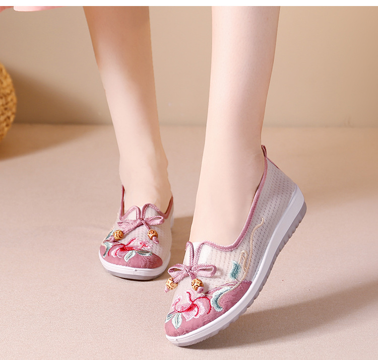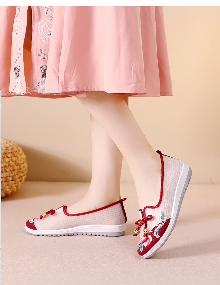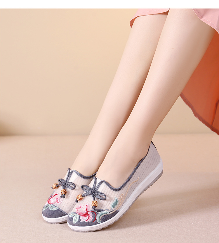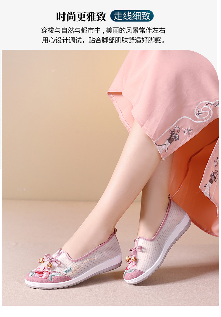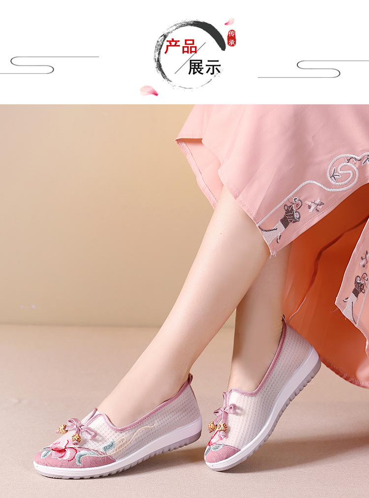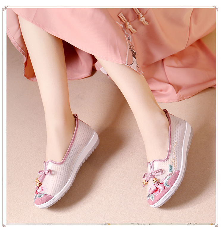 Женские летние тканевые туфли в стиле старого Пекина, дышащие сетчатые туфли для ханьфу с вышивкой, женские туфли на мягкой подошве с неглубоким вырезом и ажурным дизайном.