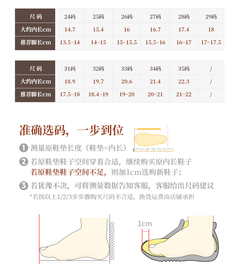 Длина в пределах 24 ярдов составляет 14,5 см (выберите размер в соответствии с рекомендацией), что подходит для длины стопы 13,5 ~ 14,1 см.; Внутренняя длина 25 ярдов составляет 15,5 см (выберите размер в соответствии с рекомендацией), что подходит для длины стопы 14,2 ~ 15,8 см.; Внутренняя длина 26 ярдов составляет 16,0 см (выберите размер в соответствии с рекомендацией), что подходит для длины стопы 14,8 ~ 15,4 см.; Длина в пределах 27 ярдов составляет 16,5 см (выберите размер в соответствии с рекомендацией), что подходит для длины стопы 15,5 ~ 16,1 см.; 28 ярдов внутренняя длина 17,5 см (Выберите размер по размеру рекомендуется) подходит для длины стопы 16,2 ~ 16,8 см; 29 ярдов внутренняя длина 18,0 см (Выберите размер по размеру рекомендуется) подходит для длины стопы 16,8 ~ 17,4 см; 30 ярдов внутренняя длина 18,5 см (в соответствии с рекомендуемыми размерами) подходит для длины стопы 17,5 ~ 18,10 см; 31 ярд внутренняя длина 19,5 см (Выберите размер по размеру рекомендуется) подходит для длины стопы 18,2 ~ 18,8 см; 32 ярда внутренняя длина 20,0 см (Выберите размер по размеру рекомендуется) подходит для длины стопы 18,8 ~ 19,4 см; 33 ярда внутренняя длина 20,5 см (Выберите размер по размеру рекомендуется) подходит для длины стопы 19,5 ~ 20,1 см; 34 ярда внутренняя длина 21,5 см (в соответствии с рекомендуемыми размерами) подходит для длины стопы 20,2 ~ 20,8 см; 35 ярдов внутренняя длина 22,0 см (в соответствии с рекомендуемым размером) подходит для длины стопы 20,8 ~ 21,4 см