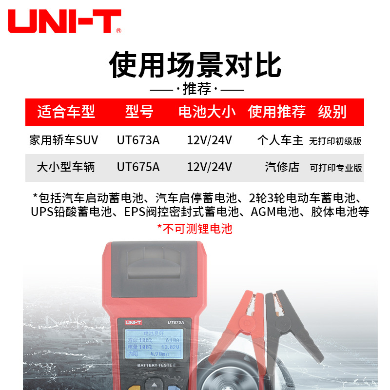 UT673A (электромобиль 12V/24V + автомобильный аккумулятор); UT675A [Печать] (автомобильный аккумулятор 12 В/24 В); UT677A [профессиональный] (можно измерить литиевую батарею электромобиля)