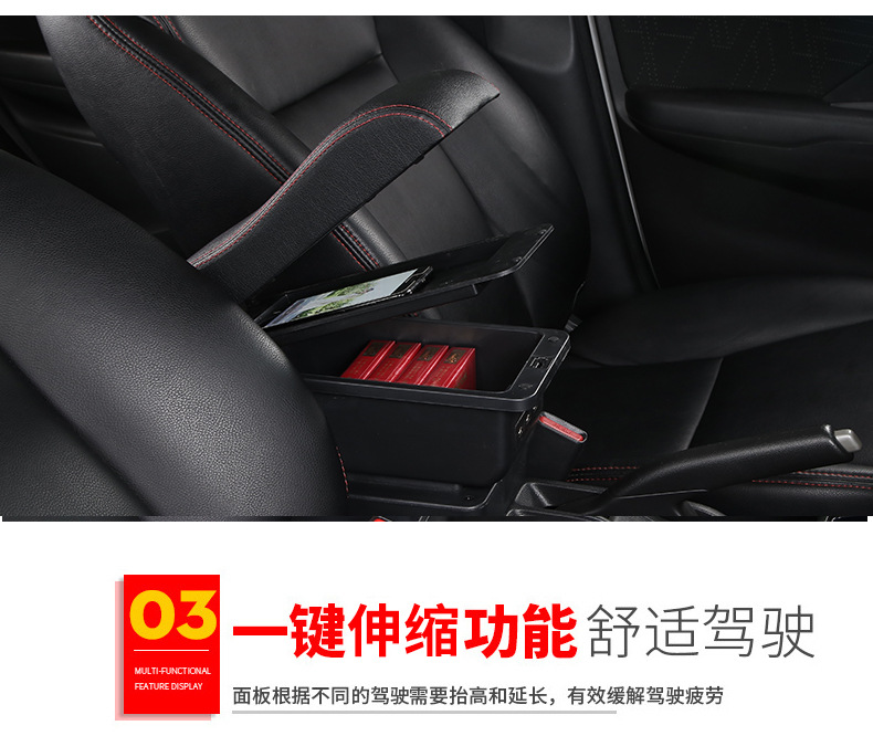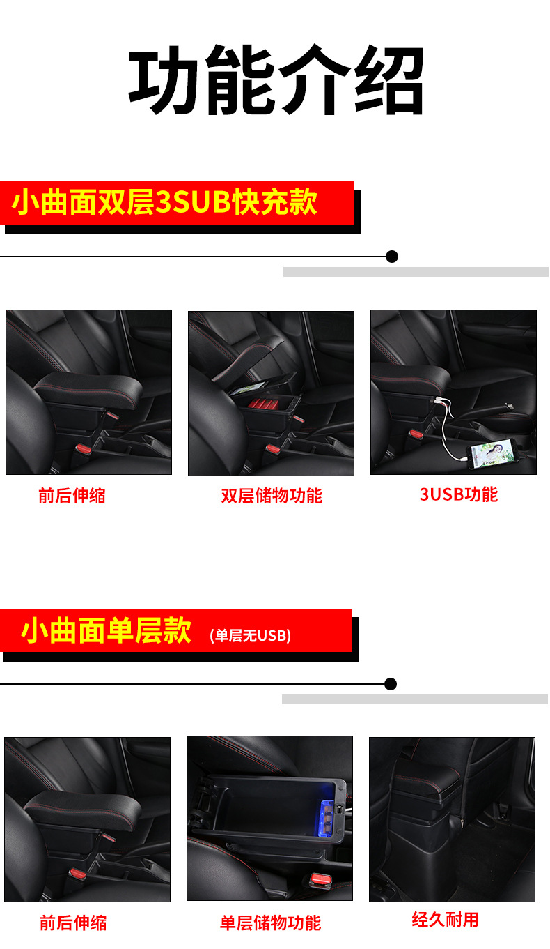 【产品特点】:本产品简约创意、设计独特、大容量收纳空间,适用于各类汽车原车没有中控扶手箱安装使用。主要功能为缓解胳膊疲劳,杂