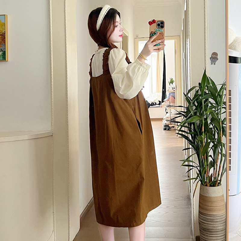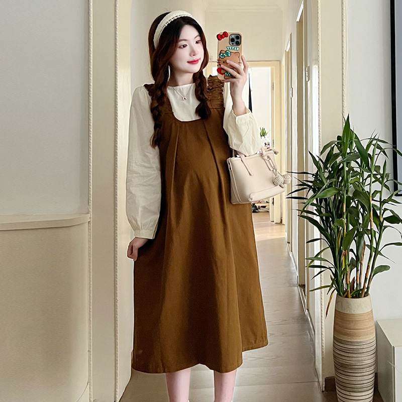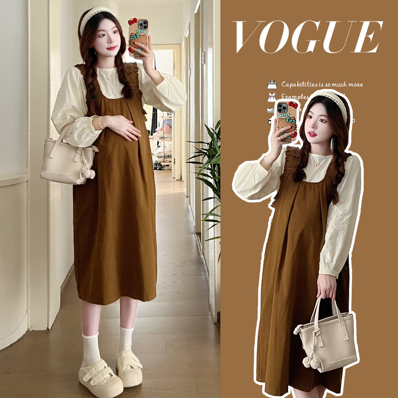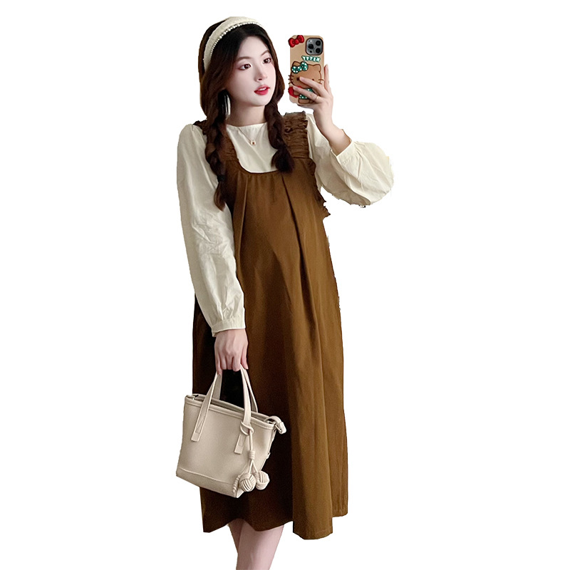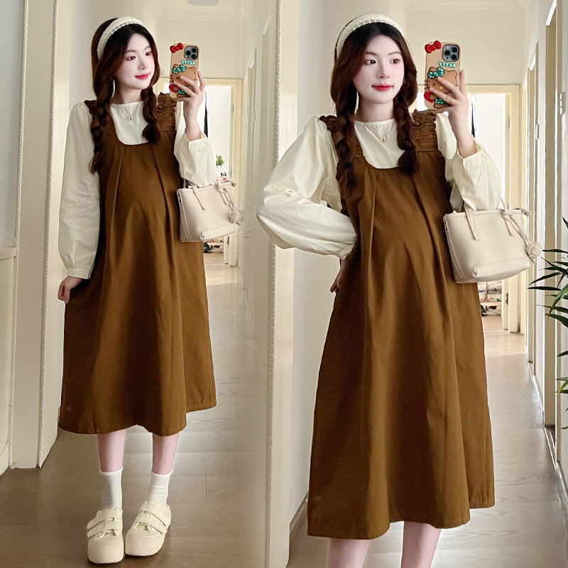 Реальный выстрел в наличии 2023 Осенняя Свободная рубашка с круглым вырезом и длинными рукавами с юбкой на ремешке Корейское платье для беременных из двух частей