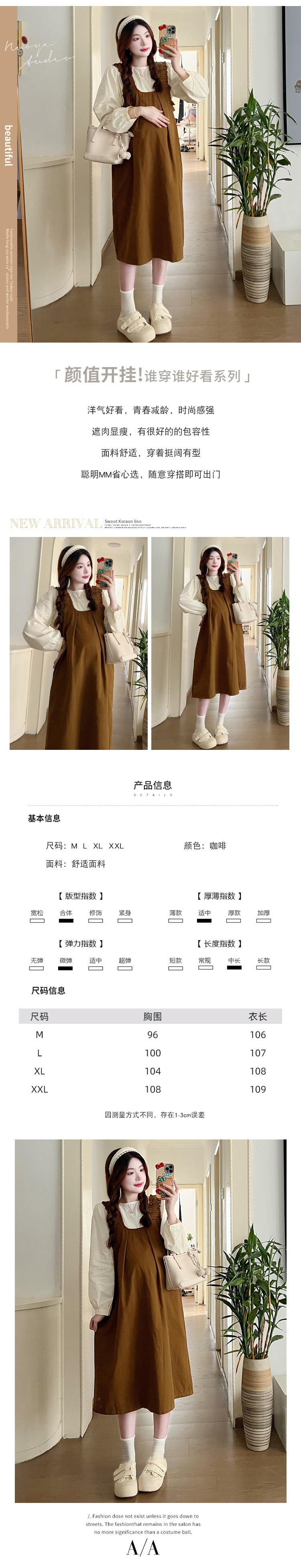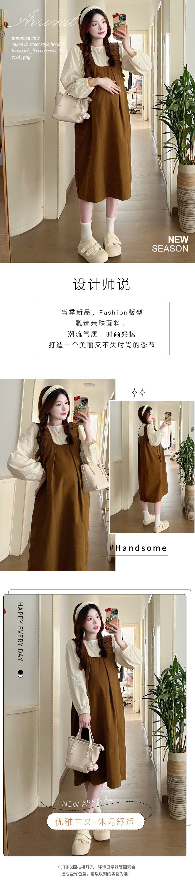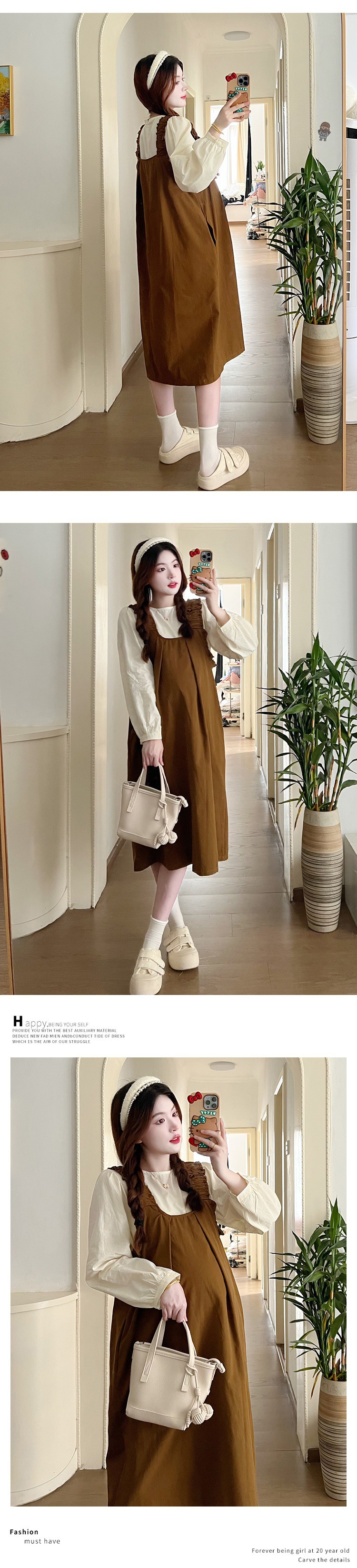 Реальный выстрел в наличии 2023 Осенняя Свободная рубашка с круглым вырезом и длинными рукавами с юбкой на ремешке Корейское платье для беременных из двух частей