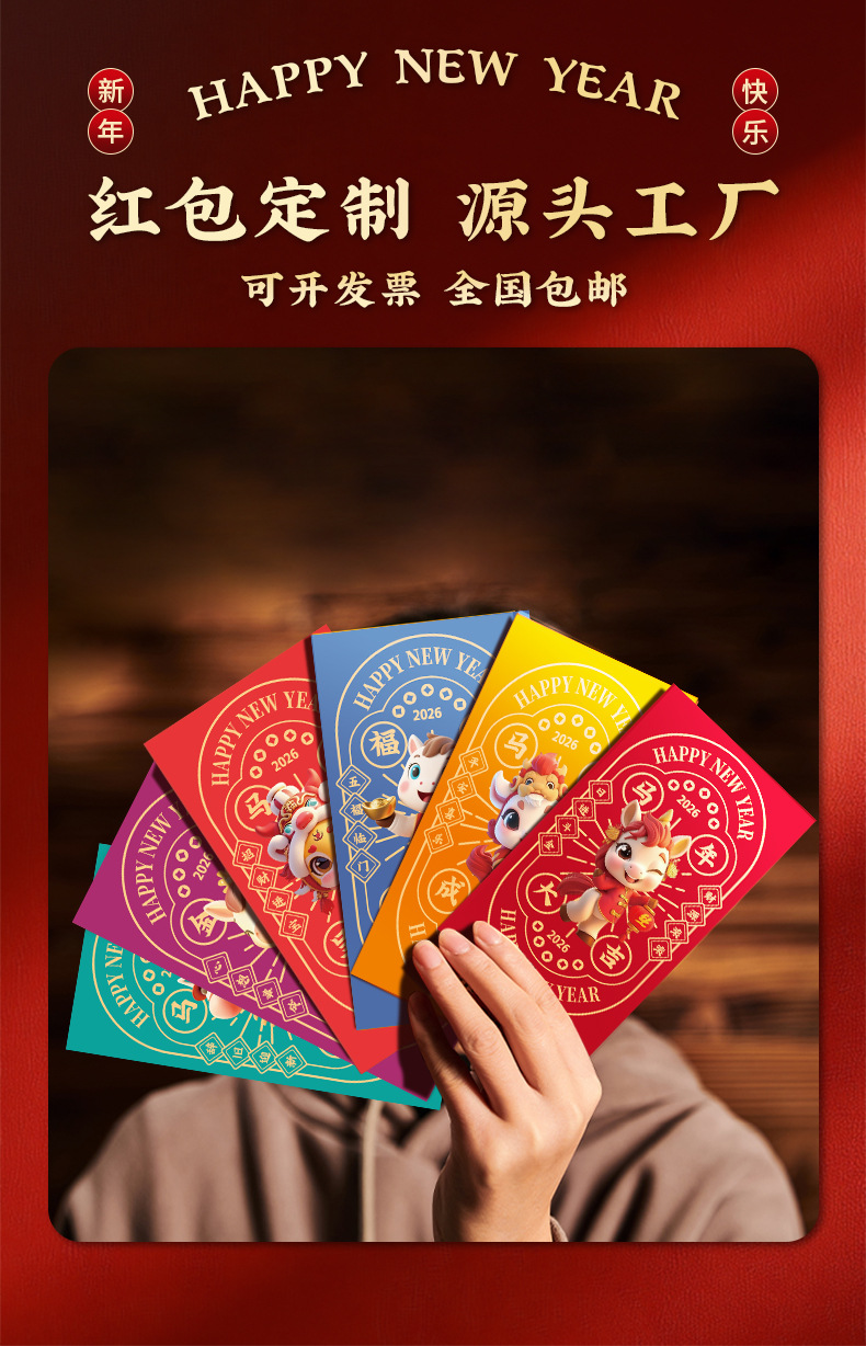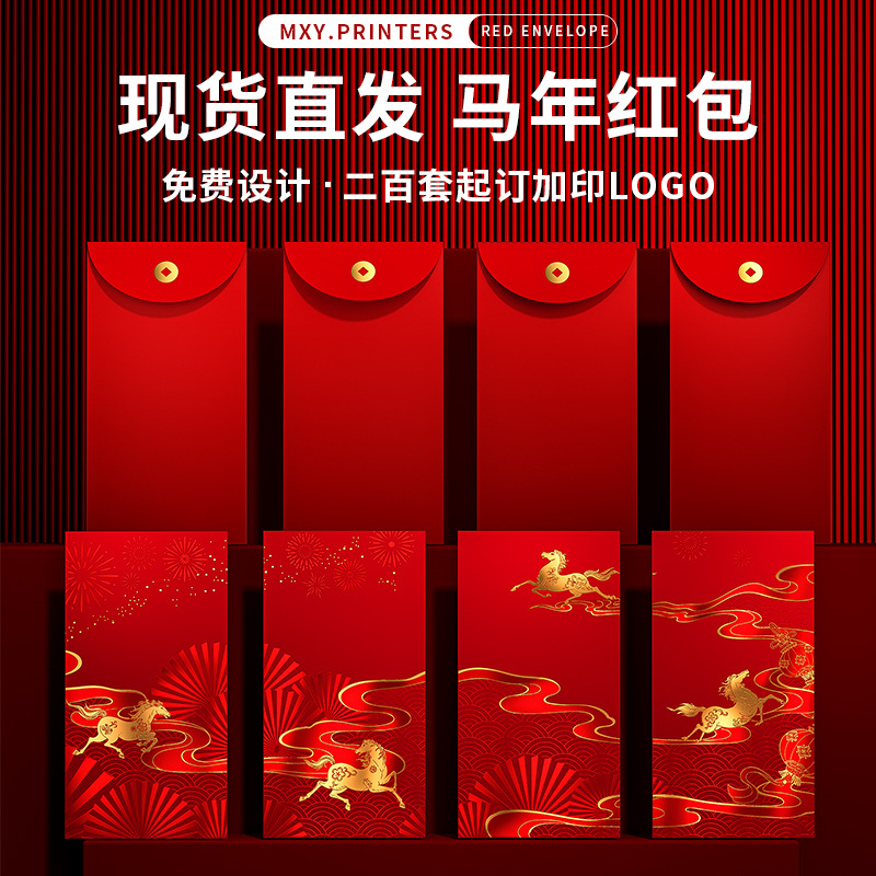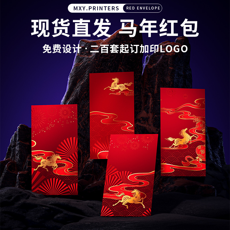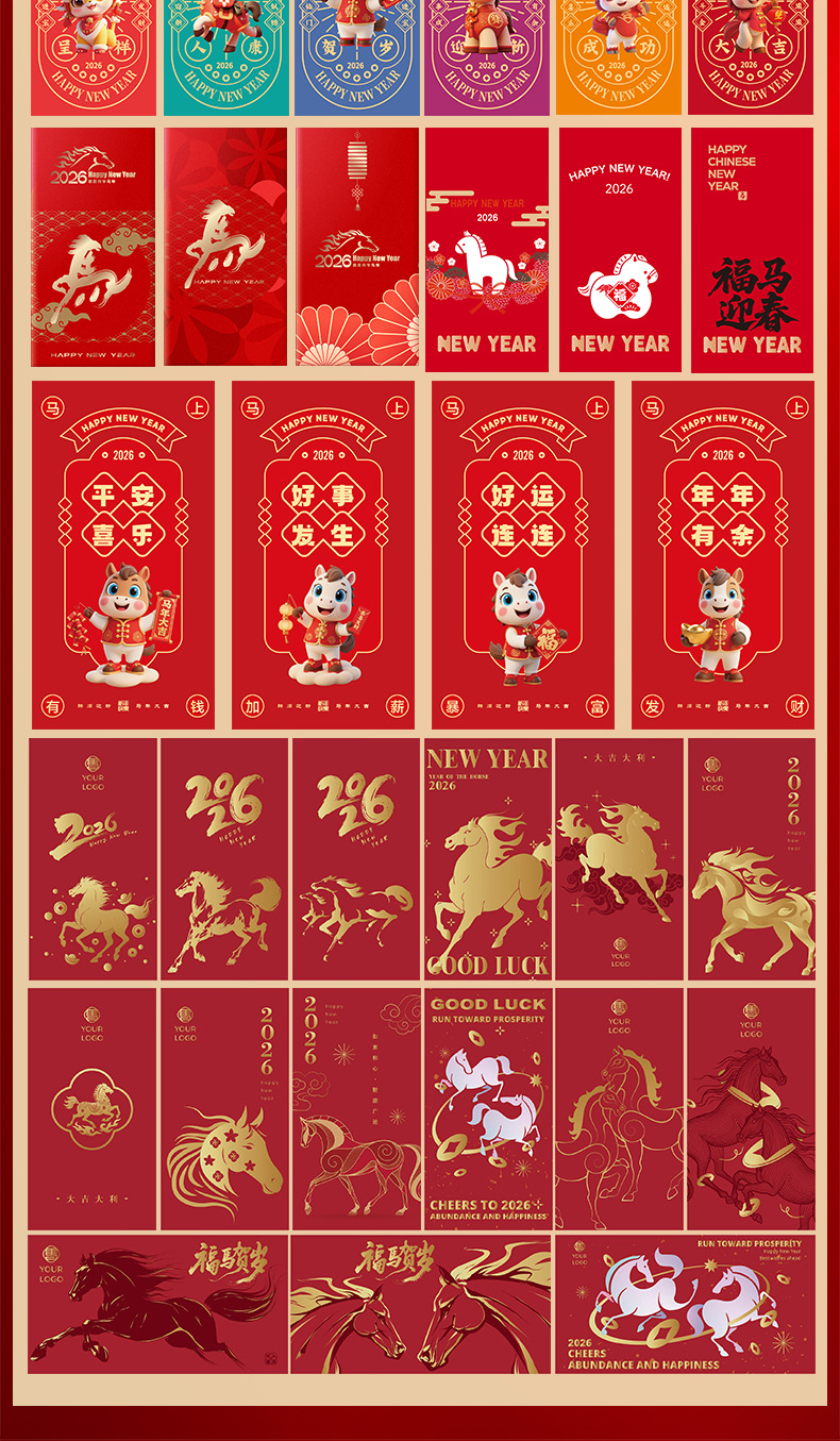 Новогодние конверты 2026 года (Год Лошади) с индивидуальным дизайном, персонализированные, с золотым тиснением, рекламным логотипом и QR-кодом.