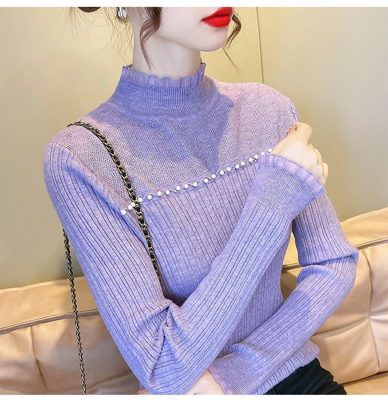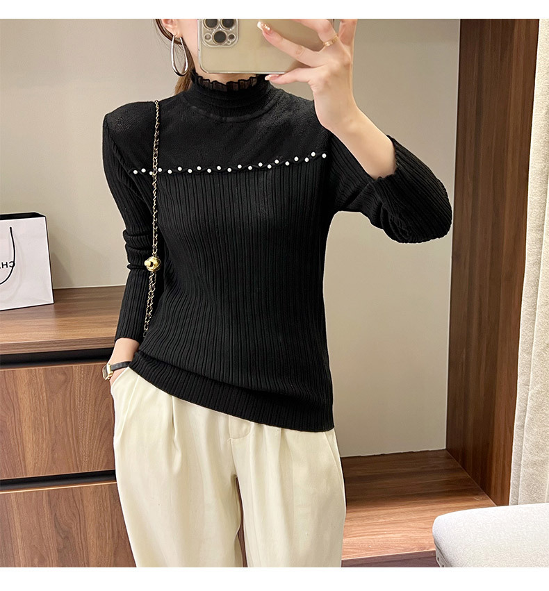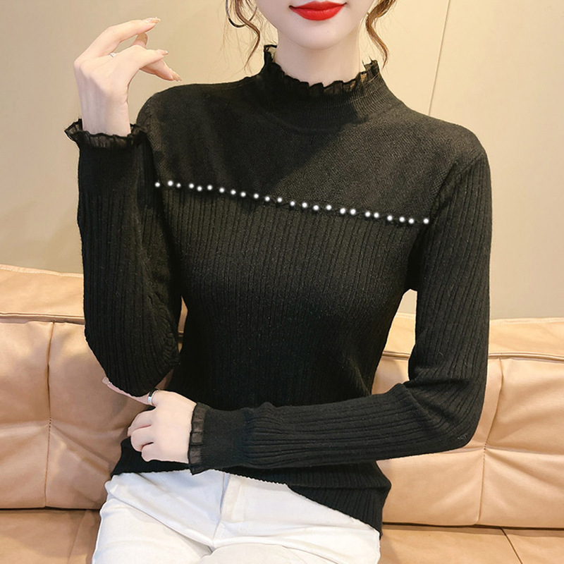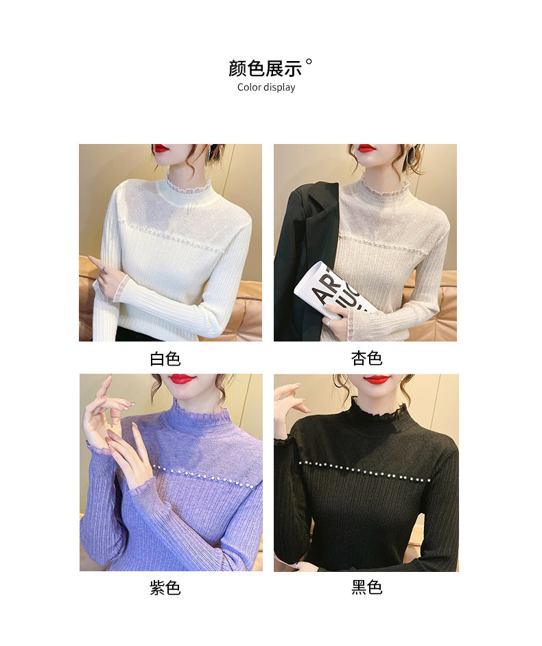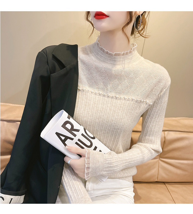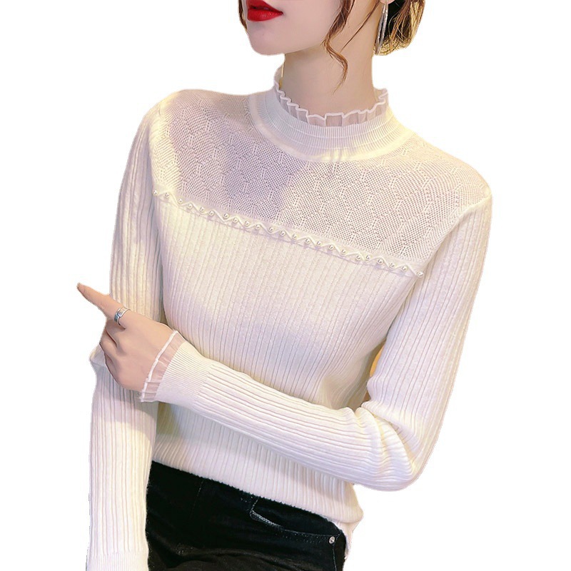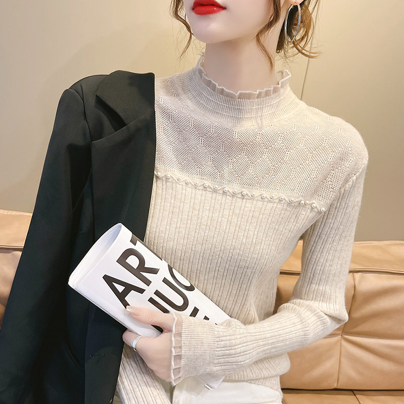 Женский кружевной свитер с высоким воротом в Корейском стиле, расшитый бисером, новый приталенный внутренний топ, вязаная нижняя рубашка в западном стиле