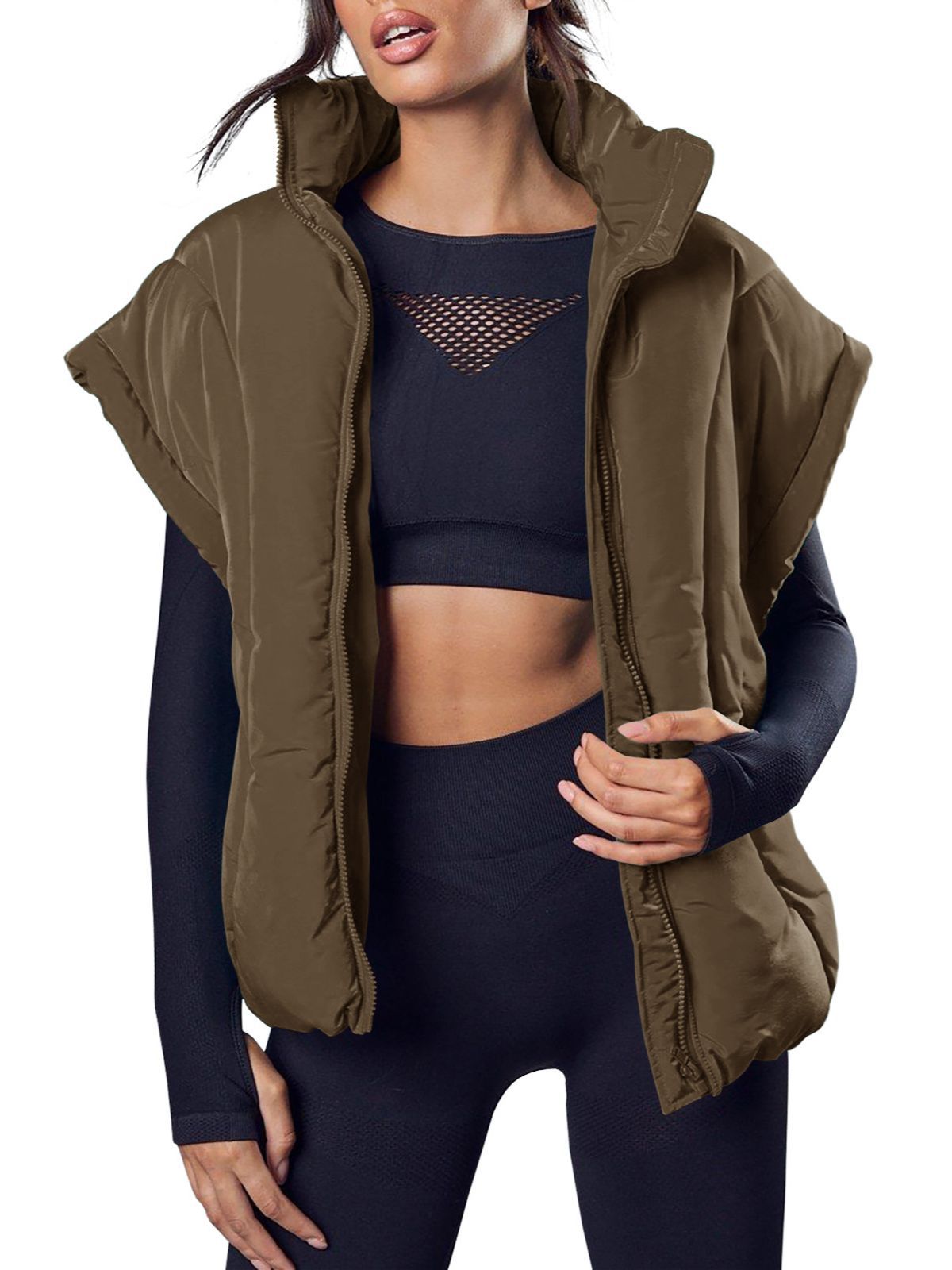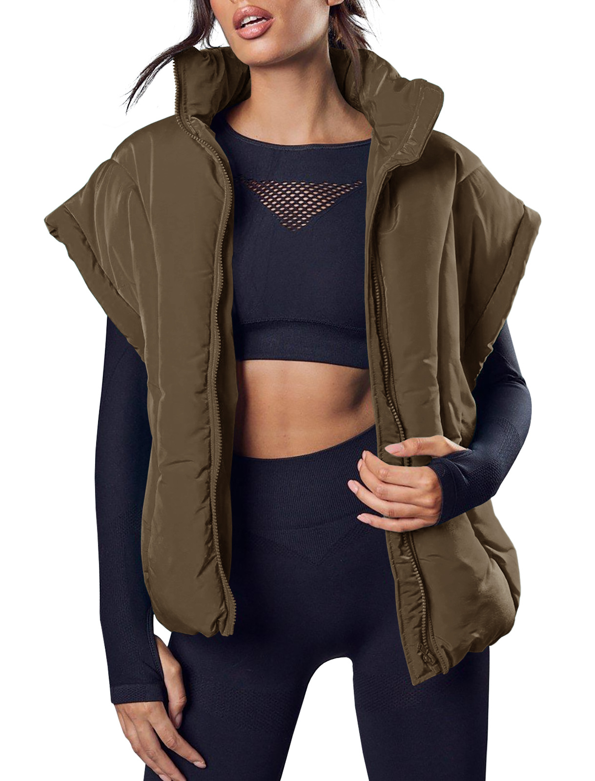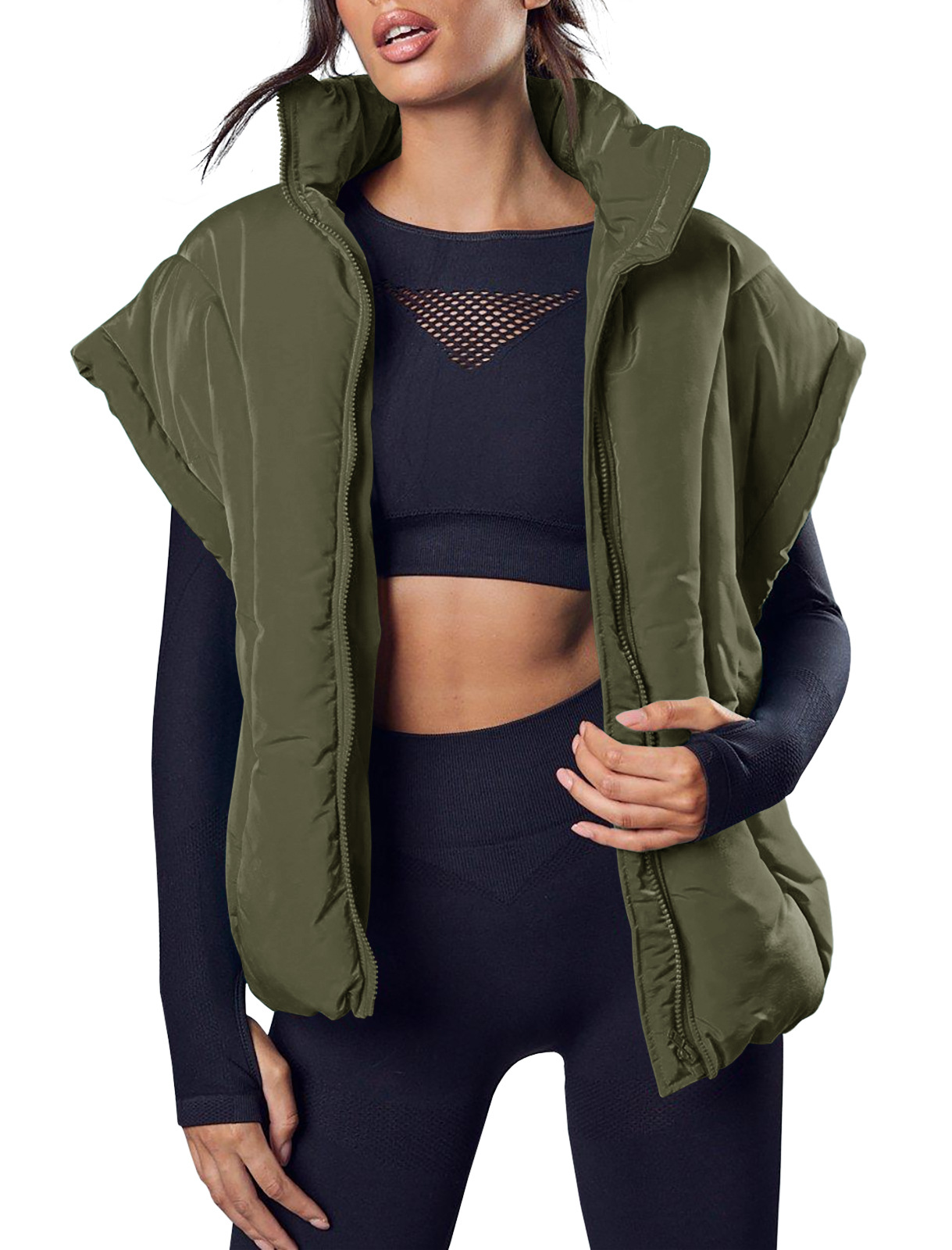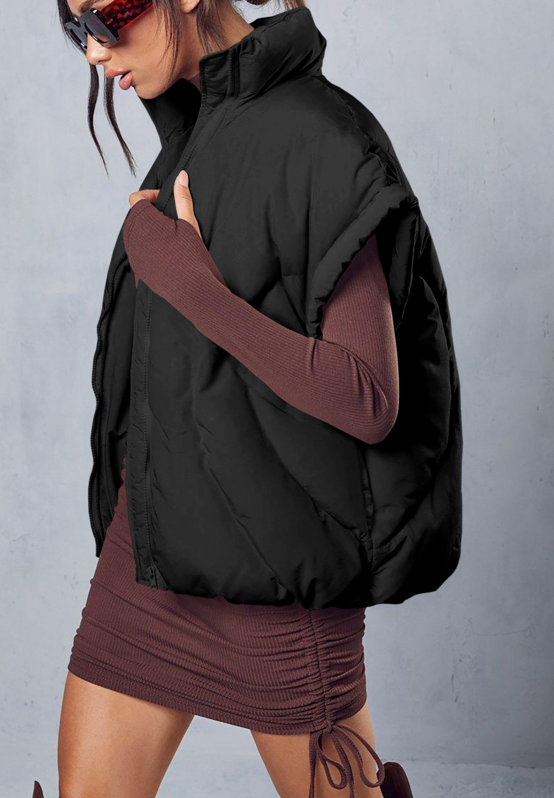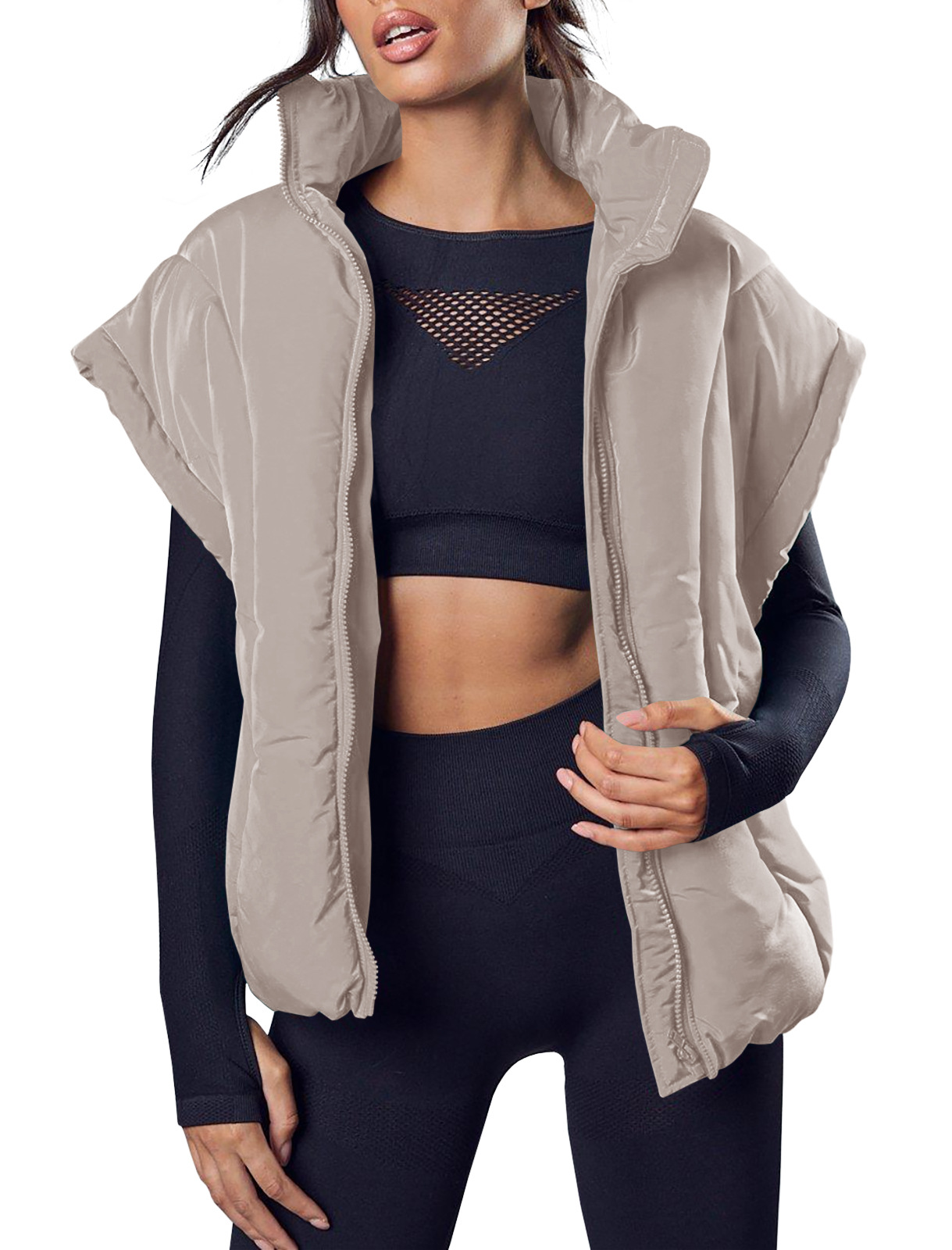 跨境欧美秋冬新款女装潮纯色拉链时尚棉服马甲时尚立领面包服外套,重量:456-535克
