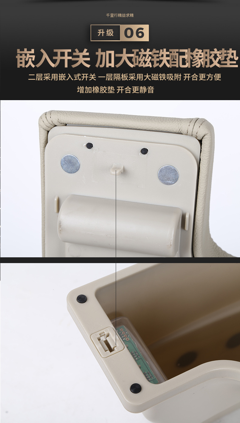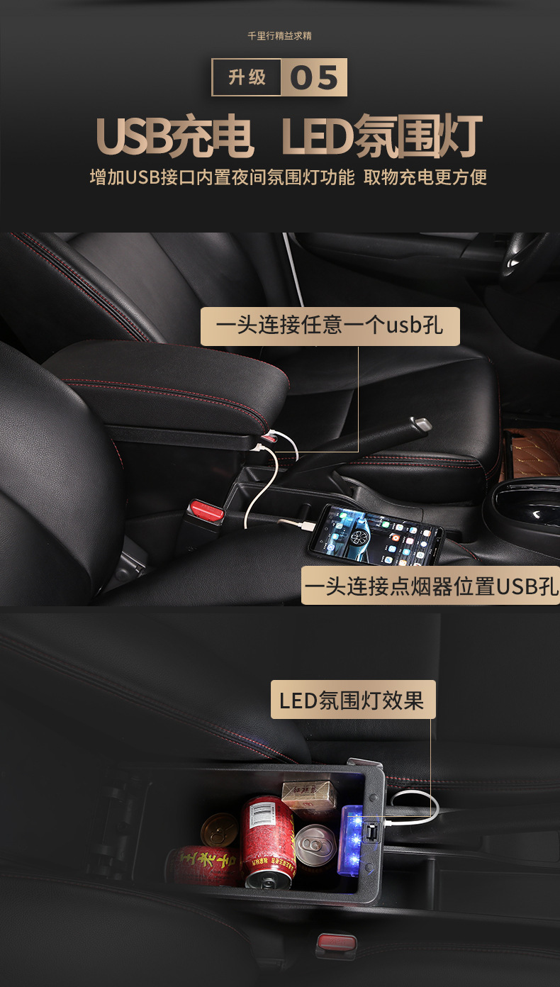 【产品特点】:本产品简约创意、设计独特、大容量收纳空间,适用于各类汽车原车没有中控扶手箱安装使用。主要功能为缓解胳膊疲劳,杂物收纳,保持车内整洁有序,增强坐车时的舒适体感,兼具USB供电和水杯架等功能。