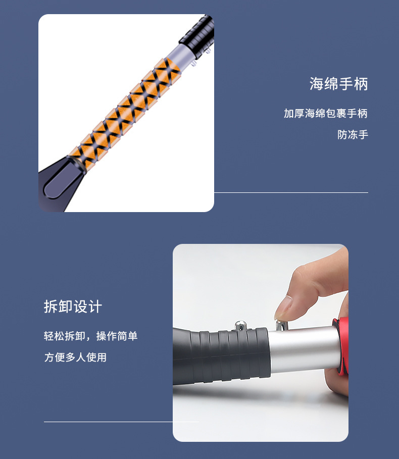 ●手柄设计:采用EVA泡沫,柔软性好富有弹性,抗老化,冬天使用防裂、不冰手,贴合手指的凹槽设计拿捏起来更加的舒适,手柄里面是优质的铝杆,强度高,韧性好
