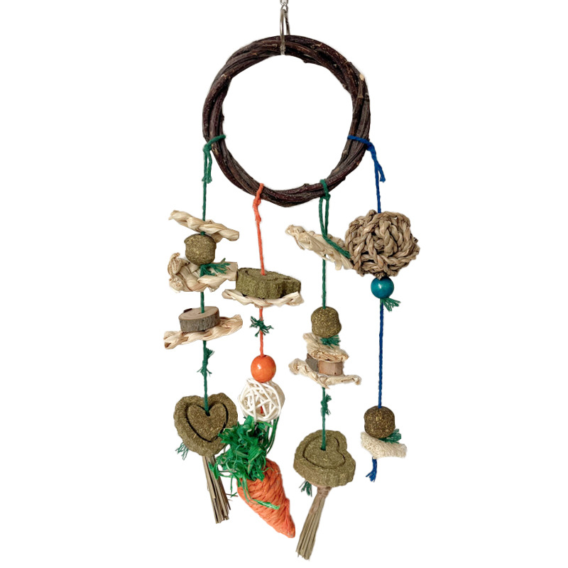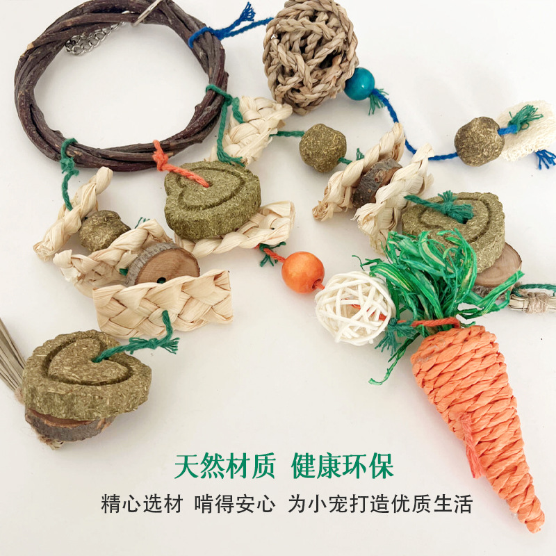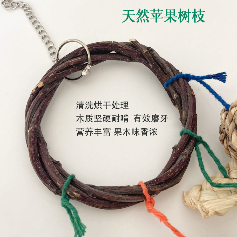 材质说明:天然苹果树枝编织环(直径10cm左右)、苜蓿草饼、苹果木片、水草球、玉米皮、纸绳萝卜、水草