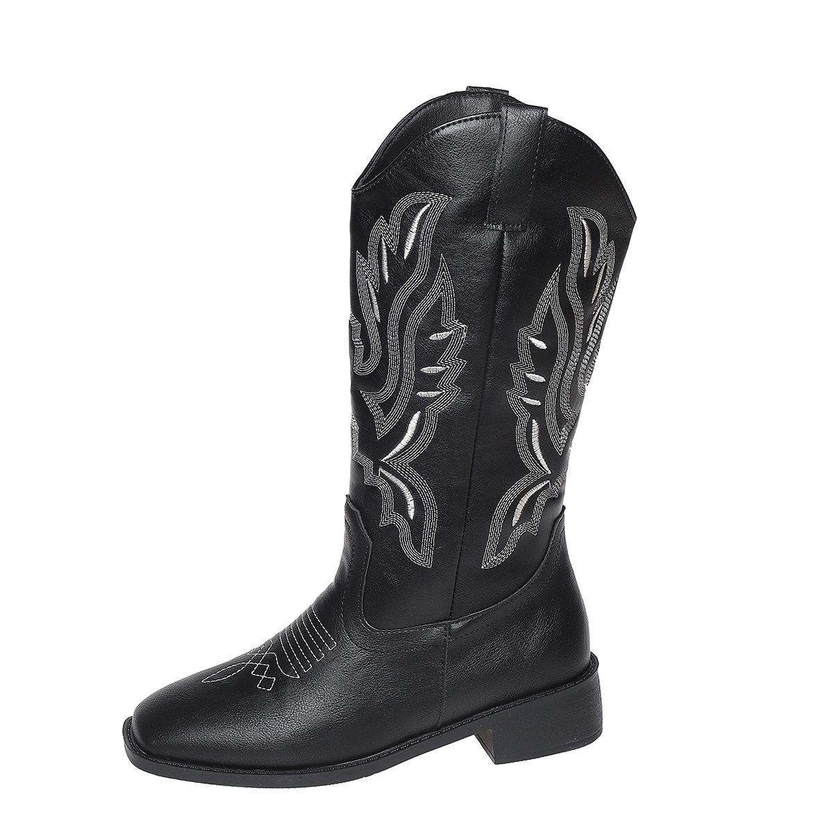 Новые женские ковбойские сапоги для внешней торговли 2023 года, ретро-сапоги с вышивкой в стиле рыцарских, с квадратным носком, на массивном каблуке, с V-образным вырезом, до середины икры.