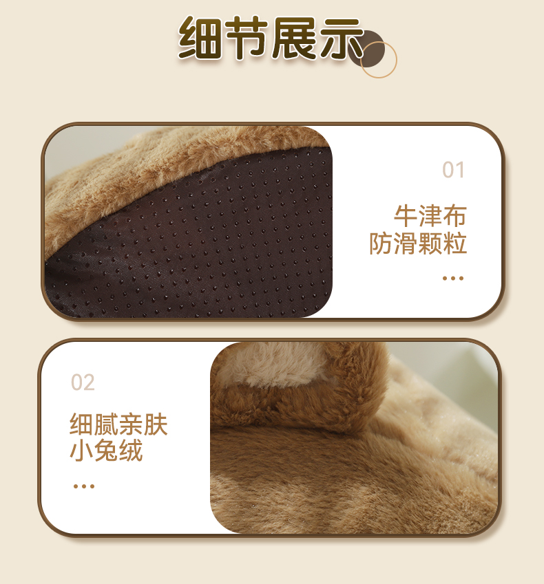 【成分】:小兔绒+2.0厚海绵+三维PP棉/PP棉+兔毛绒