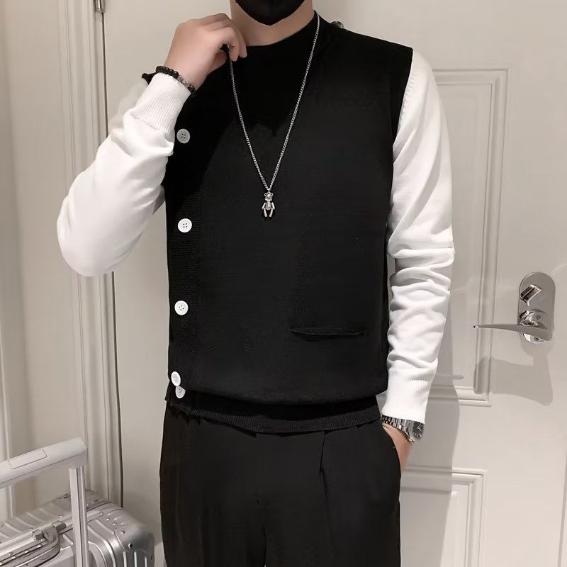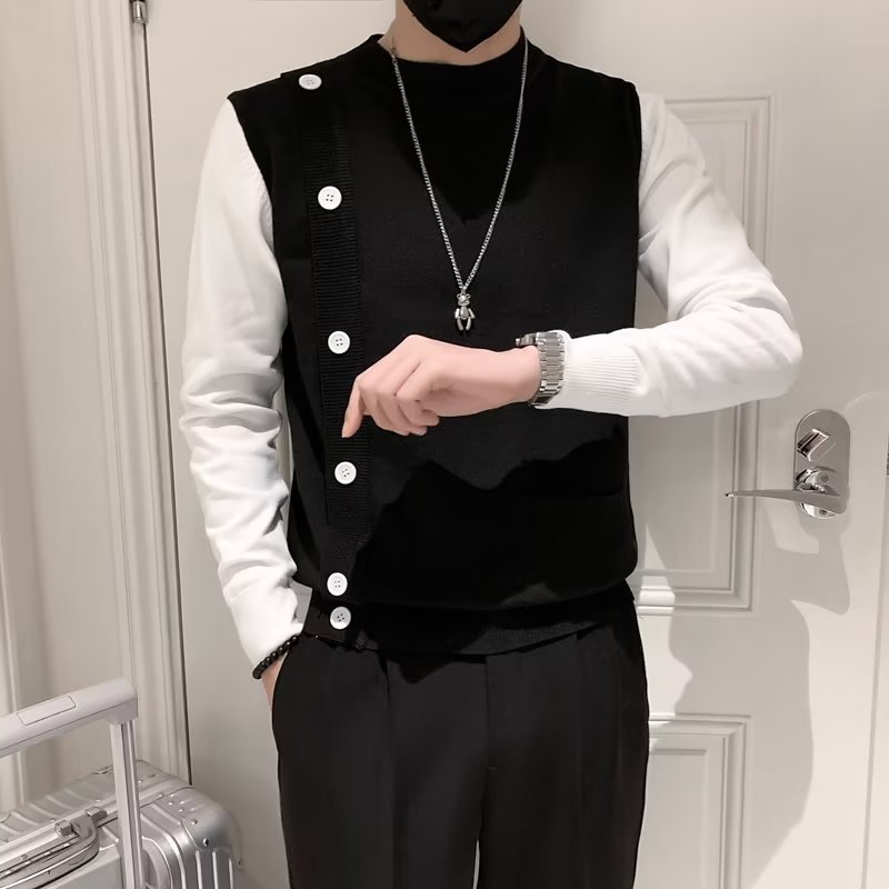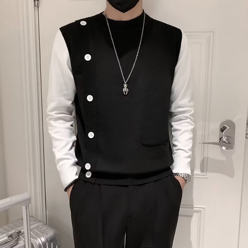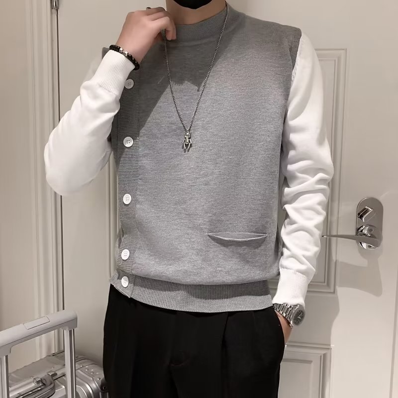Свитер-обманка из двух частей, Мужской приталенный Повседневный Прохладный свитер высокого класса в Корейском стиле, модный вязаный свитер с воротником до локтя, Отстроченный на осень и зиму