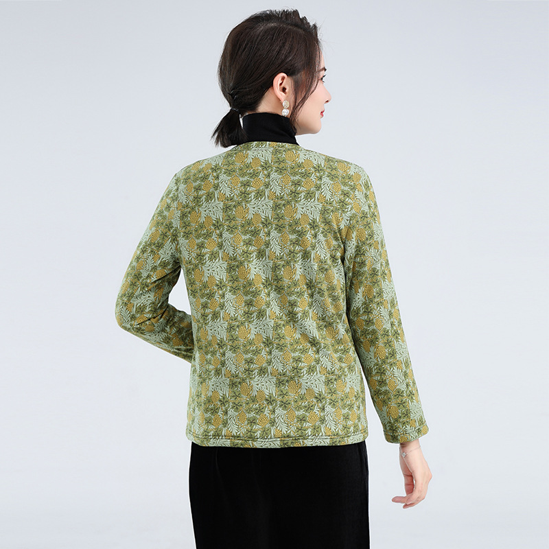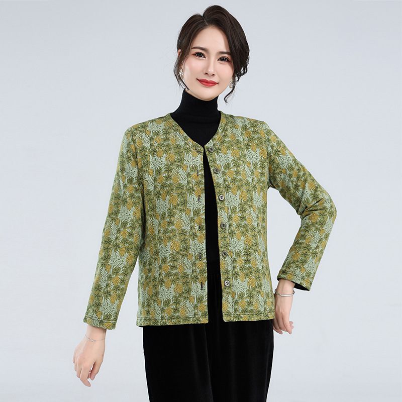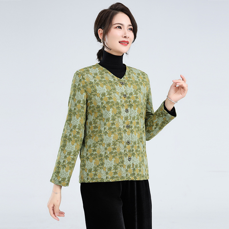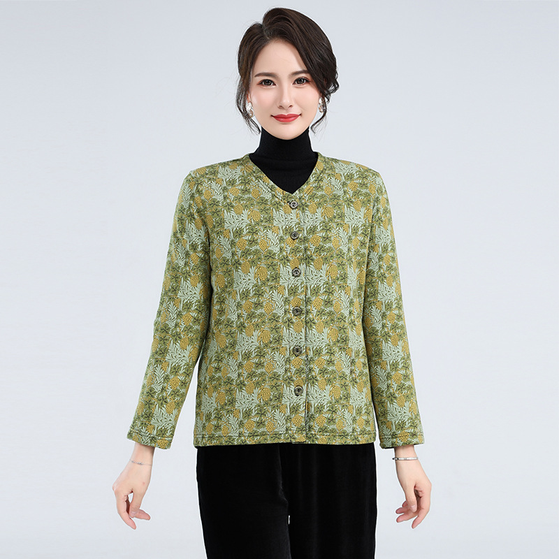 2023 Новое осенне-зимнее пальто для мам в западном стиле, женская одежда среднего и пожилого возраста, теплое вязаное хлопковое пальто с цветочным принтом и V-образным вырезом