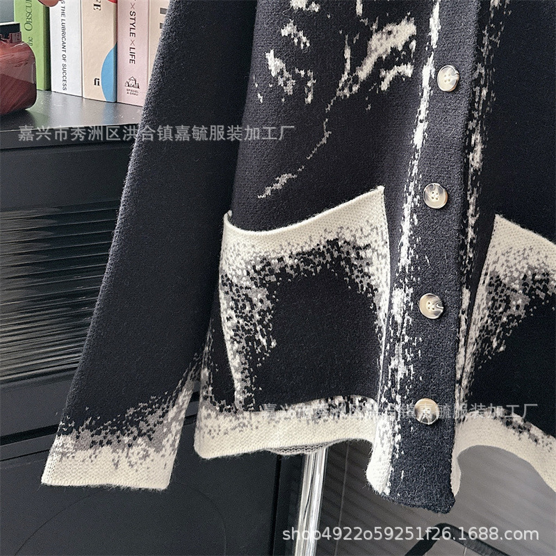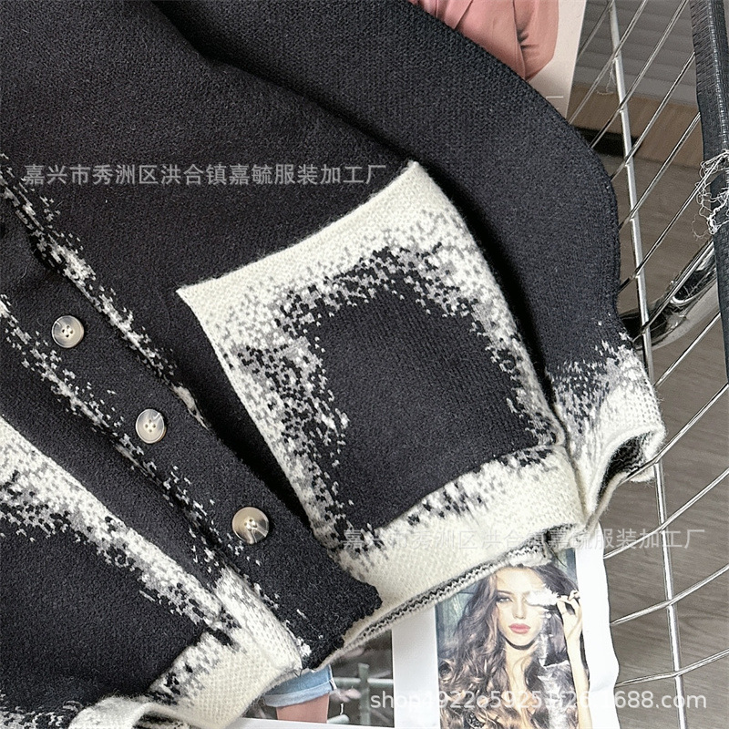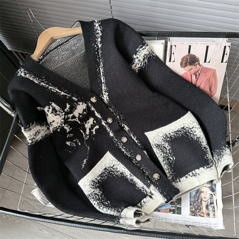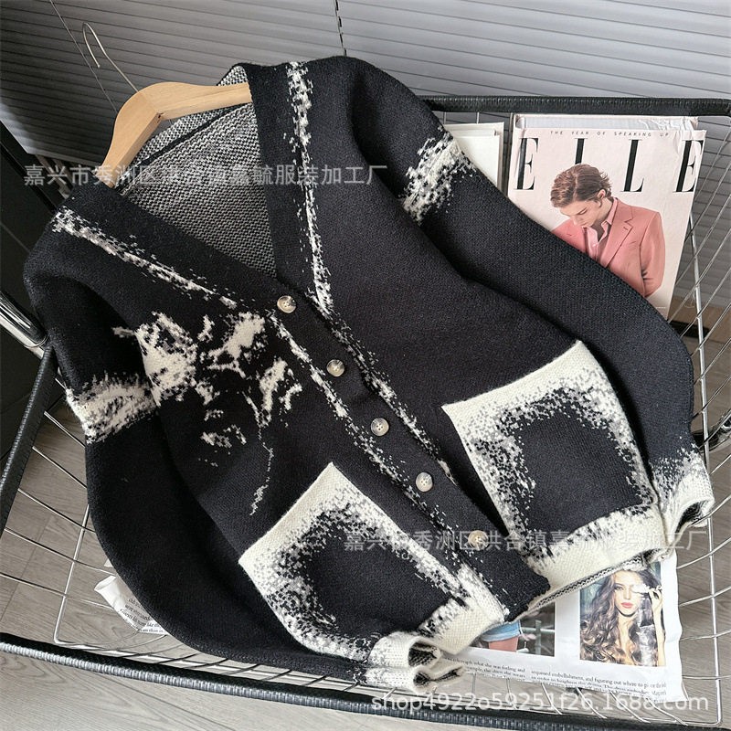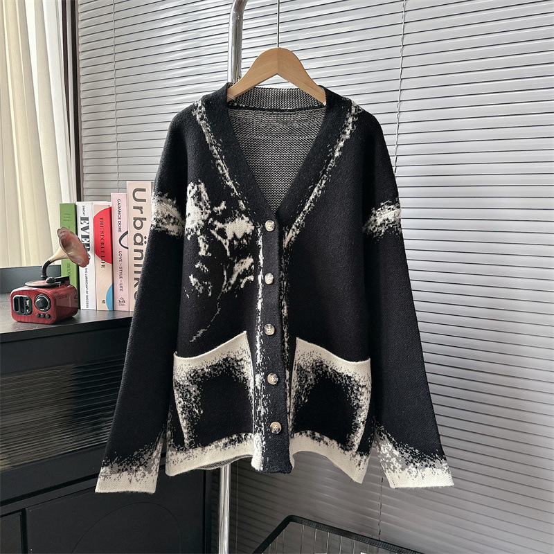 Уникальный дизайн, черно-белый вязаный кардиган с розами для женщин, новинка осени-зимы 2024, утолщенный свитер-жакет в стиле «ленивый шик».