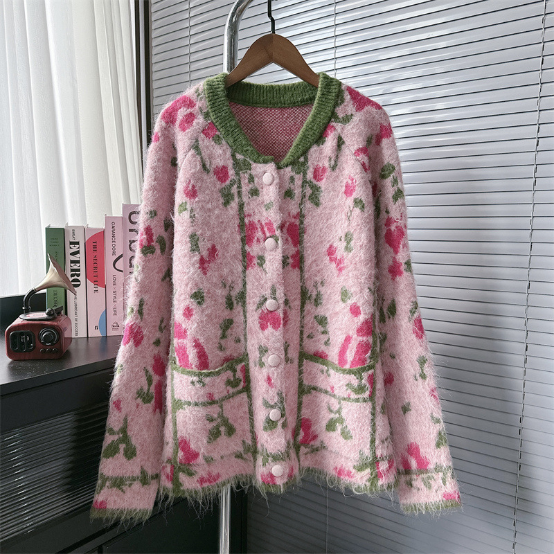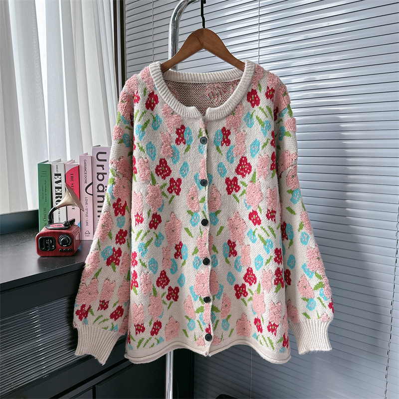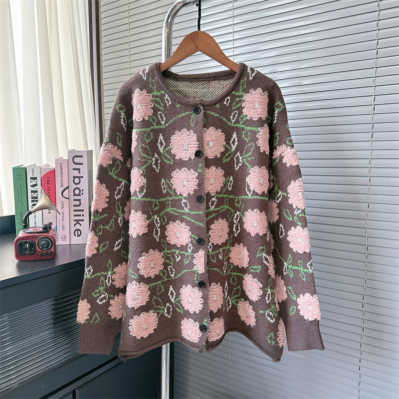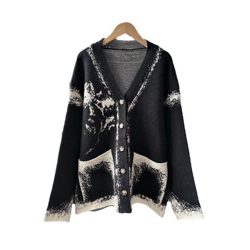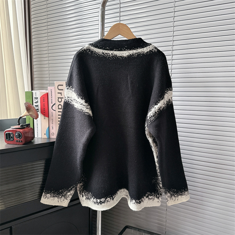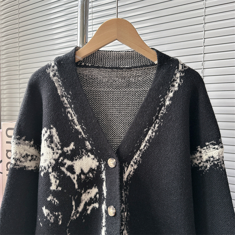 Уникальный дизайн, черно-белый вязаный кардиган с розами для женщин, новинка осени-зимы 2024, утолщенный свитер-жакет в стиле «ленивый шик».
