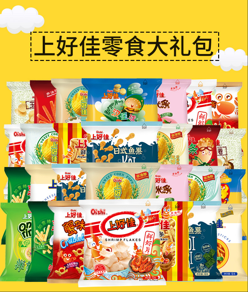 上好佳多品5g、6g、8g,款式为5连包,建议按50的倍数下单。