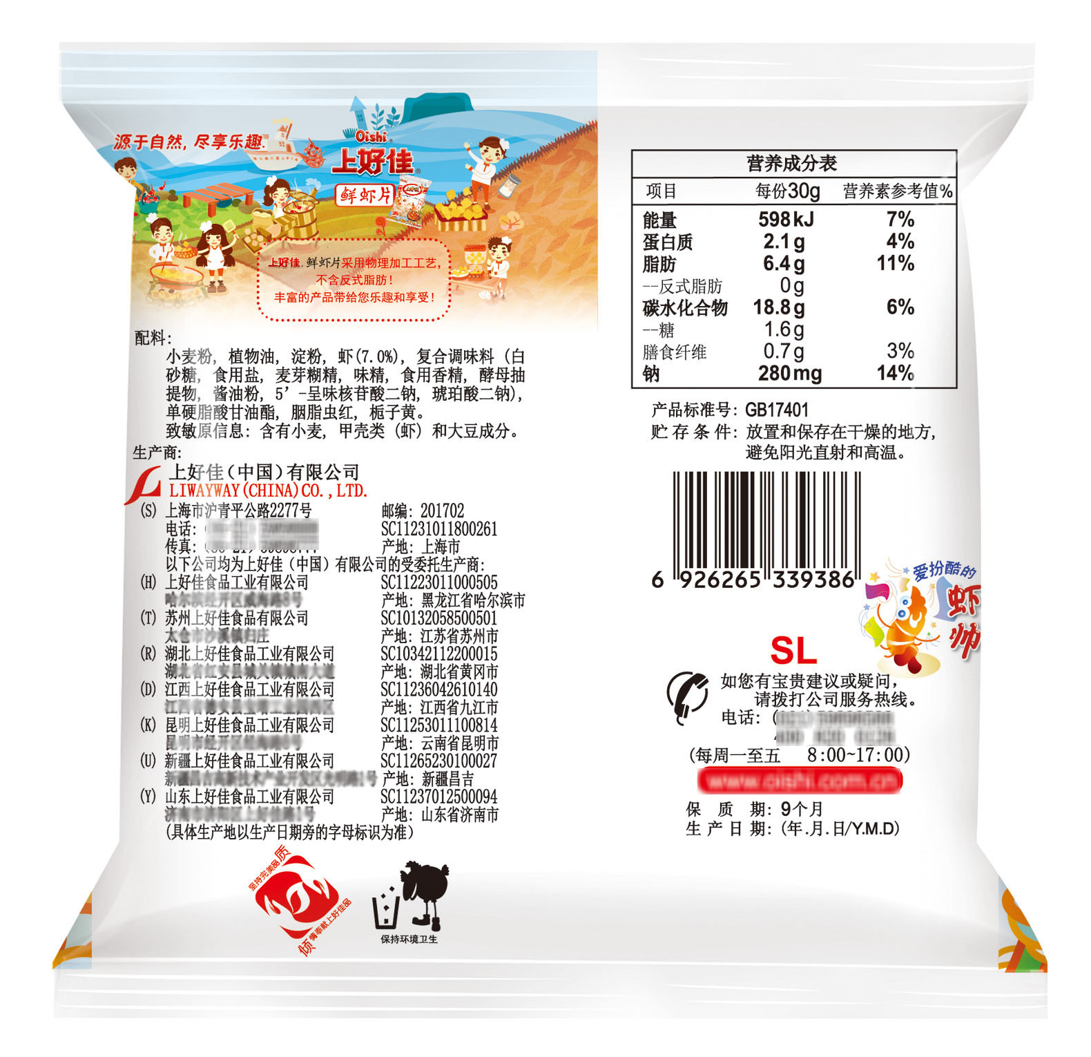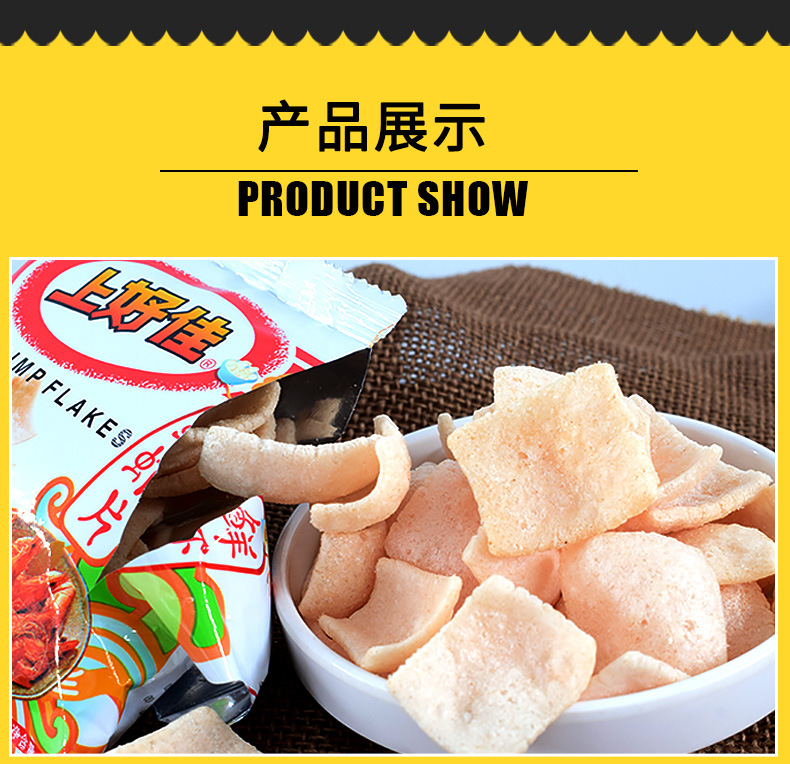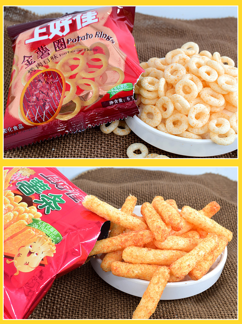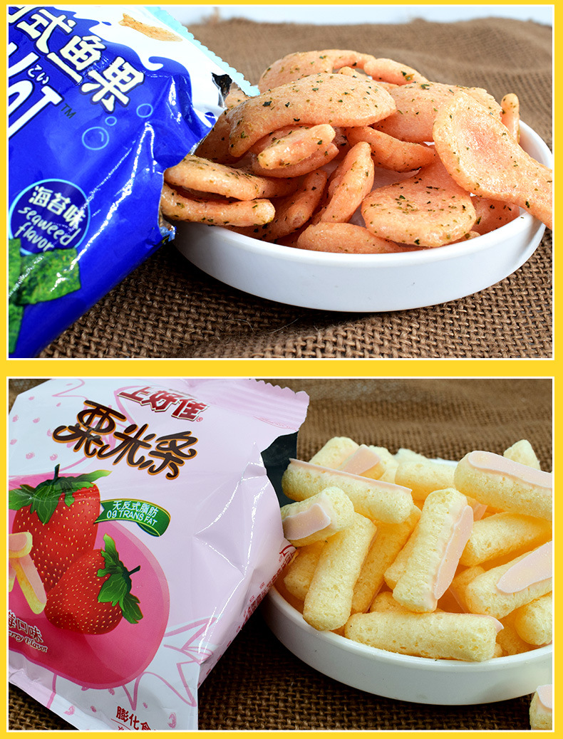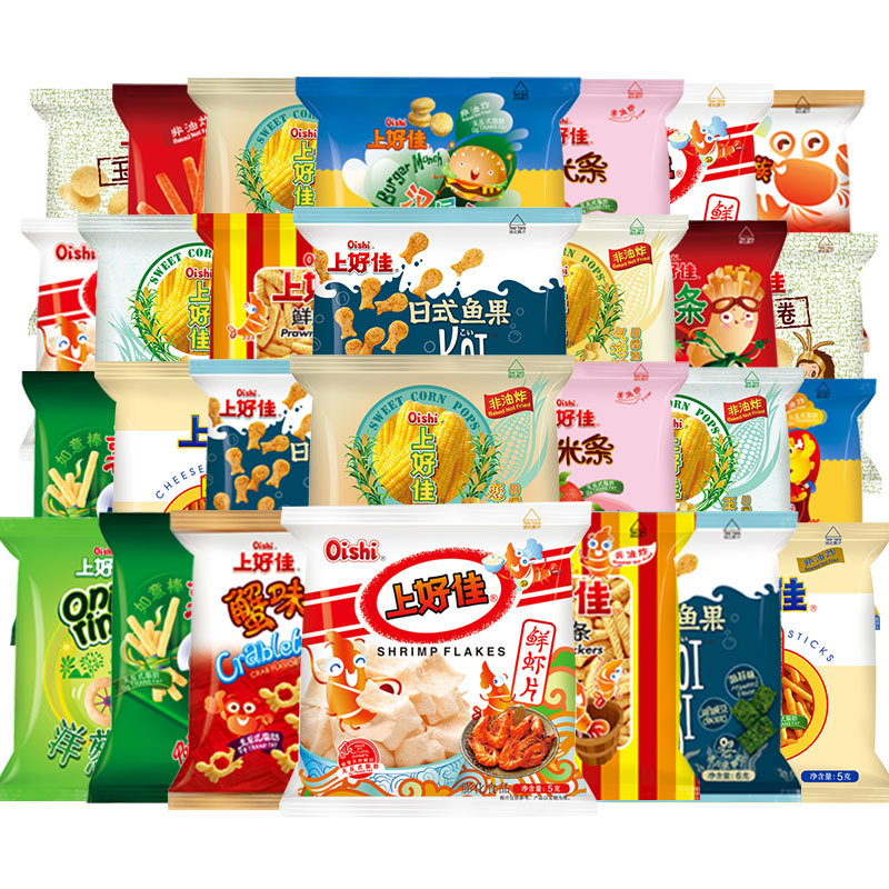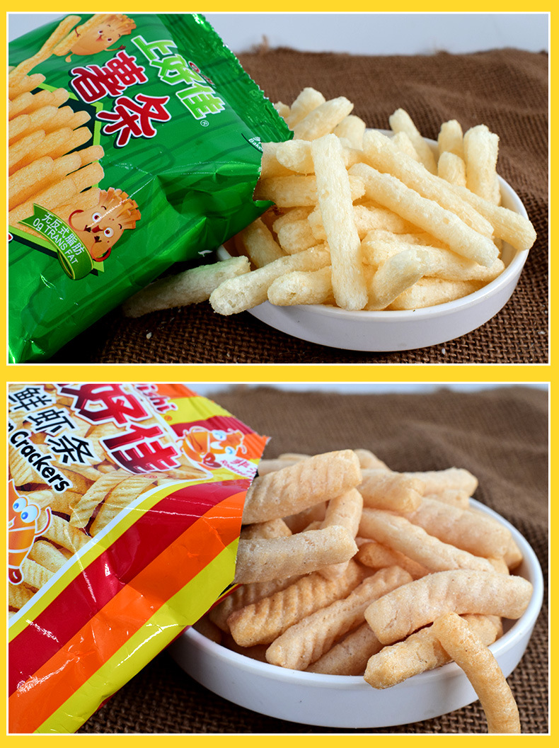 Свежие креветки ломтиками 5г; Луковые кольца 6г; Свежие сухарики из креветок 6г; Сырные палочки 5г; Tianyuan Bubble [кукурузный вкус] 6 г; Tianyuan Bubble [Вкус любовного масла] 6 г; Tianyuan Bubble [Аромат лимона] 6 г; Картошка фри [оригинальный вкус] 8г; Картофель фри [с томатным вкусом] 8г; Шарики для гамбургеров 6г; Тако 6г; Японская рыба и фрукты [смак морских водорослей] 6г; Кукурузные палочки [с клубничным вкусом] 6г; Вкус краба 5г; Хрустящие картофельные чипсы 6г; Свежие ломтики креветок [свежий перец] 5г; Свежие ломтики креветок [с чесночным вкусом] 5г