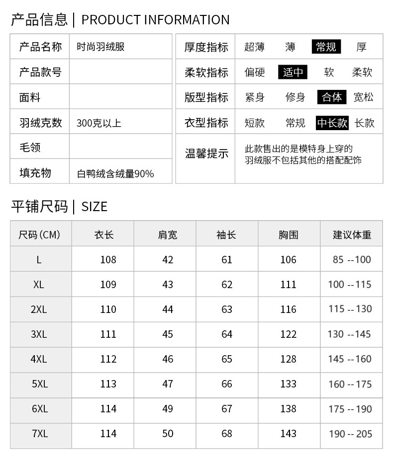 L [рекомендуется менее 100 Цзинь]; XL [рекомендуется 50,00 кг-57,50 кг]; 2XL [рекомендуется 57,50-65,00 кг]; 3XL [рекомендуется 65,00-72,50 кг]; 4XL [рекомендуется 72,50 кг-80,00 кг]; 5XL [рекомендуется 80-87.5kg ]; 6XL [рекомендуется 87,50-95,00 кг]; 7XL [рекомендуется 95,00-102,50 кг]