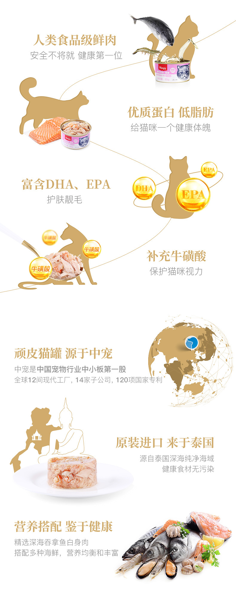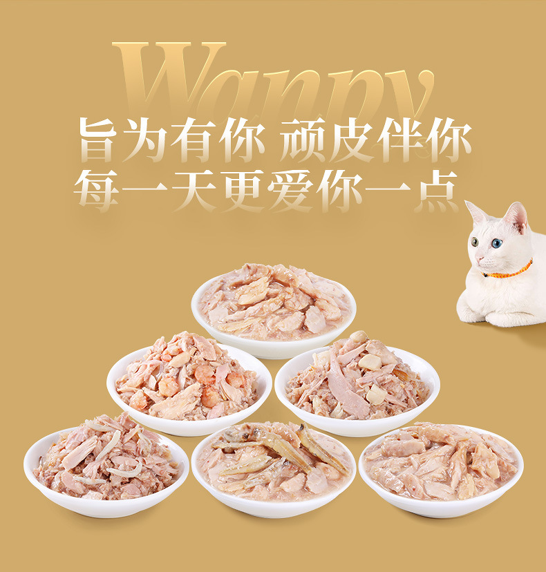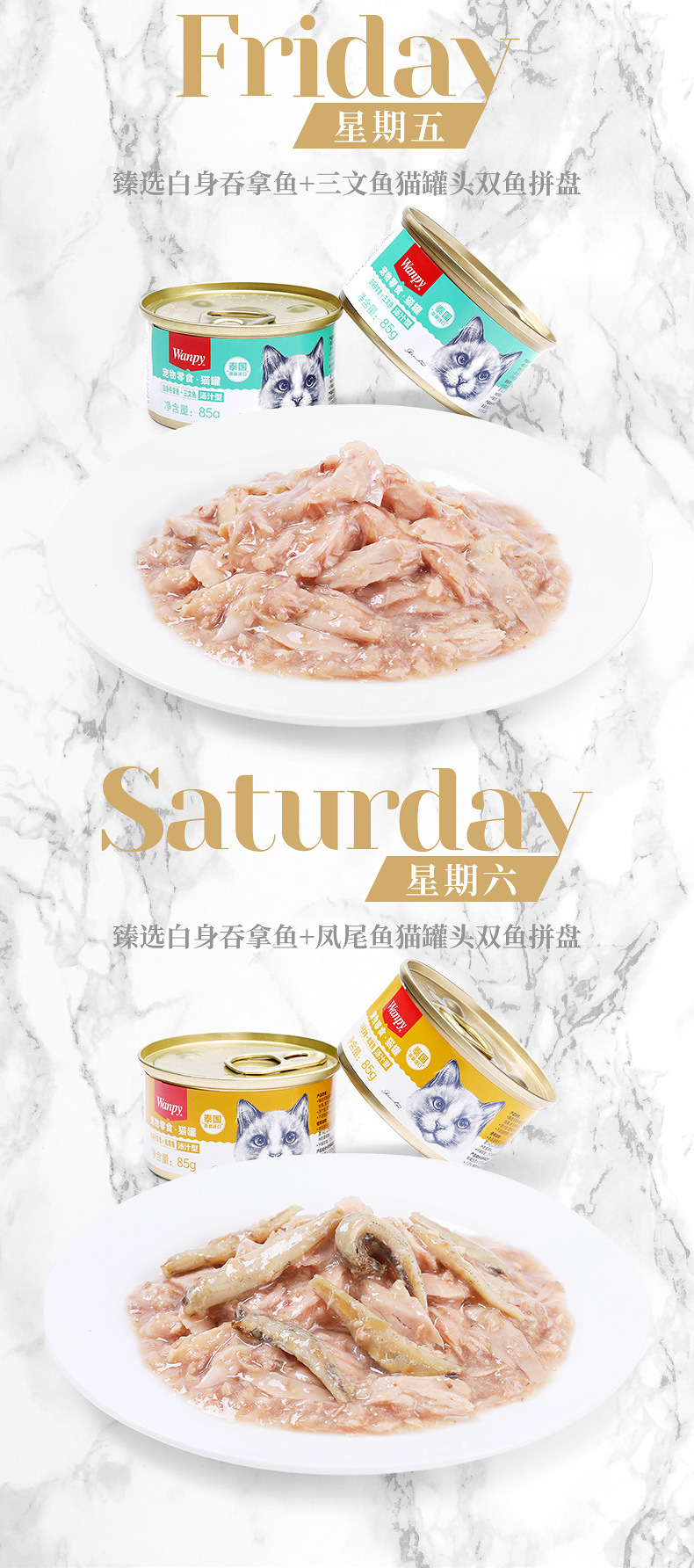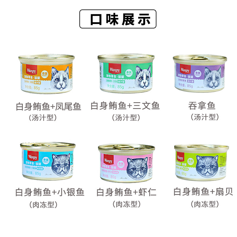 吞拿鱼【汤汁型】; 吞拿鱼+凤尾鱼【汤汁型】; 吞拿鱼+三文鱼【汤汁型】; 吞拿鱼+虾仁【肉冻型】; 吞拿鱼+小银鱼【肉冻型】; 吞拿鱼+扇贝【肉冻型】; 汤汁混合; 肉冻混合; 汤汁+肉冻混合