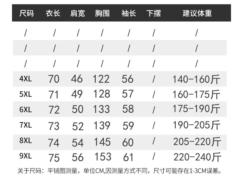 4XL [Рекомендуется 70,00-80,00 кг или около того]; 5XL [Рекомендуемые 80,00-87,50 кг или около того]; 6XL [Рекомендуемые 87,50-95,00 кг или около того]; 7XL [Рекомендуемые 95,00-102,50 кг или около того]; 8XL [Рекомендуемые 102,50-110,00 кг или около того]; 9XL [Рекомендуемый 110,00-120,00 кг или около того]