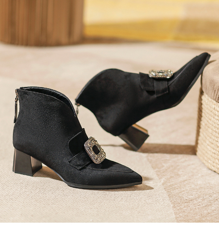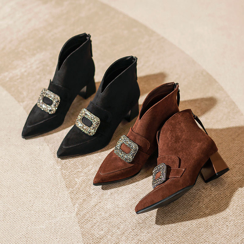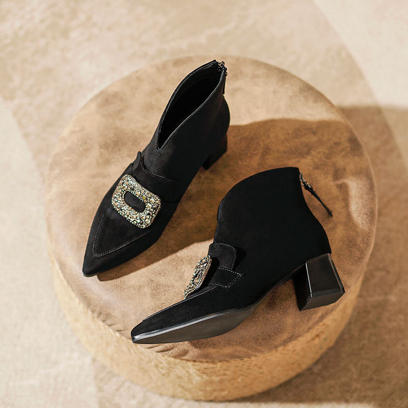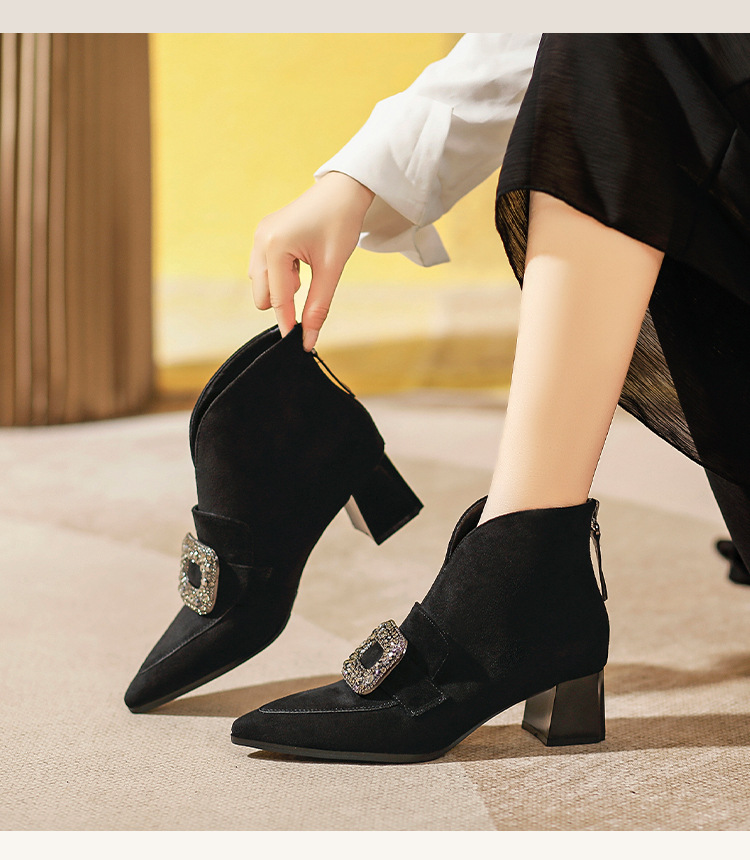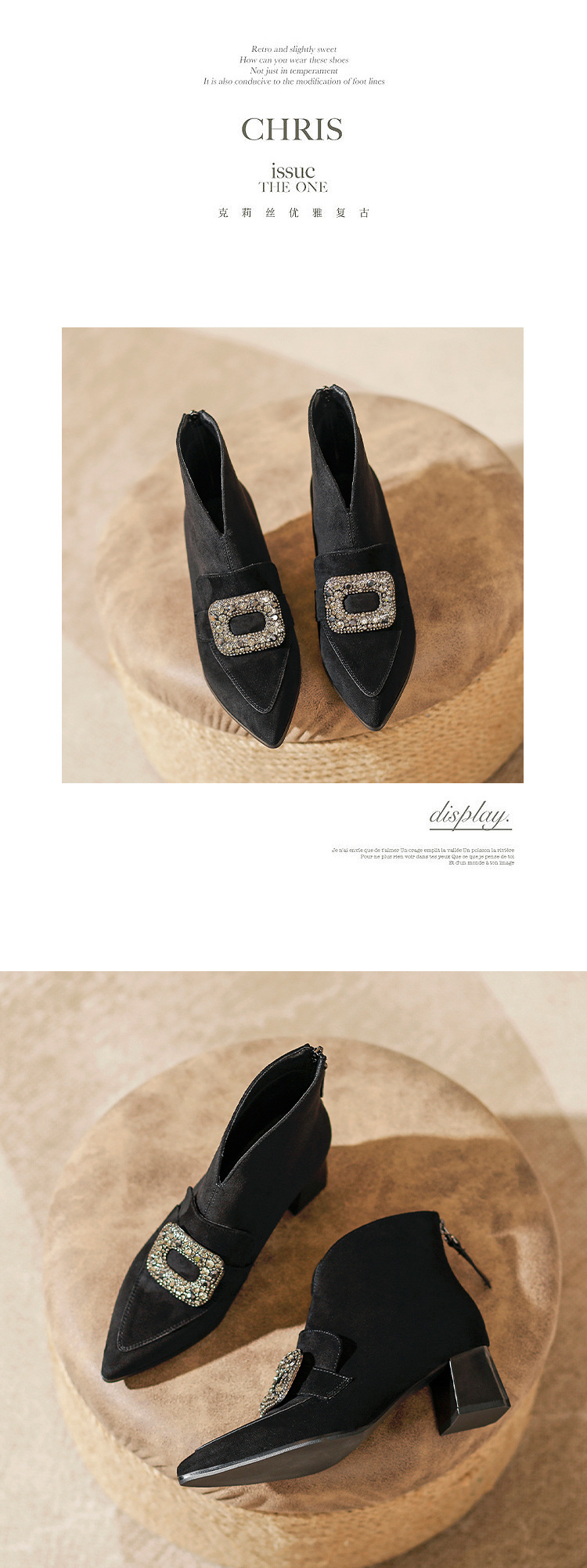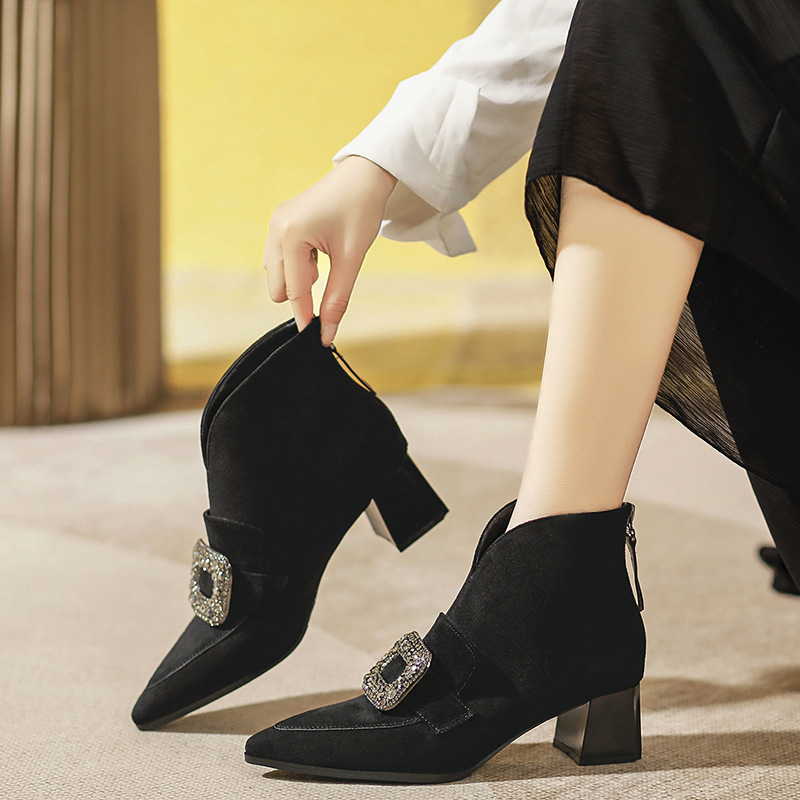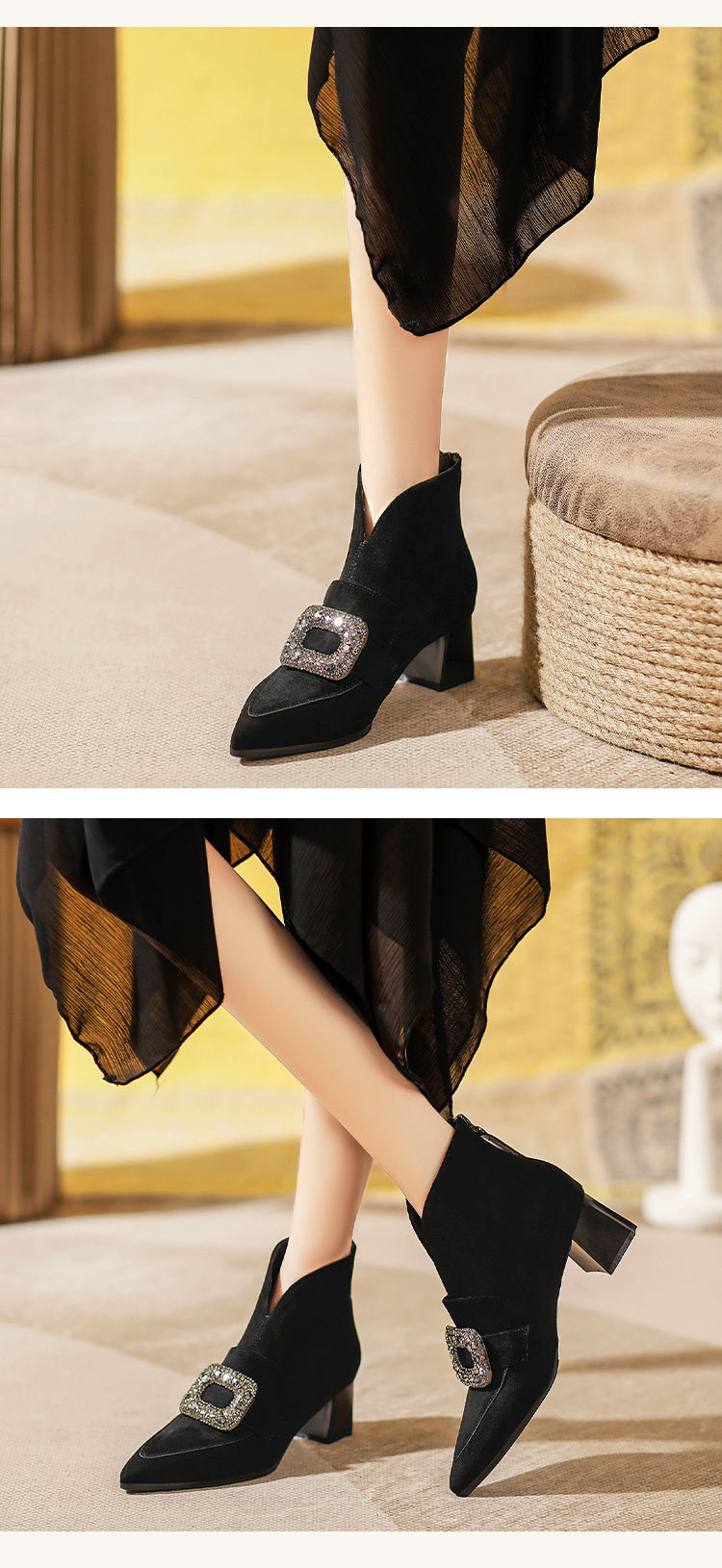 Женские ботинки на массивном каблуке, новинка 2025 года, короткие ботинки в ретро-стиле с V-образным вырезом, высокие туфли с квадратной пряжкой и стразами, заостренный носок, глубокий вырез, плоская подошва.