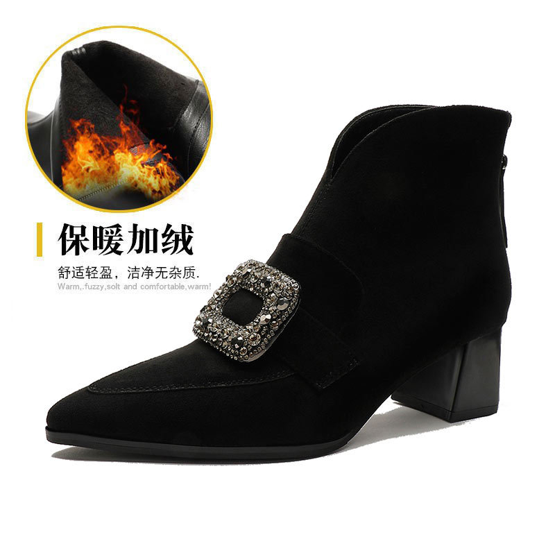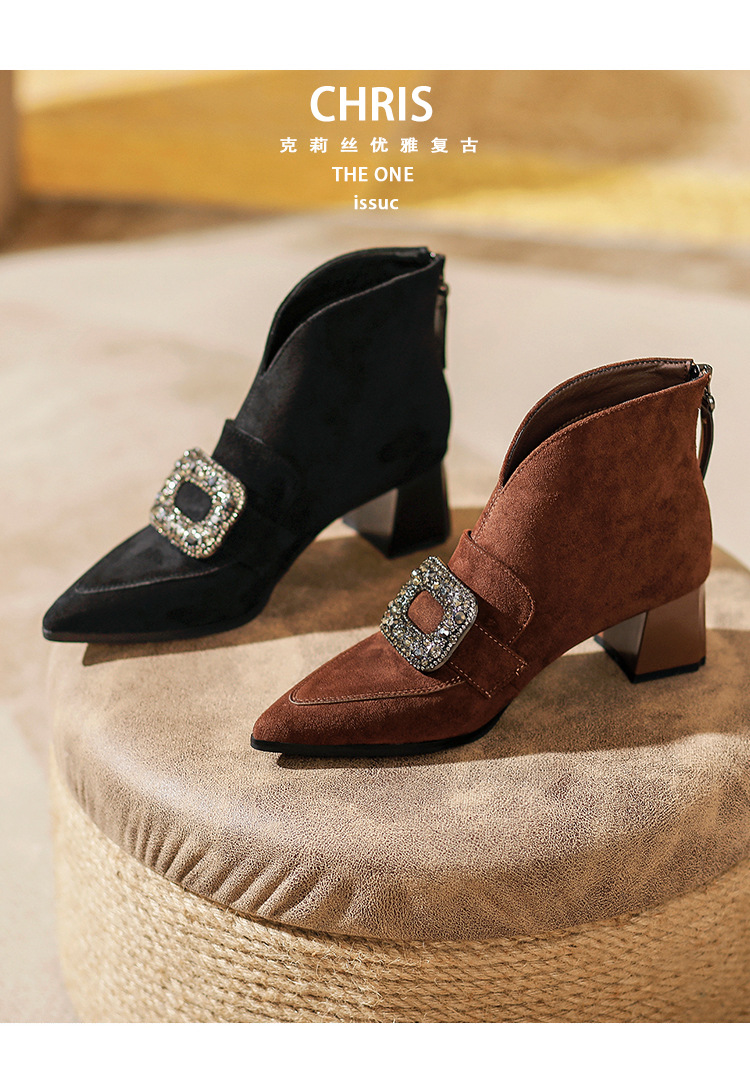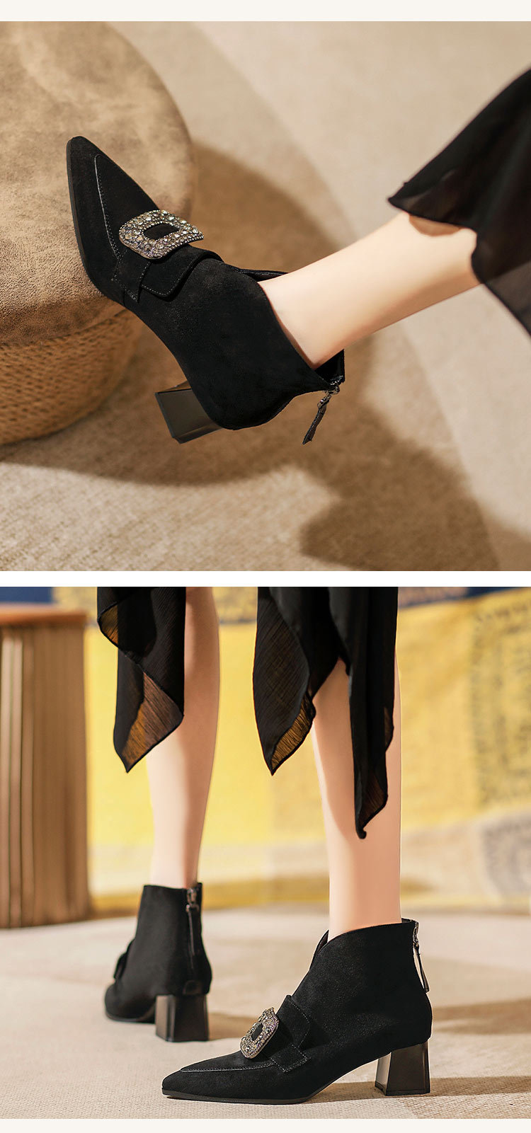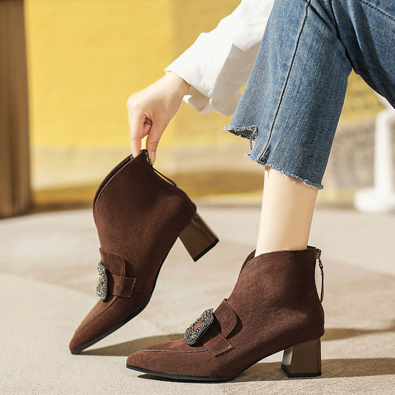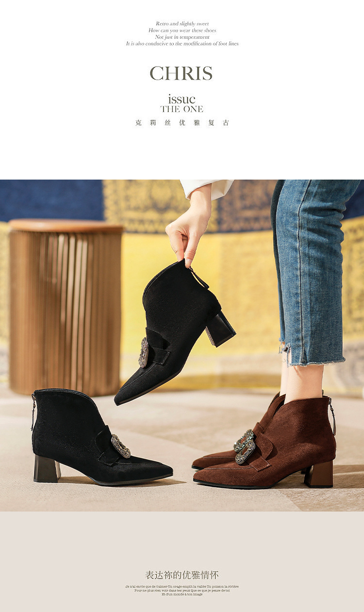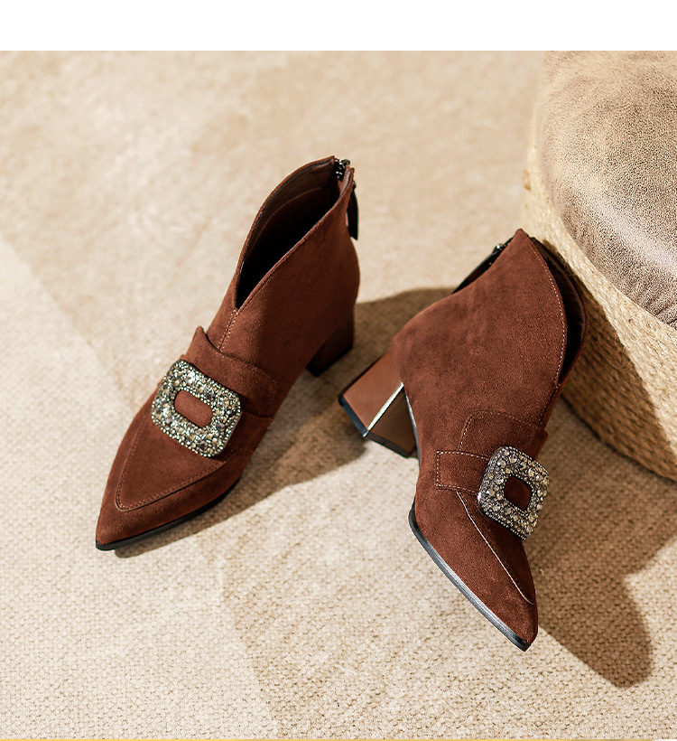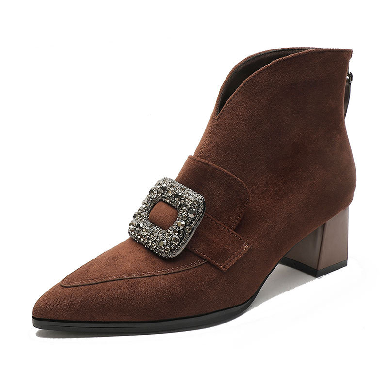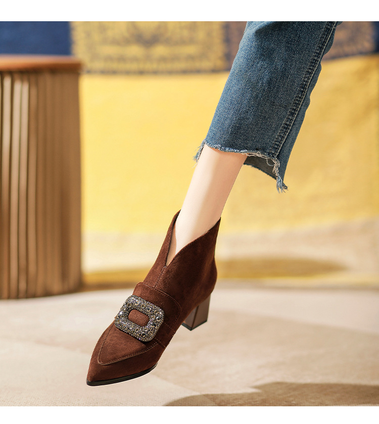 Женские ботинки на массивном каблуке, новинка 2025 года, короткие ботинки в ретро-стиле с V-образным вырезом, высокие туфли с квадратной пряжкой и стразами, заостренный носок, глубокий вырез, плоская подошва.