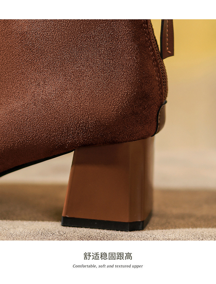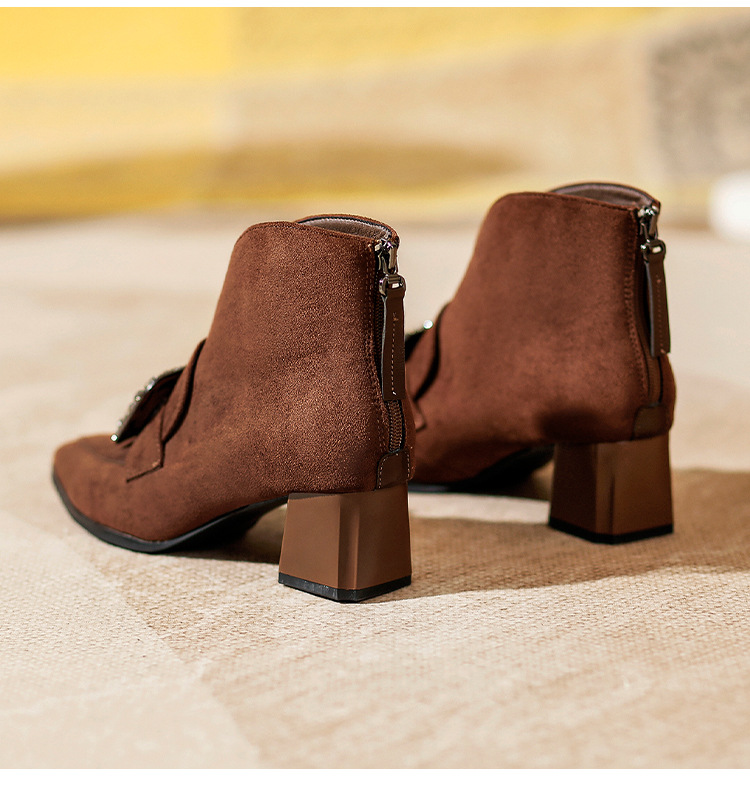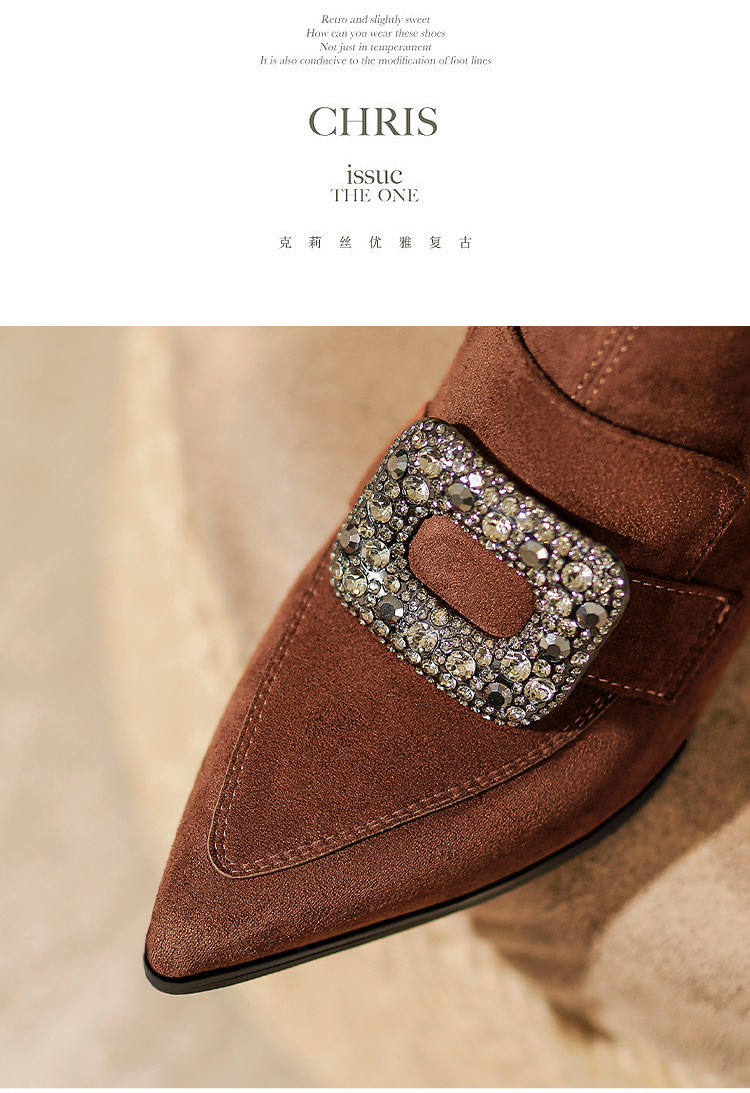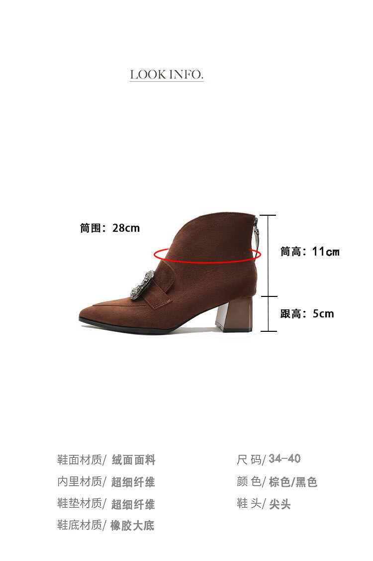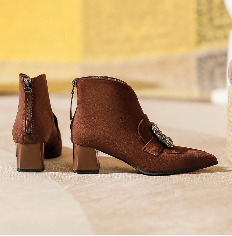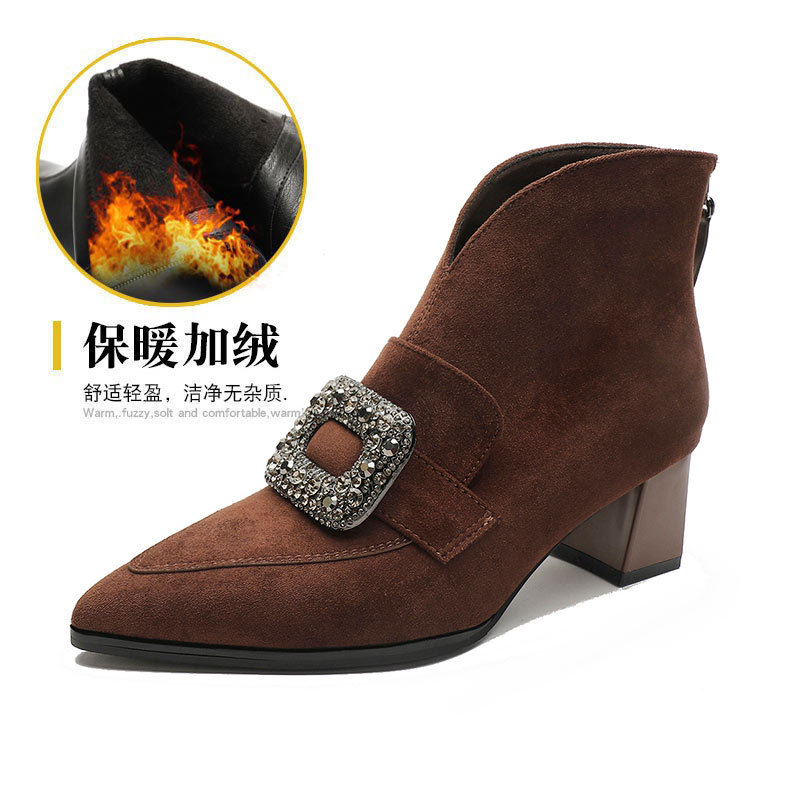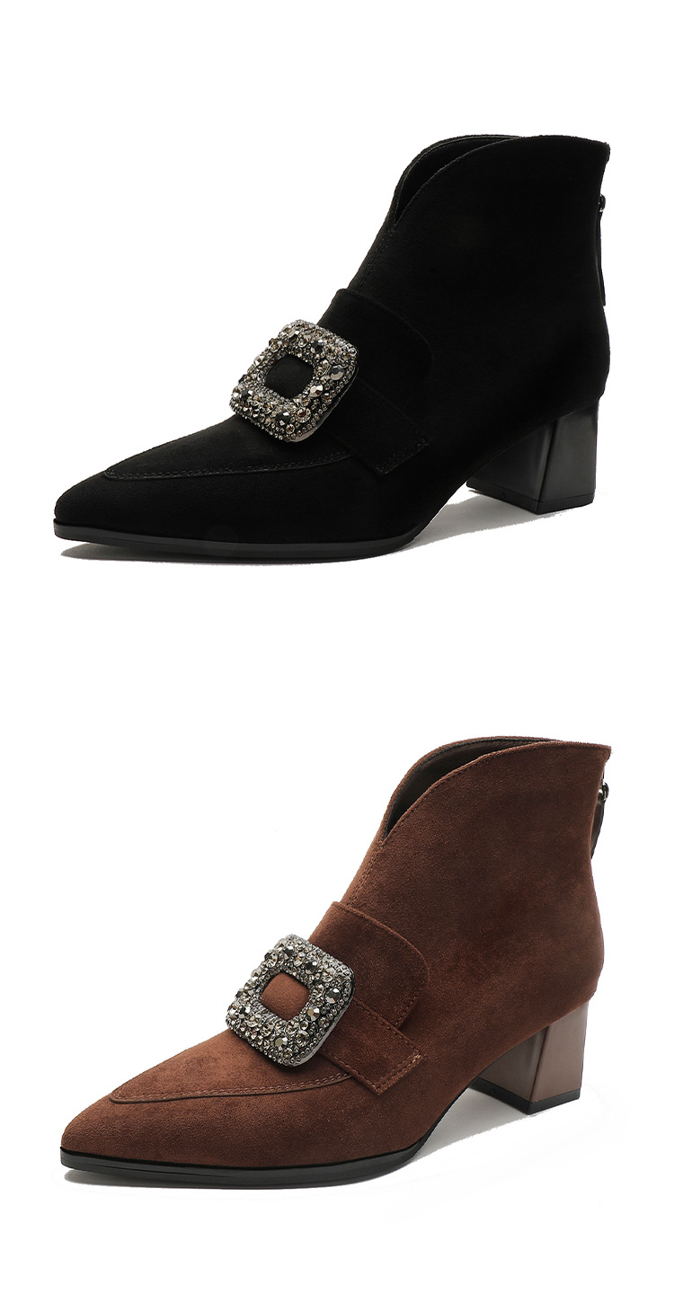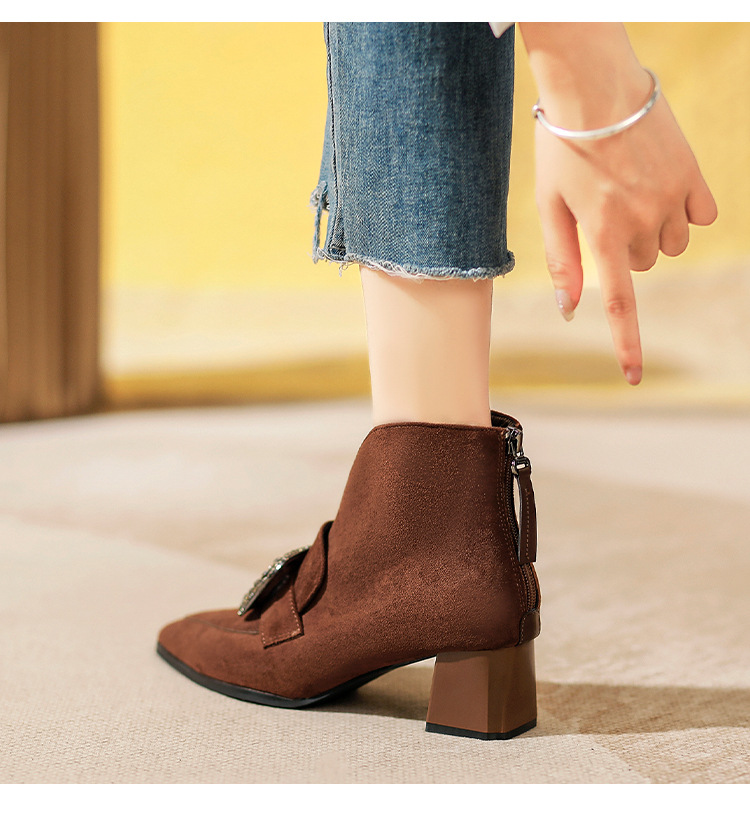Женские ботинки на массивном каблуке, новинка 2025 года, короткие ботинки в ретро-стиле с V-образным вырезом, высокие туфли с квадратной пряжкой и стразами, заостренный носок, глубокий вырез, плоская подошва.