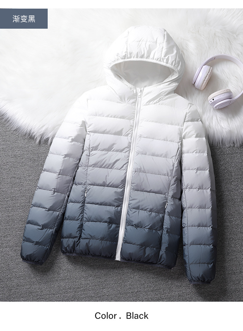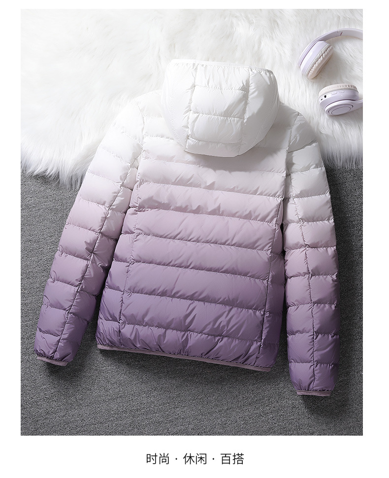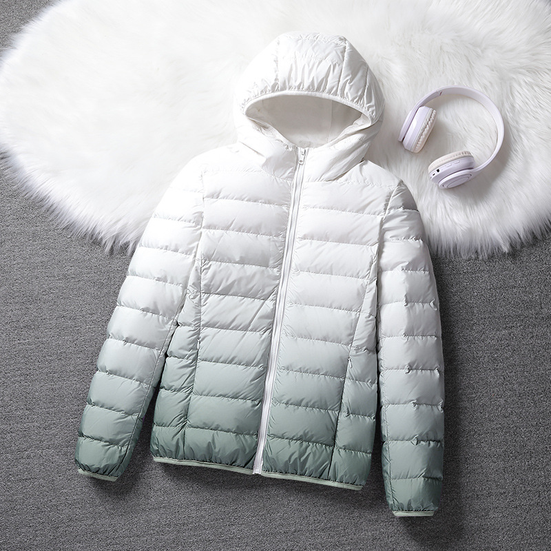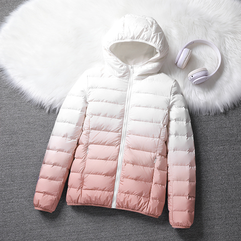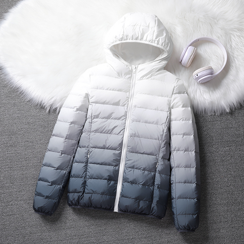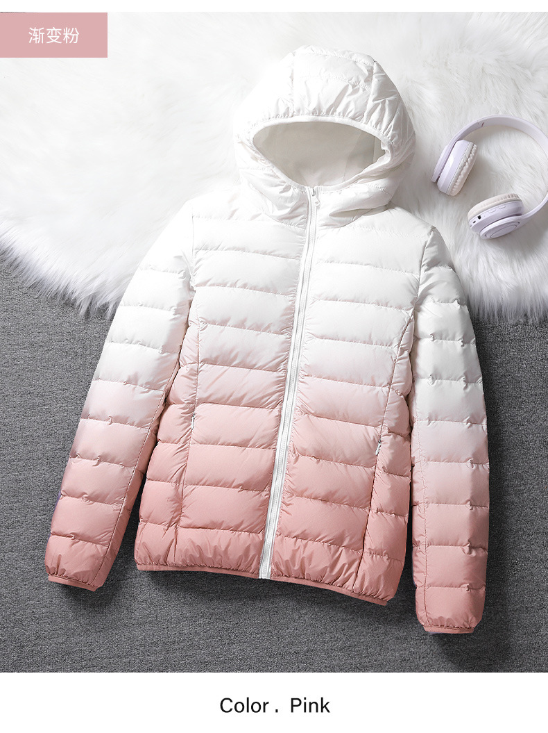 Новый легкий пуховик с коротким градиентным цветом, Модное теплое белое пальто с капюшоном на утином пуху для женщин