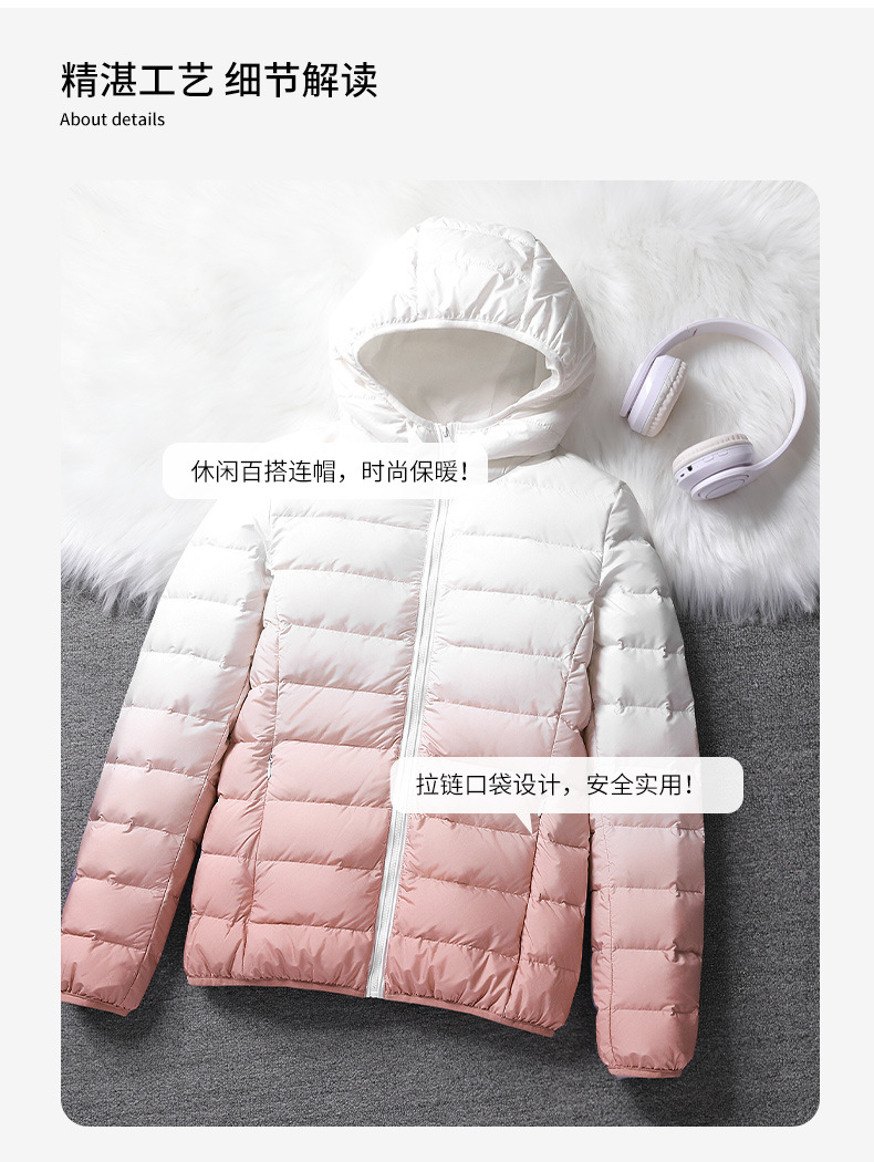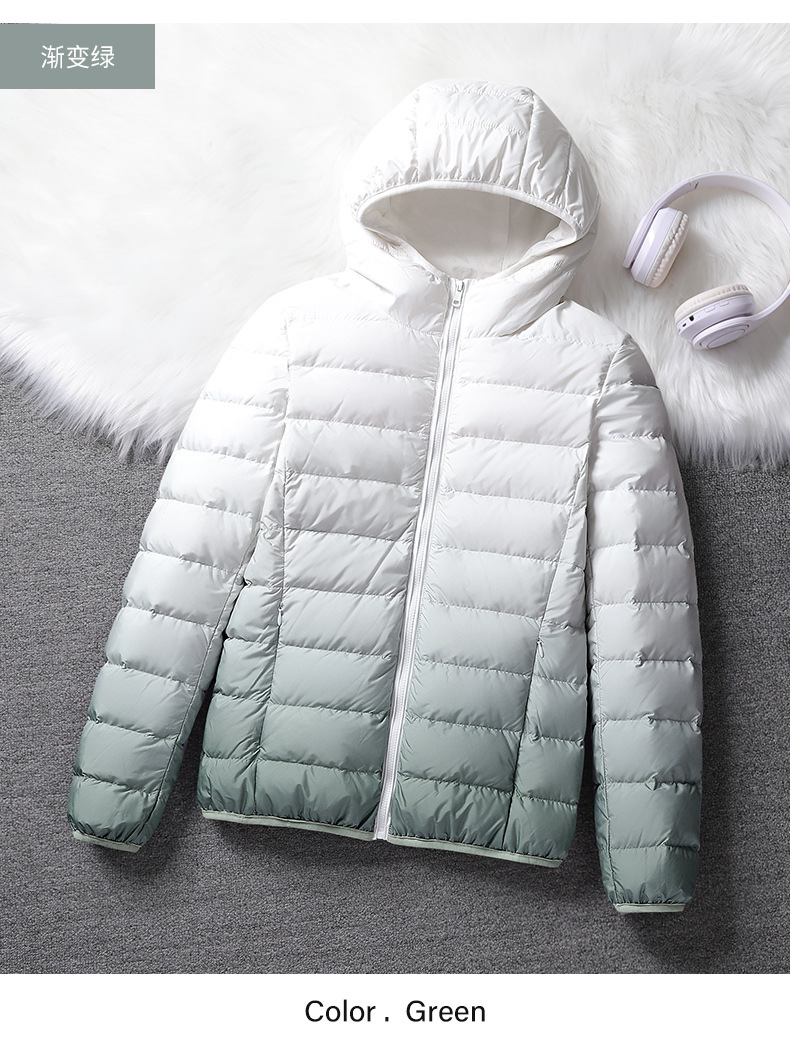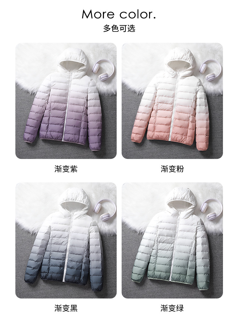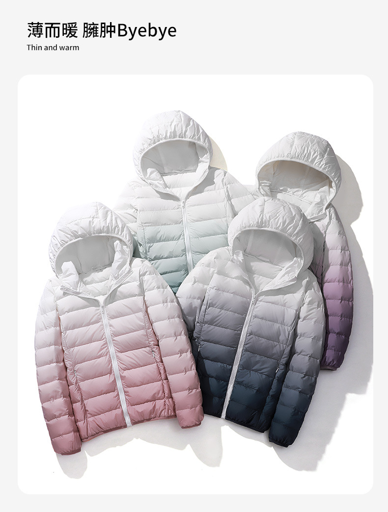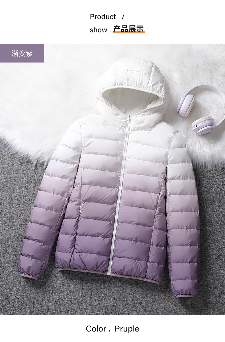 Новый легкий пуховик с коротким градиентным цветом, Модное теплое белое пальто с капюшоном на утином пуху для женщин