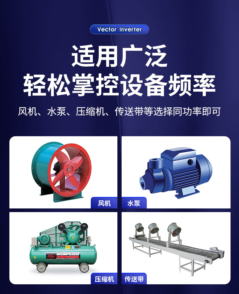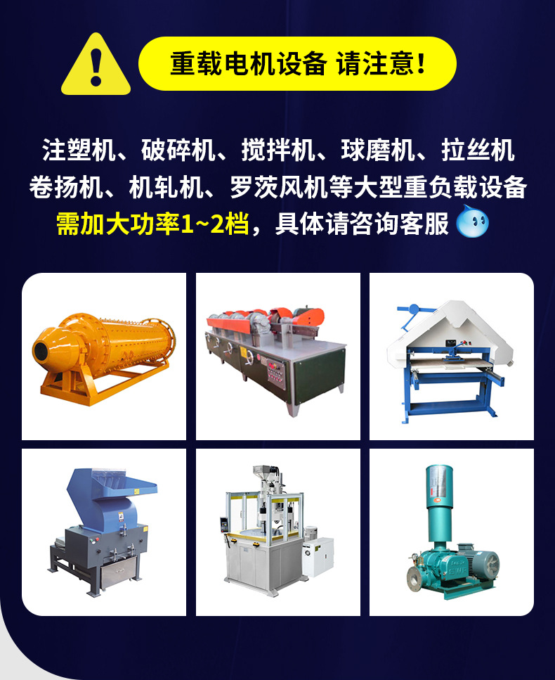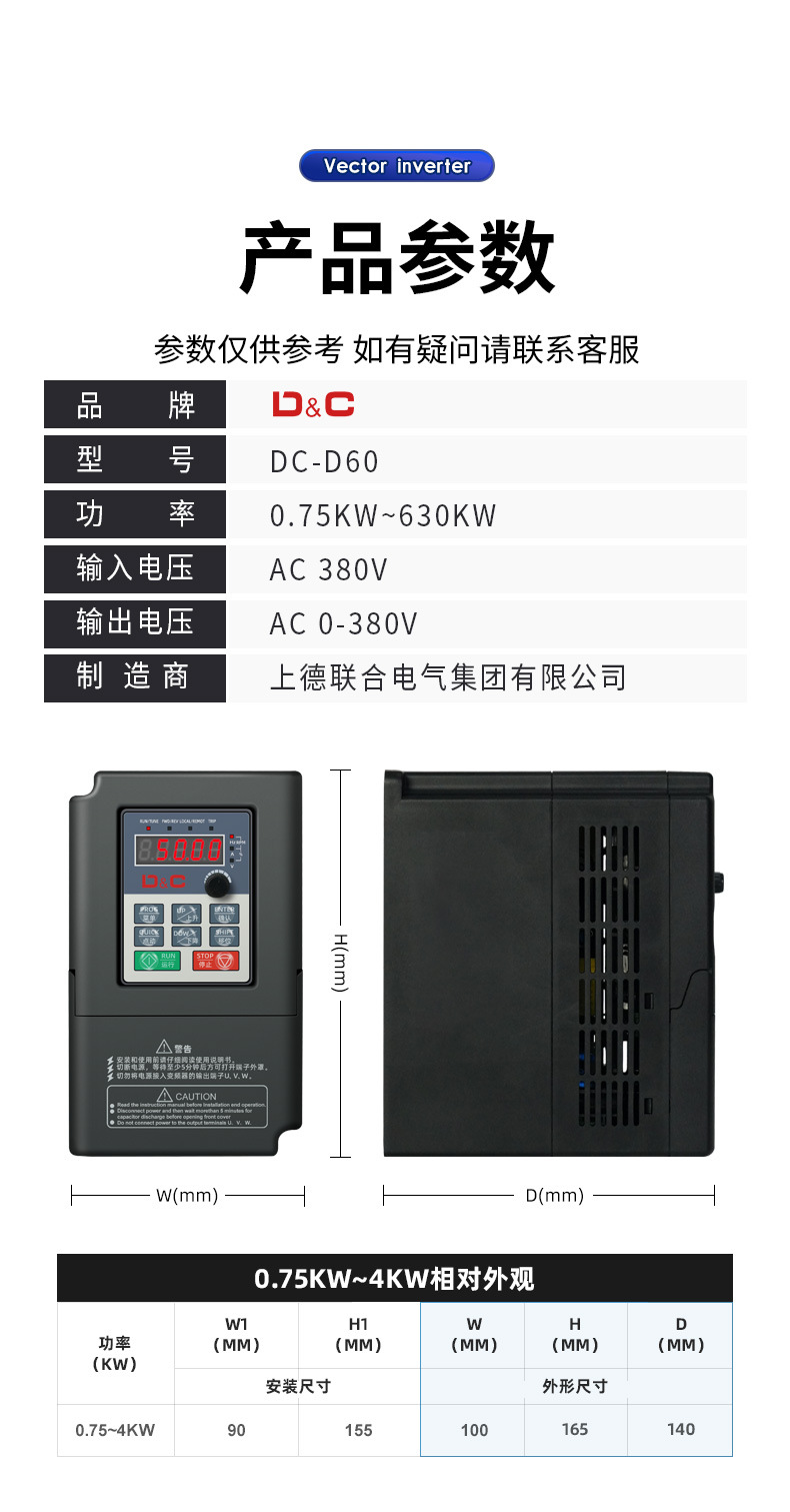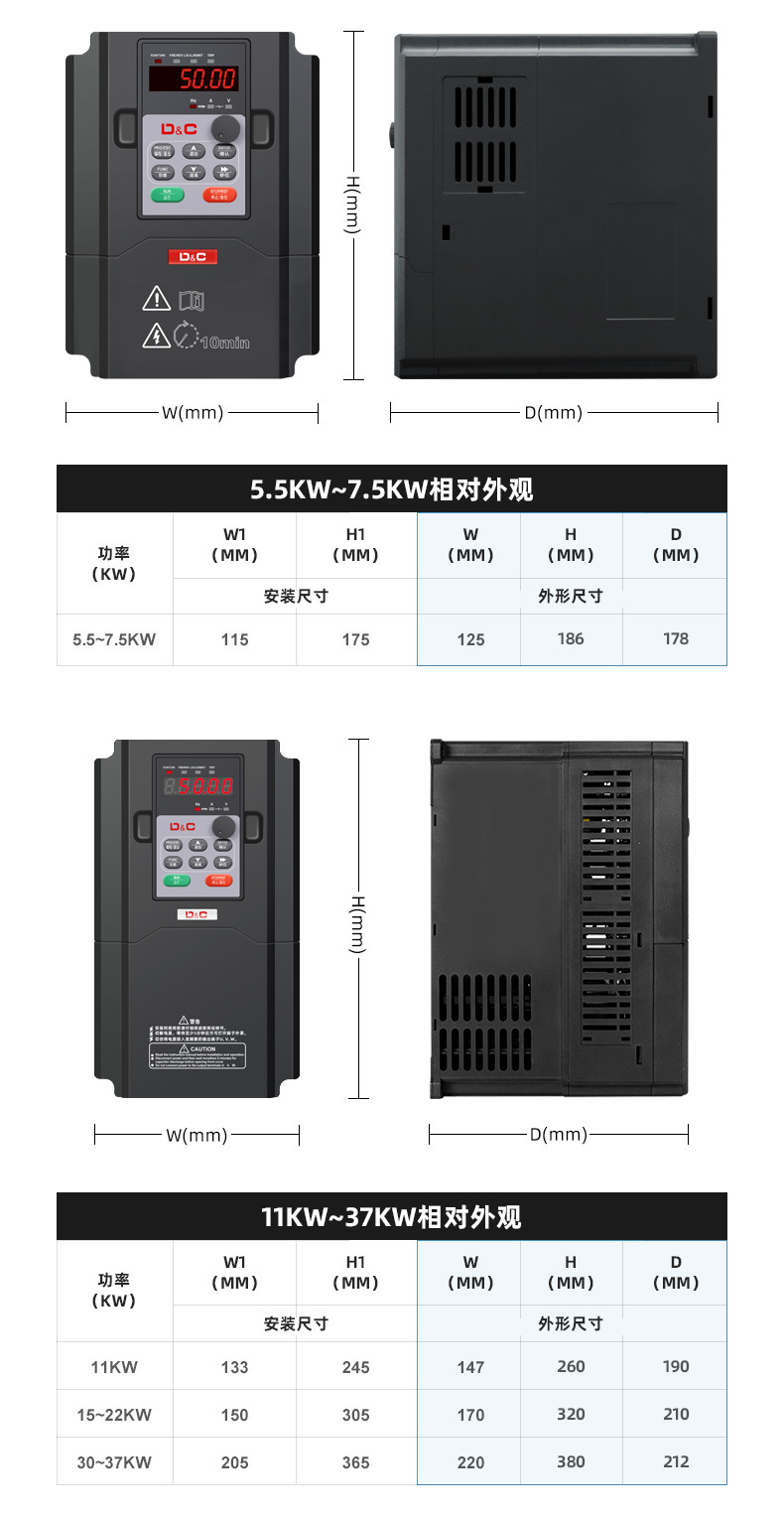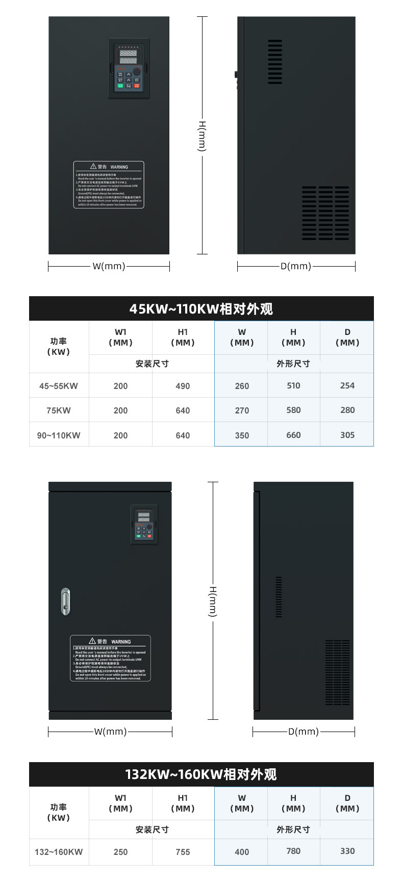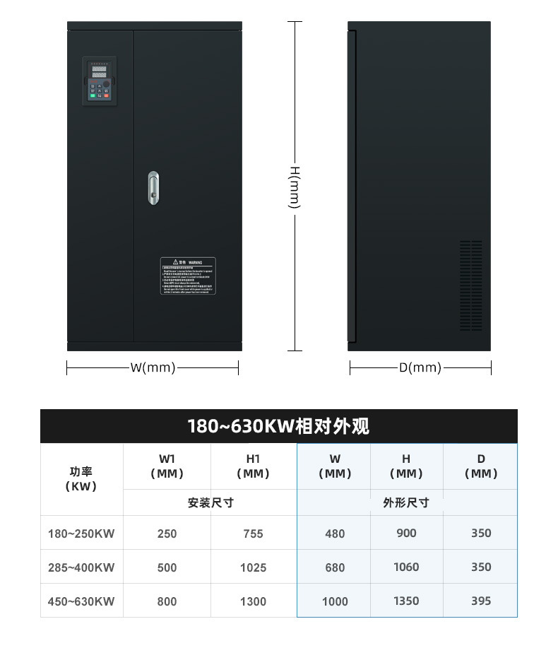0.75kW; 1.5kW; 2.2kW; 4kW; 5.5kW; 7.5kW; 11kW; 15kW; 18.5kW; 22kW; 30kW; 37kW; 45kW; 55kW; 75kW; 90kW; 110kW; 132kW; 160kW; 185KW; 200kW; 220kW; 250kW; 285kW; 315kW; 355kW; 400kW; 450kW; 500kW; 630kW