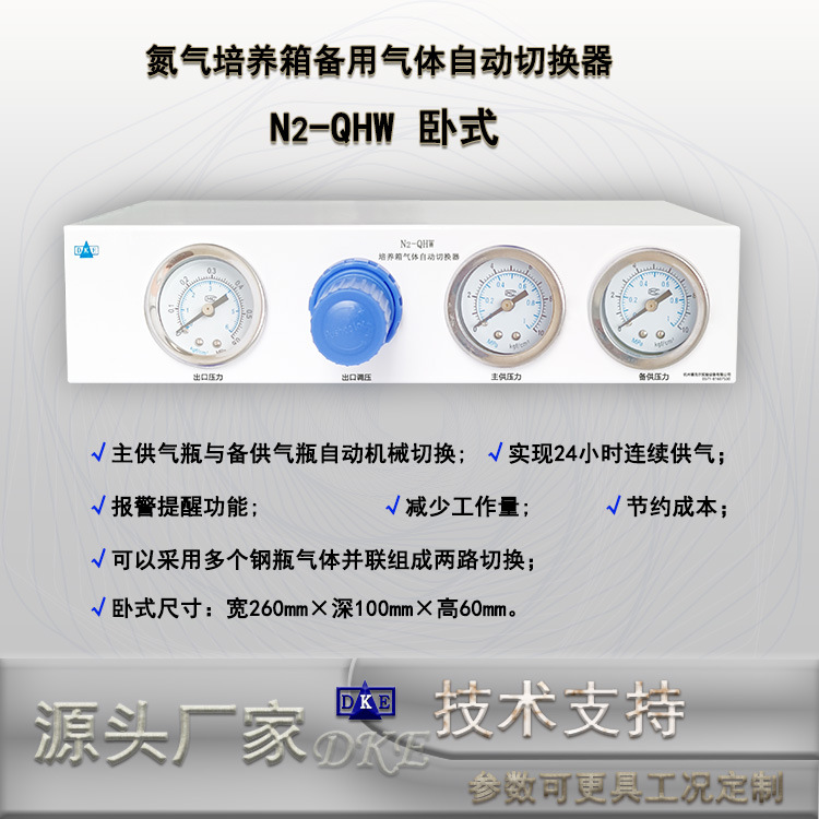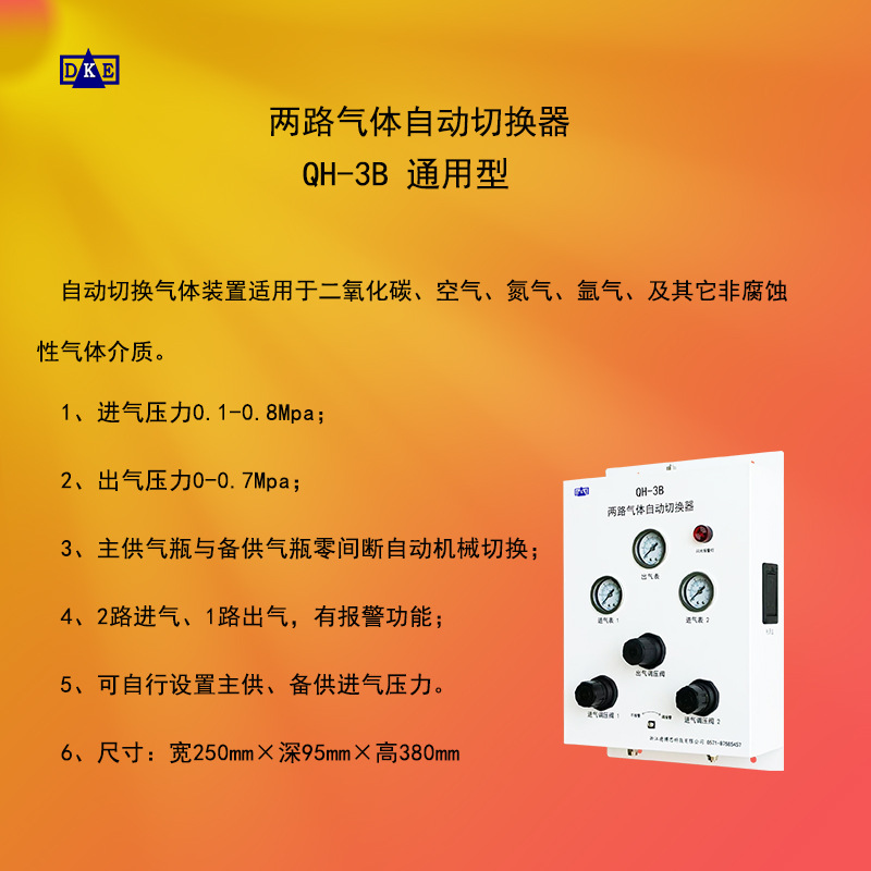 钢瓶气体自动切换装置,专为提供不间断供气的要求而设计。装置采用主供气瓶和备供气瓶组双气源结构,由主供气瓶与备供气瓶实现自动切换,当出现备供气瓶供气时发出闪光报警声提醒更换主供气瓶,它保证输出气体的稳定不间断。自动切换气体装置适用于二氧化碳、空气、氮气、氩气、及其它非腐蚀性气体介质。