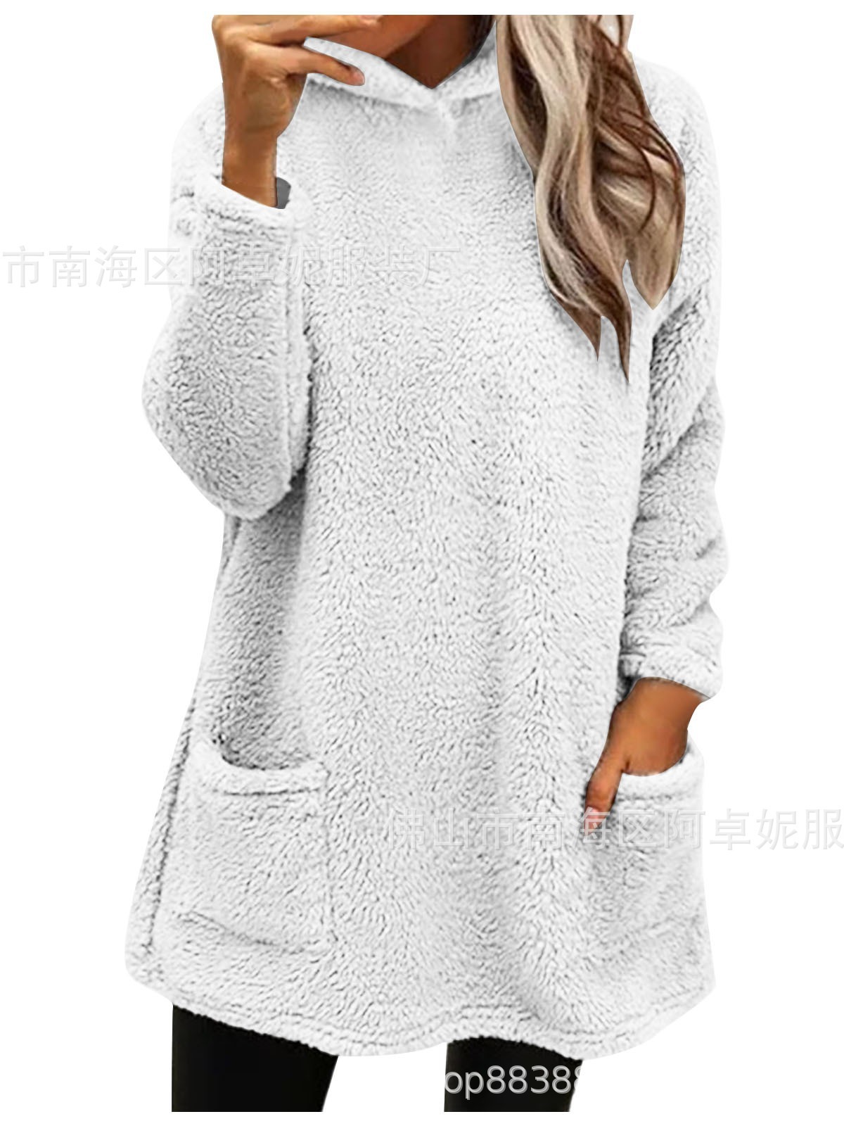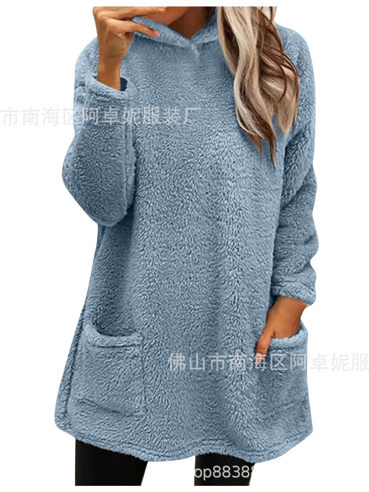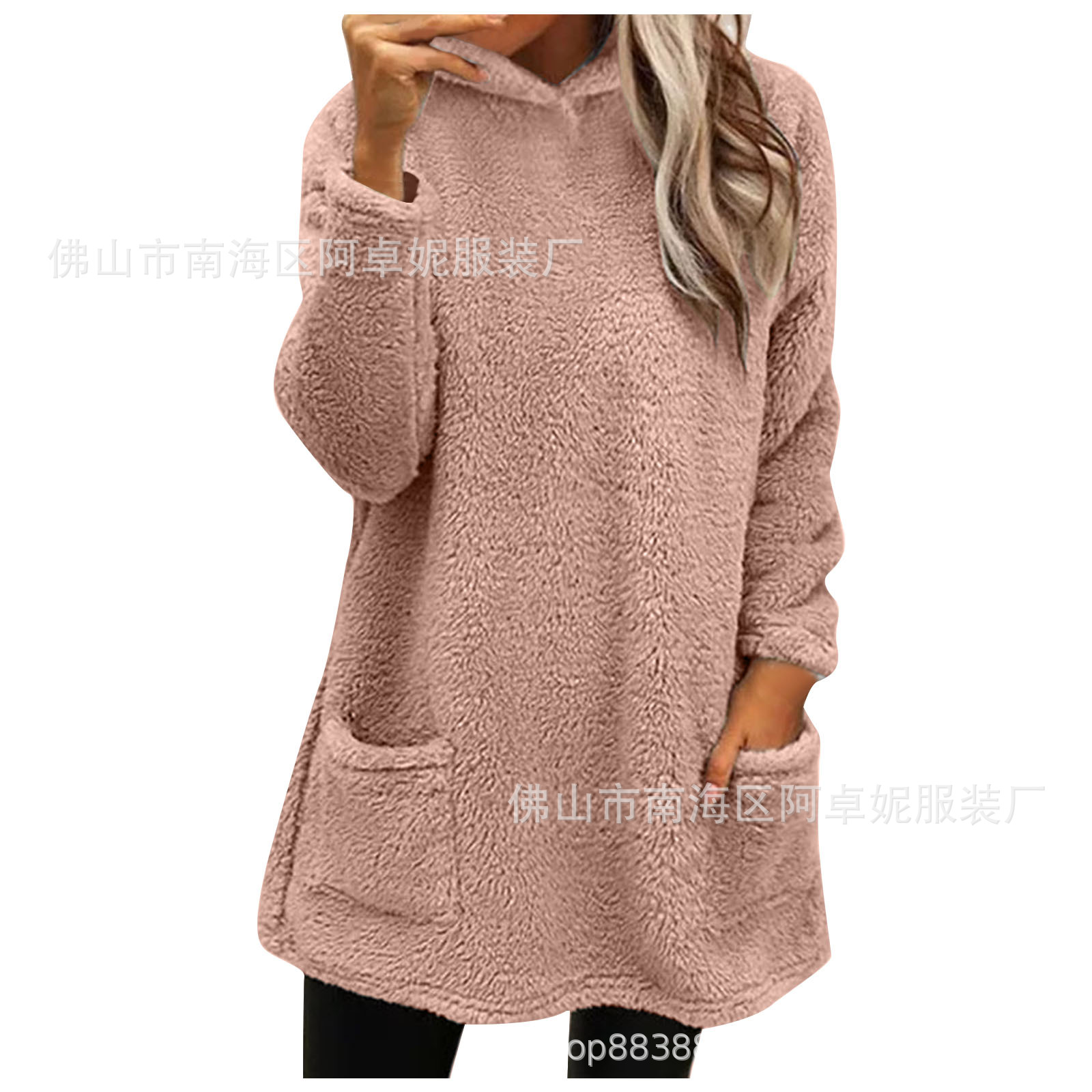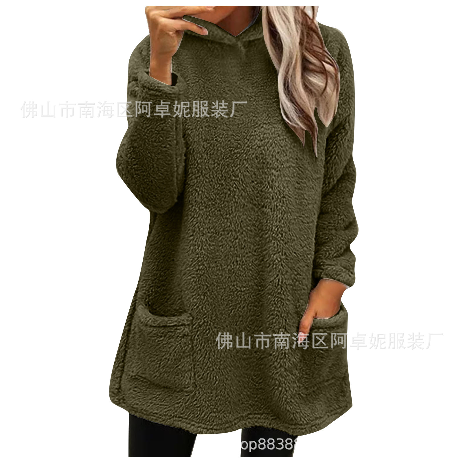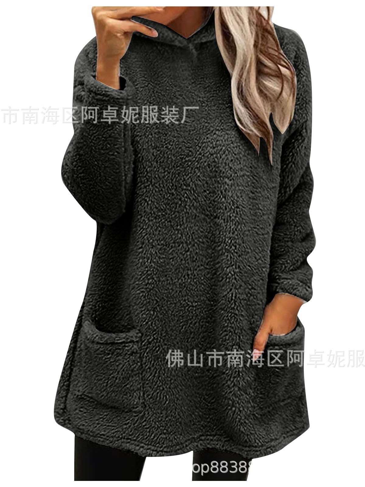 2023 Осень-зима трансграничная женская новая свободная двухсторонняя бархатная толстовка с капюшоном с длинными рукавами и карманами на Amazon