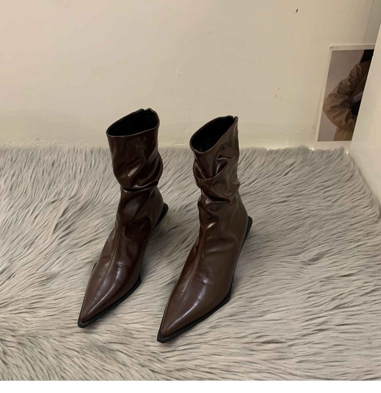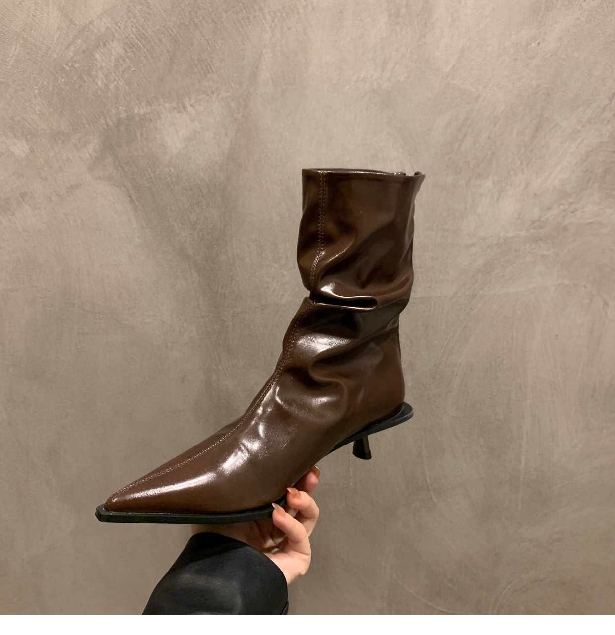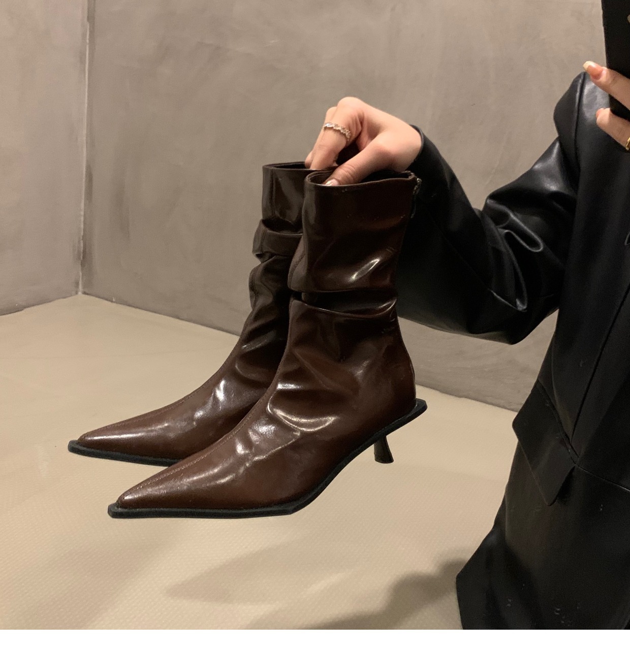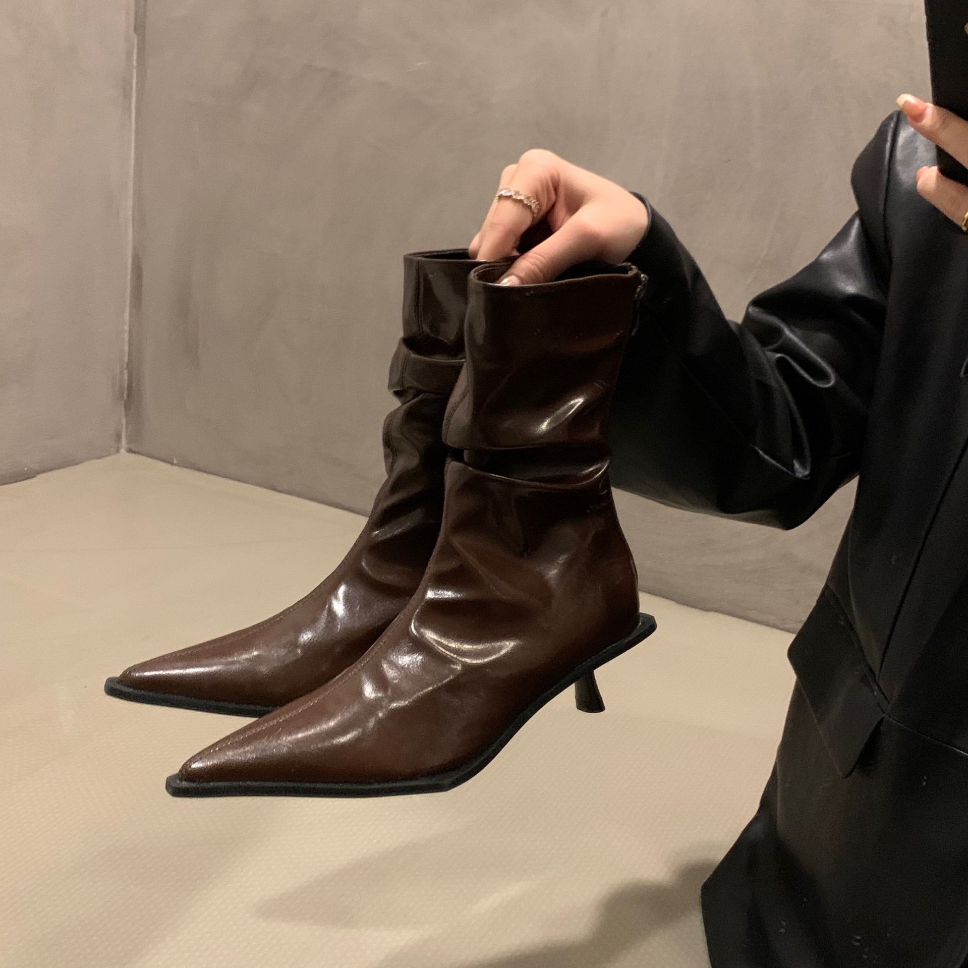 Элегантные женские ботильоны во французском стиле на высоком каблуке, новинка 2025 года, коричневые осенне-зимние ботинки с флисовой подкладкой, заостренный носок, укороченные.