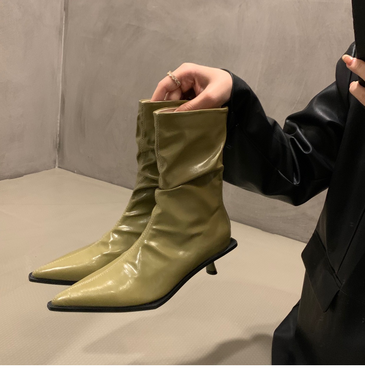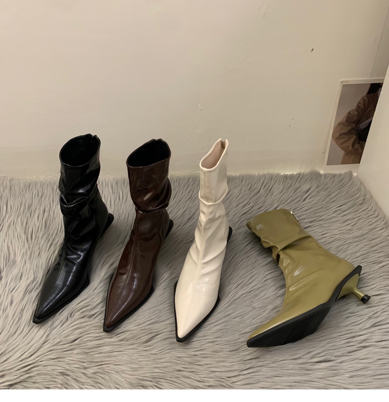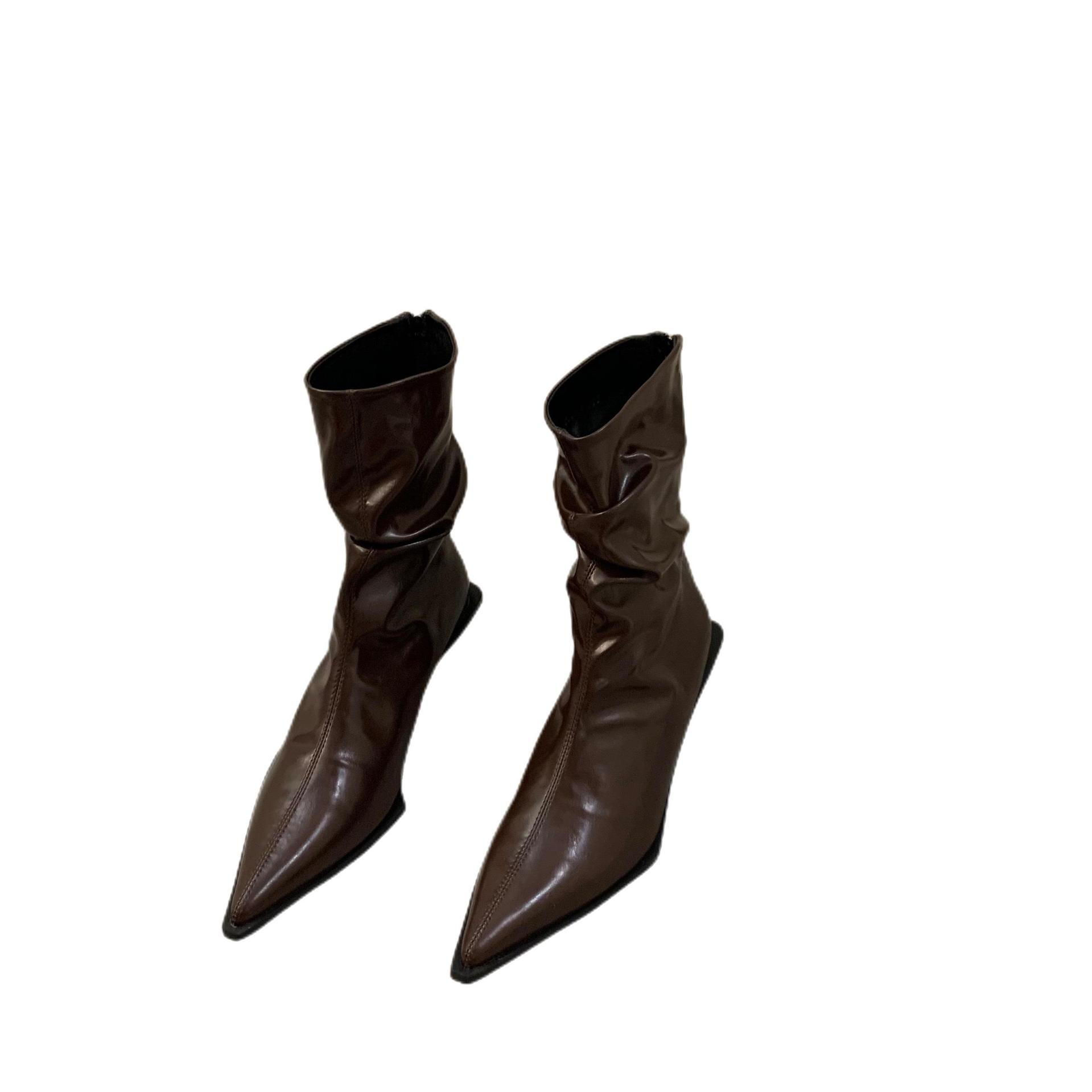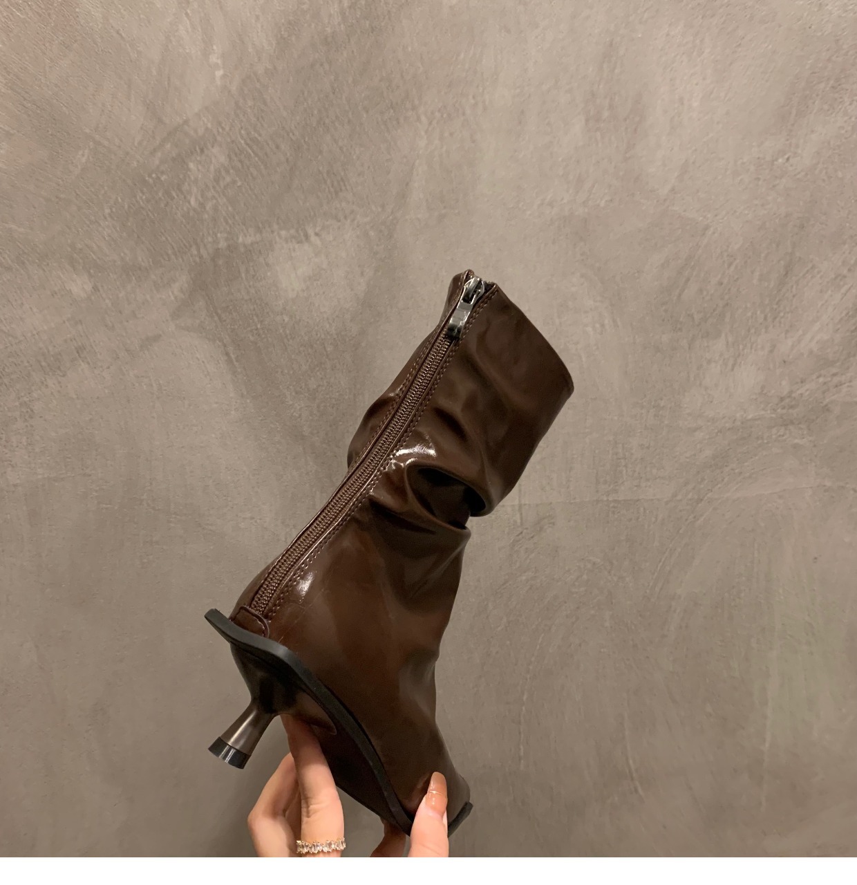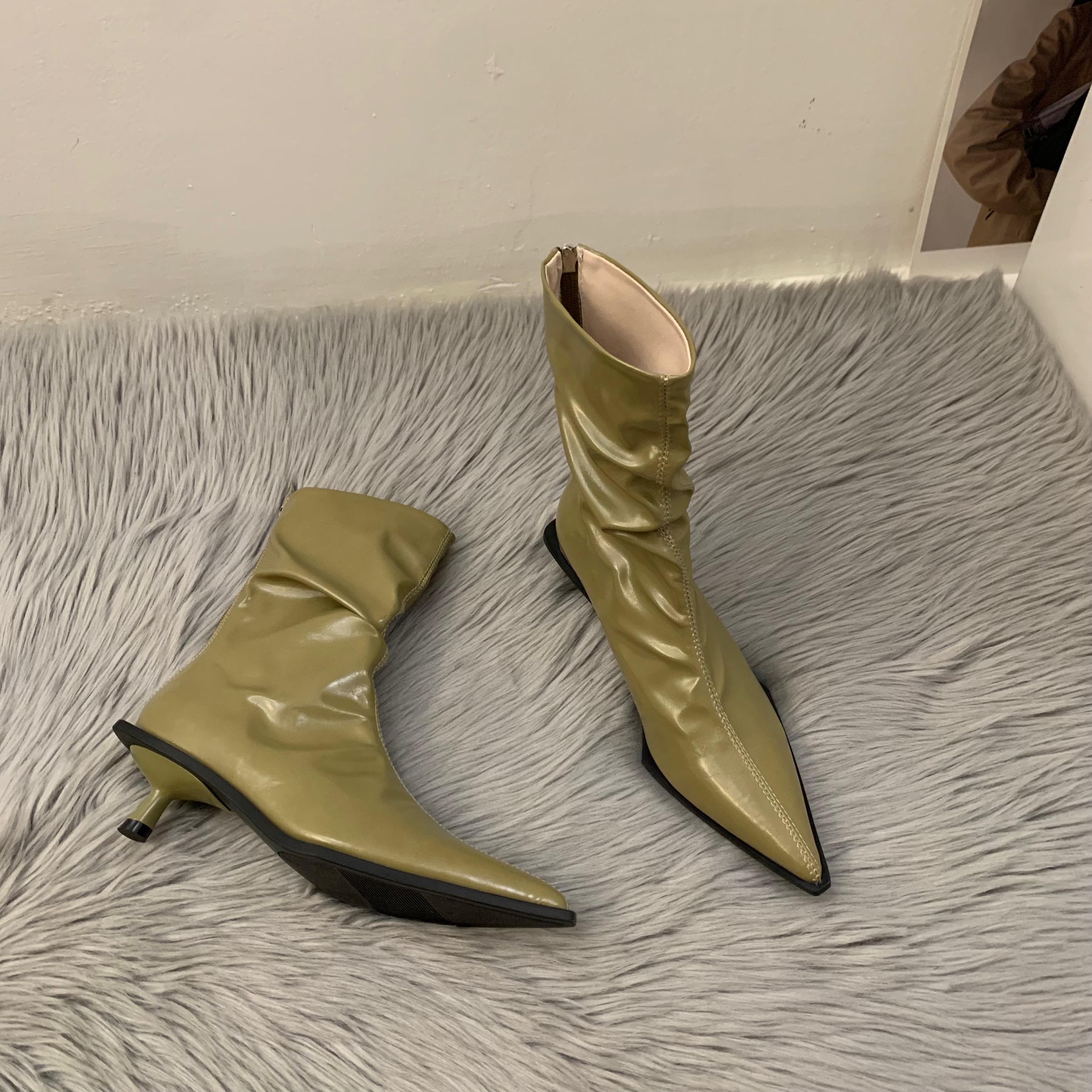 Элегантные женские ботильоны во французском стиле на высоком каблуке, новинка 2025 года, коричневые осенне-зимние ботинки с флисовой подкладкой, заостренный носок, укороченные.