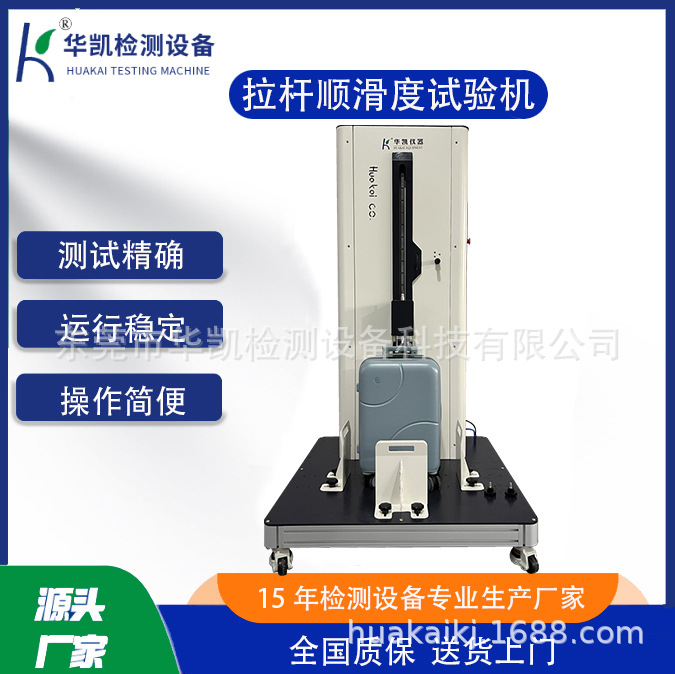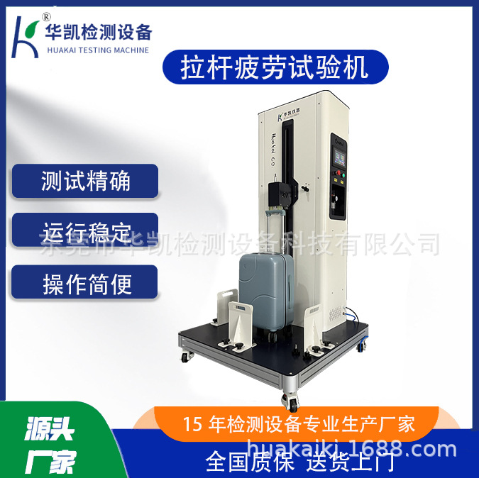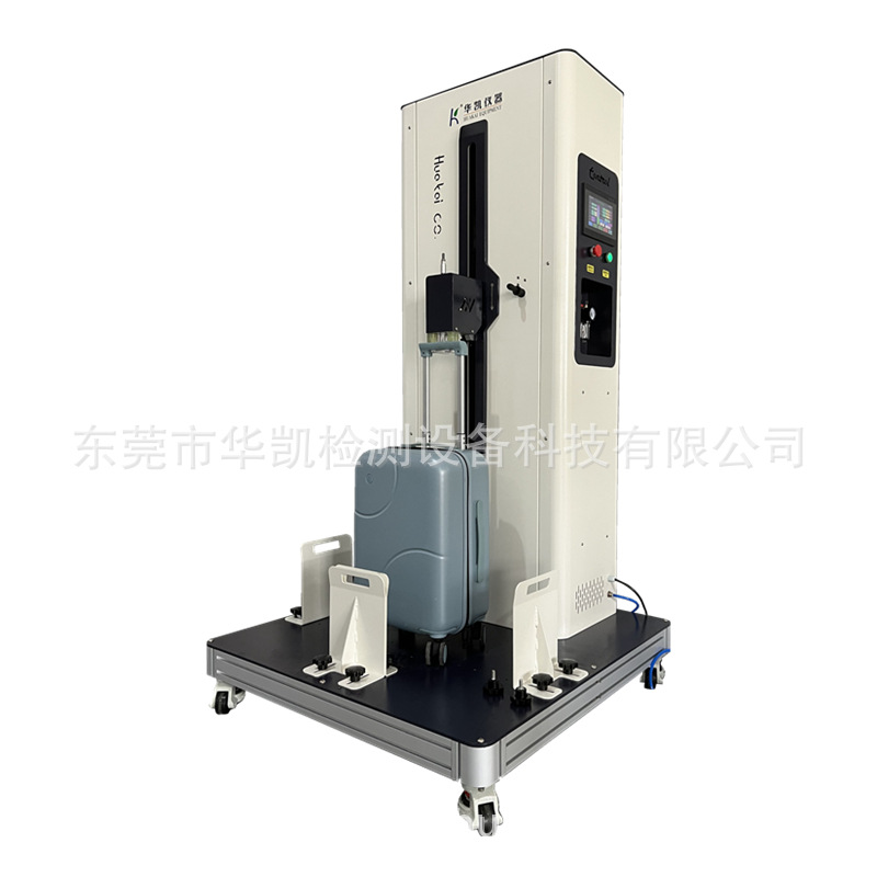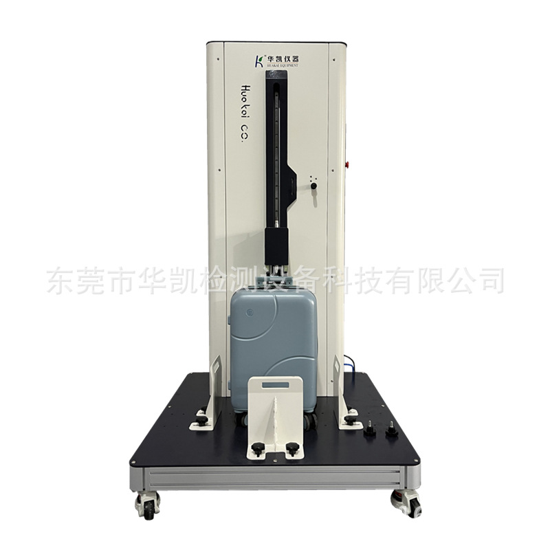 本机台针对箱包的拉杆做往复疲劳试验。在一定的拉出、压合频率下,通过对箱包的拉杆锁及拉杆进行连续不断地开关、往复拉出、压合,检验拉杆的往复疲劳性能,从而测试拉杆产生的间隙、松脱、连接杆故障、变形等。