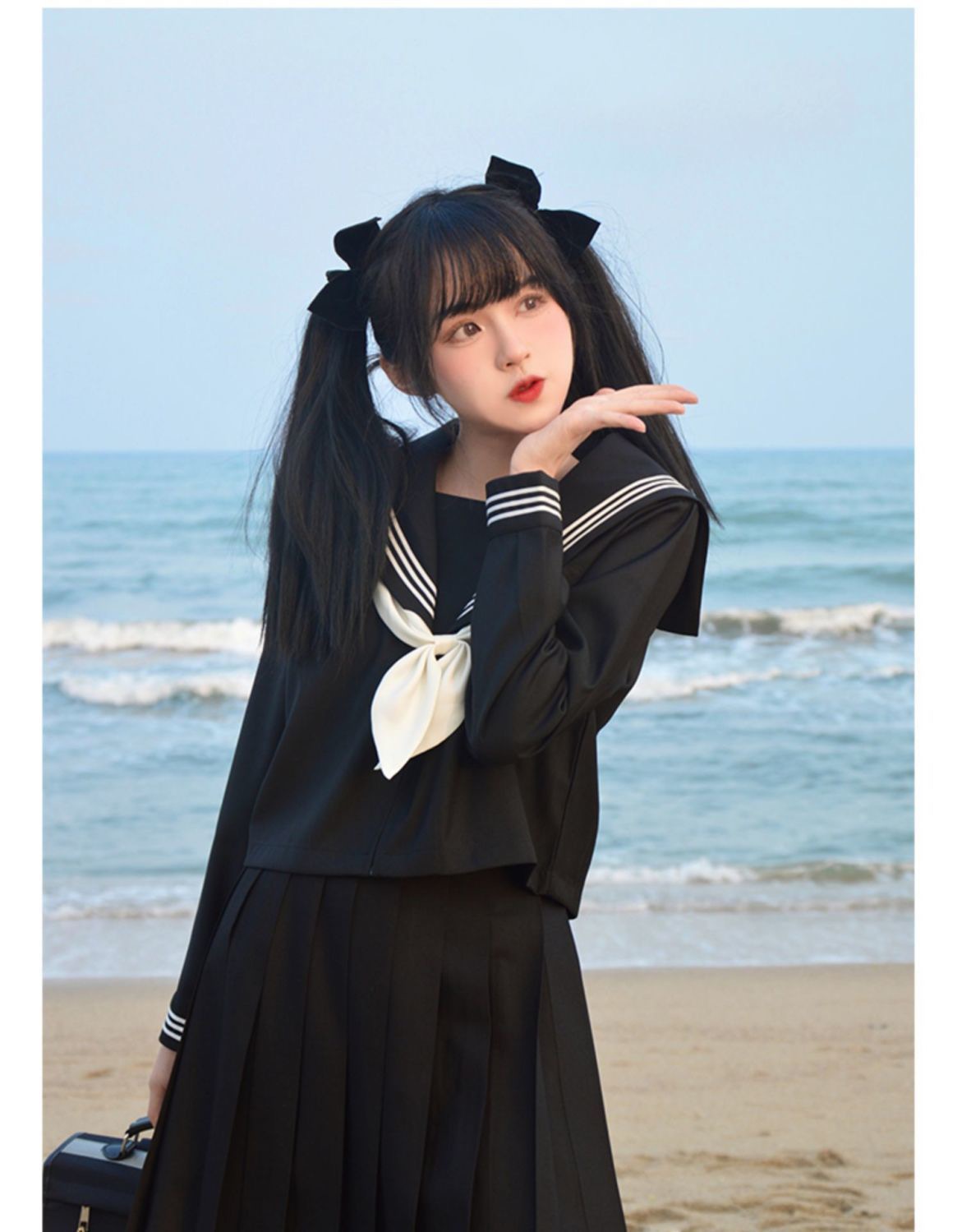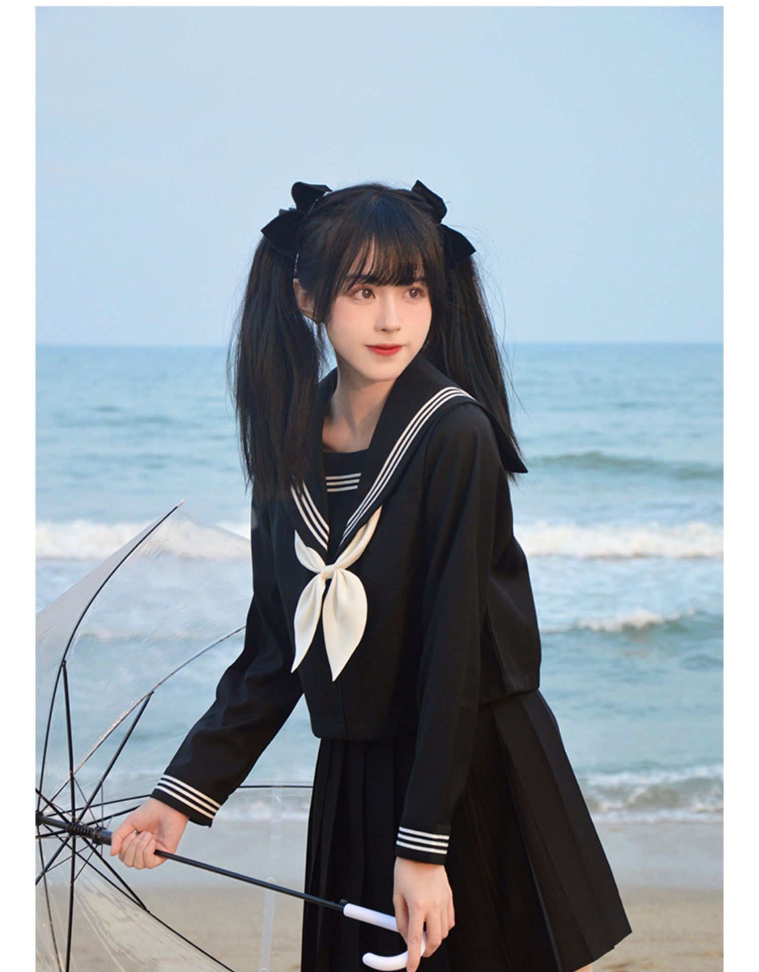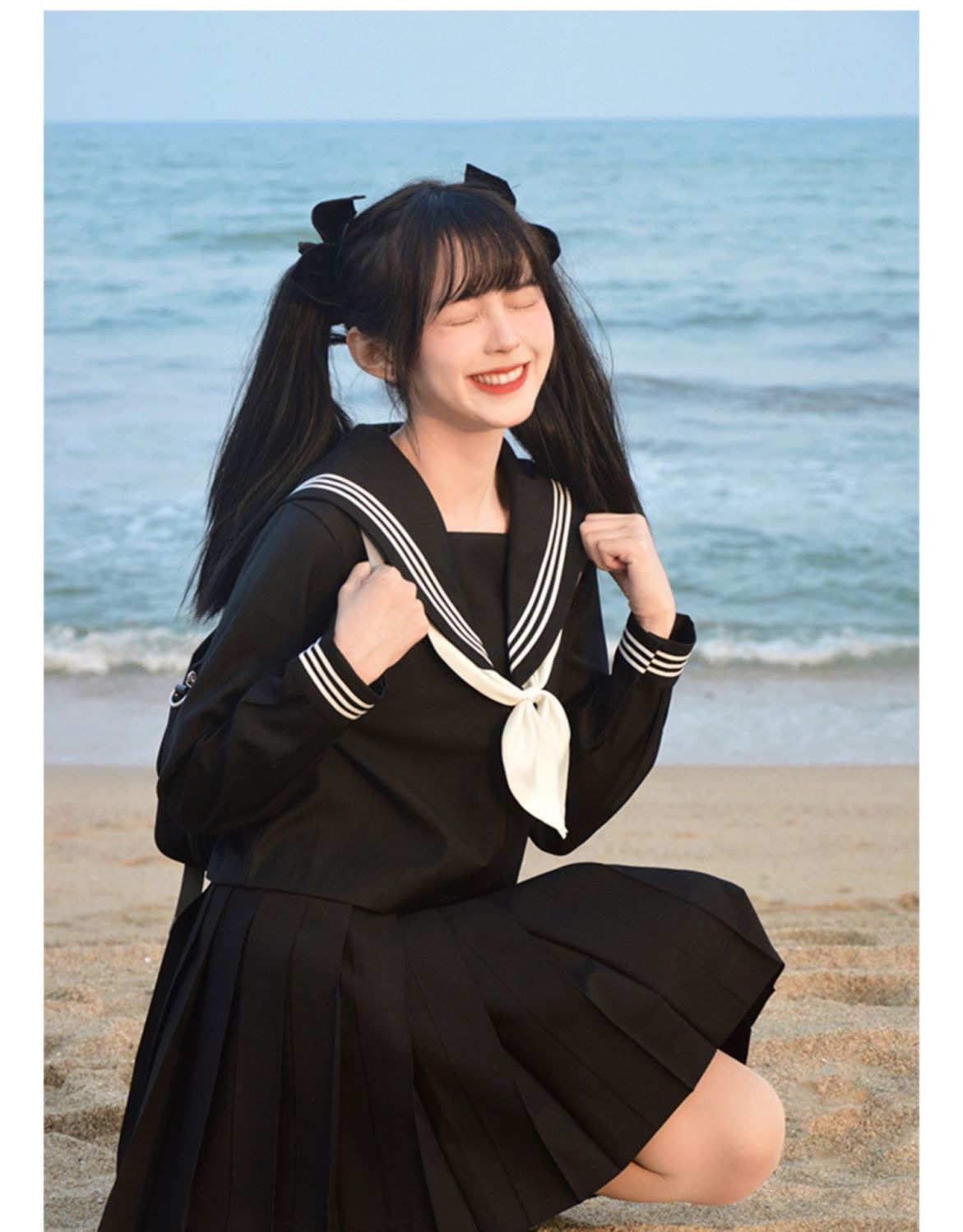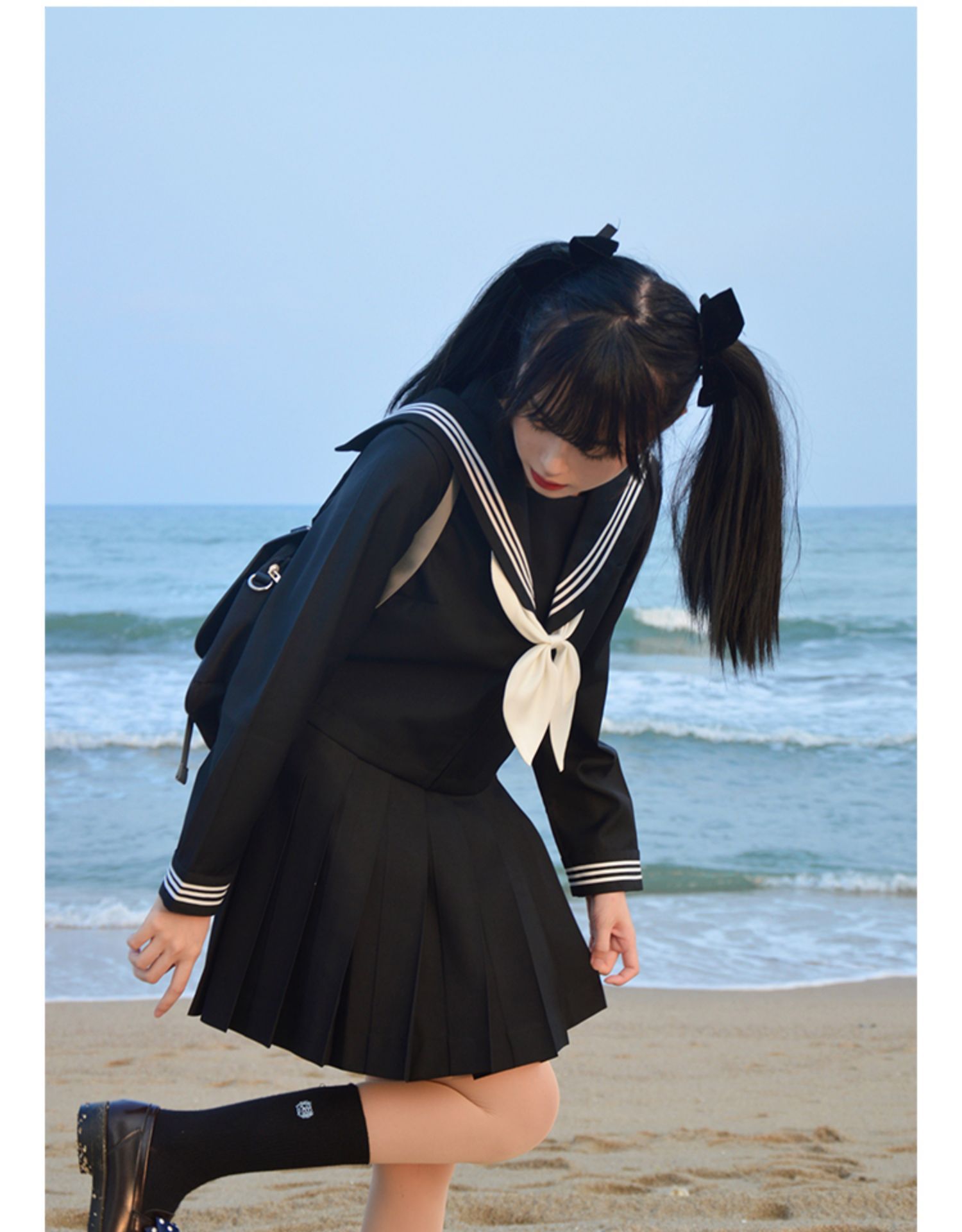 Черный костюм моряка с тремя длинными рукавами Японский Базовый костюм JK Униформа длинная юбка полный академический стиль подлинный Средний Костюм