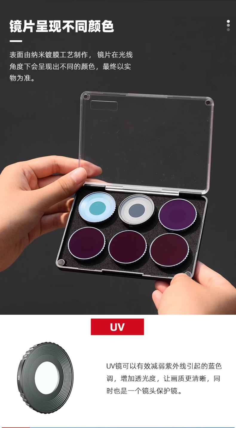 Доступны следующие фильтры action5pro/action4; УФ-защитное зеркало; Полиполяризатор CPL; ND8; ND16; ND32; ND64; Набор из 4 частей (ND8 ND16 ND32 ND64); Набор из 6 частей (ND8 ND16 ND32 ND64 UV CPL)