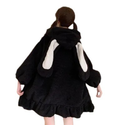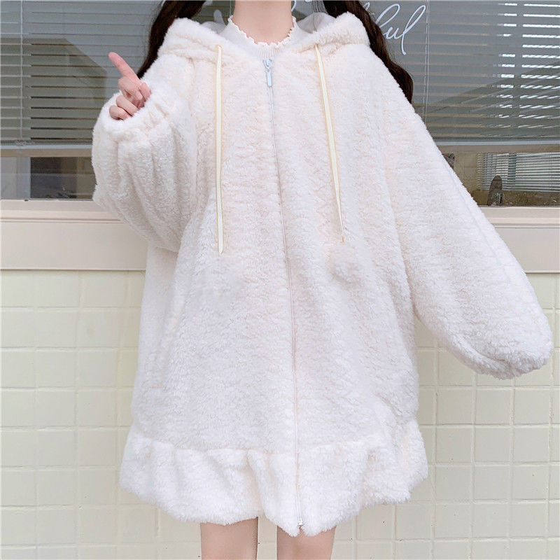 Зимний стиль Мягкий девушка милый меховой шар кроличьи уши капюшон лист лотоса бордюр из овечьей шерсти утолщенное хлопковое пальто для студентов женщин