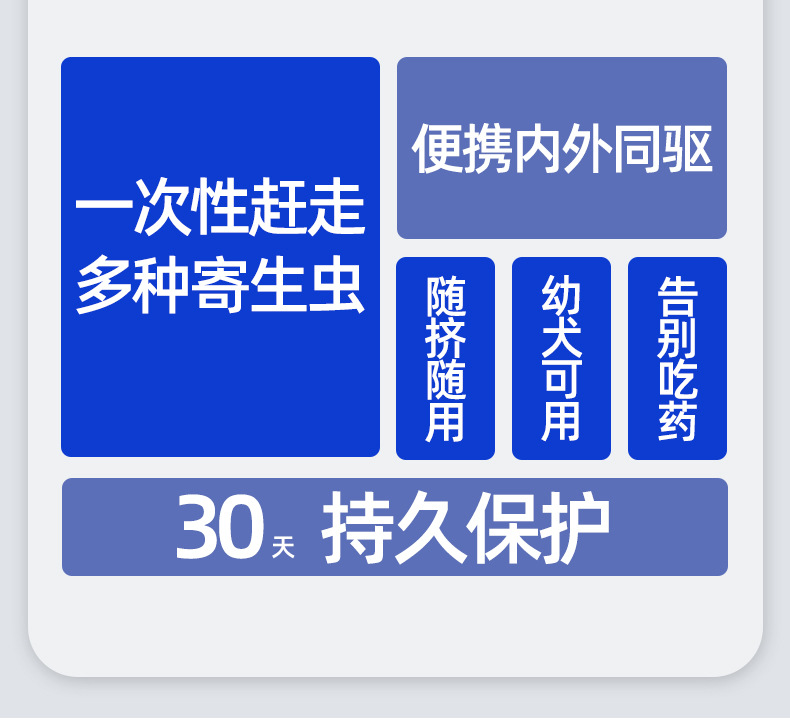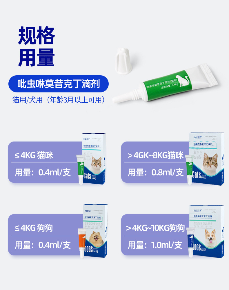 0,4 мл*1 тюбик (один тюбик для маленьких собак); 1 мл*1 тюбик (один тюбик для собак среднего размера); 1 мл*3 шт. (три штуки для собак); 0,4 мл*1 шт. (одна штука для кошек); 0,4 мл*3 шт. (три штуки для кошек)