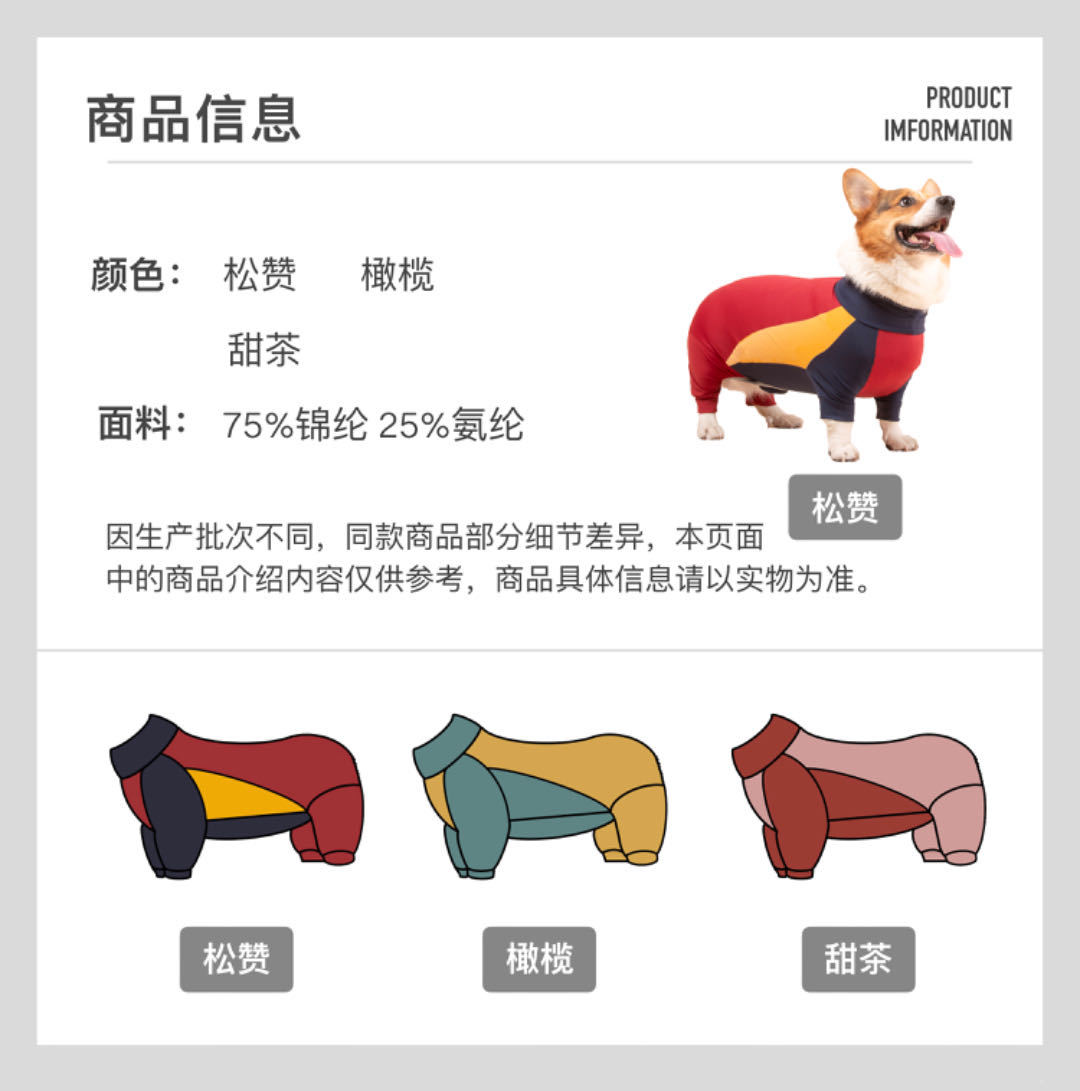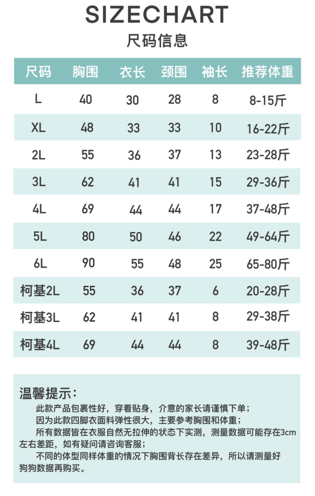 Версия Corgi с короткими штанинами XL (длина спины 30, воротник 8, обхват груди 46, рекомендуется 6.5-9.5kg); Версия Corgi 2L (длина спины 33, воротник 9, обхват груди 53, рекомендуется 10-14kg); Версия Corgi с короткими штанинами 3 л (длина спины 34, воротник 10, размер груди 60, рекомендуется 14-18kg); Корги версия с короткими штанинами 4л (длина спины 38, воротник 10, обхват груди 67, рекомендуется 36-45); Стандартная версия с длинными ножками L (рекомендуется 3-6kg шт.); Стандартная версия с длинными ножками XL (рекомендуется 6.5-9.5kg шт.); Стандартная версия с длинными ножками 2L (рекомендуется 10-14kg шт.); Стандартная версия с длинными ножками 3L (рекомендуется 14.5-18kg шт.); Стандартная версия с длинными ножками 4L (рекомендуется 18.5-24kg шт.); Стандартная версия с длинными ножками 5L (рекомендуется 24.5-32kg шт.); Стандартная версия с длинными ножками 6L (рекомендуется 32.5-40kg шт.)