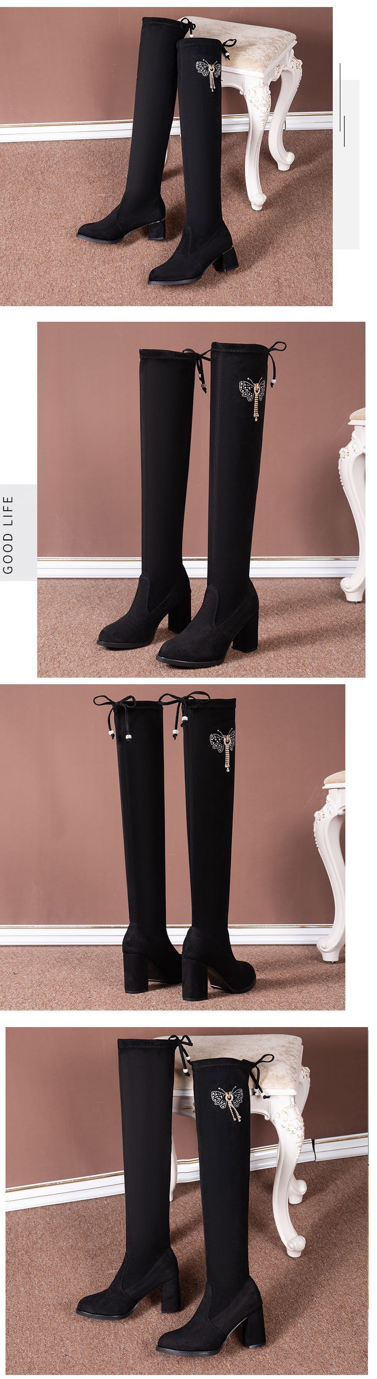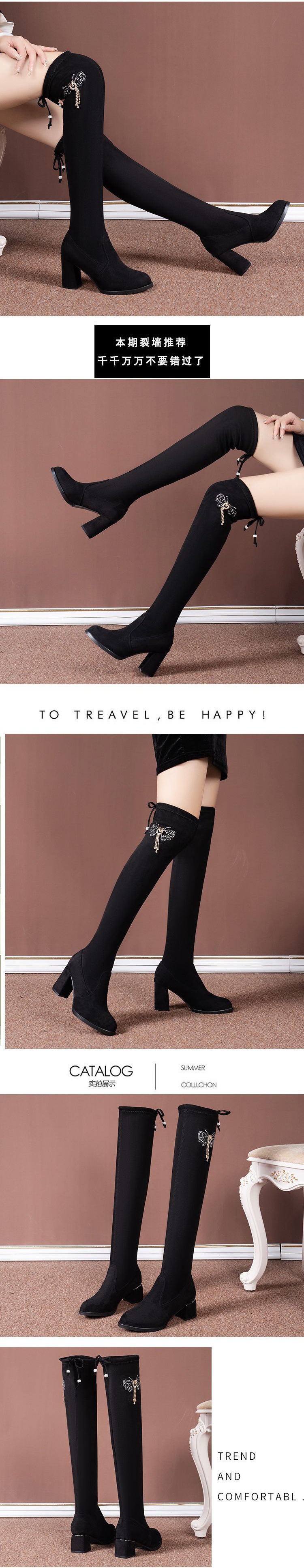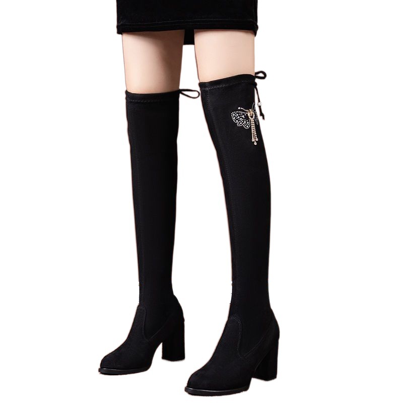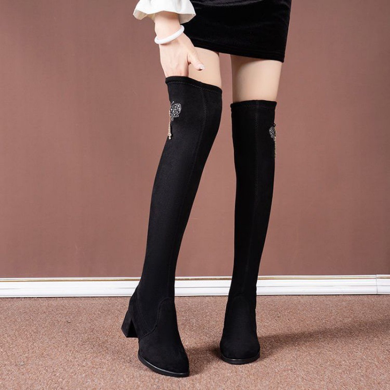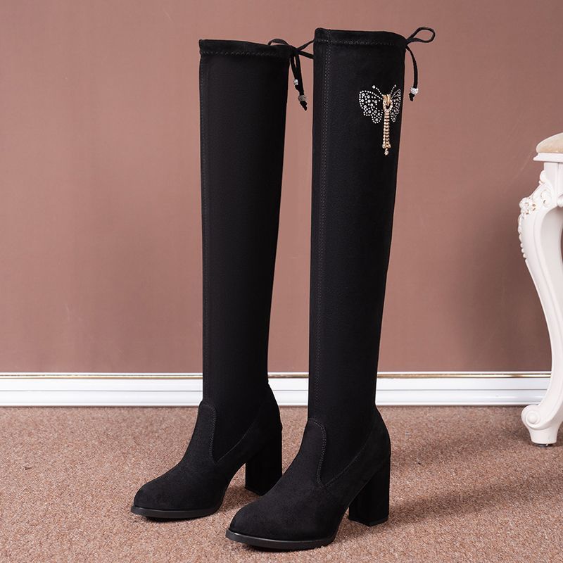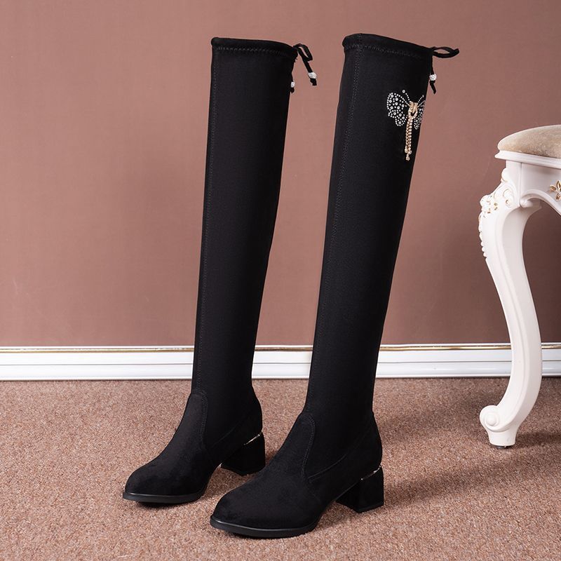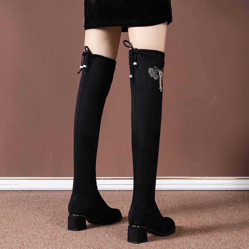 Женские длинные сапоги выше колена на толстом каблуке, тонкие сапоги 2023, осенне-зимние длинные сапоги на высоком каблуке, эластичные сапоги, женские сапоги на флисовой подкладке