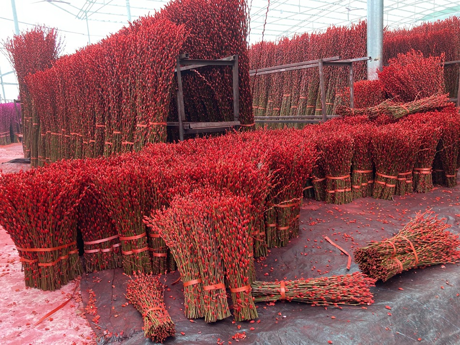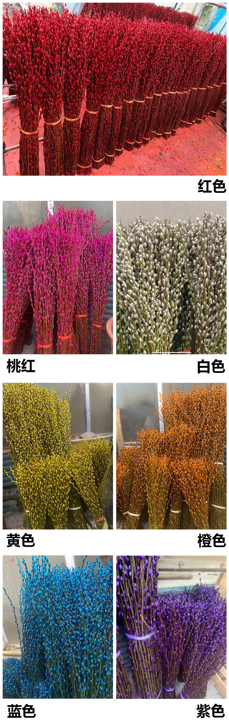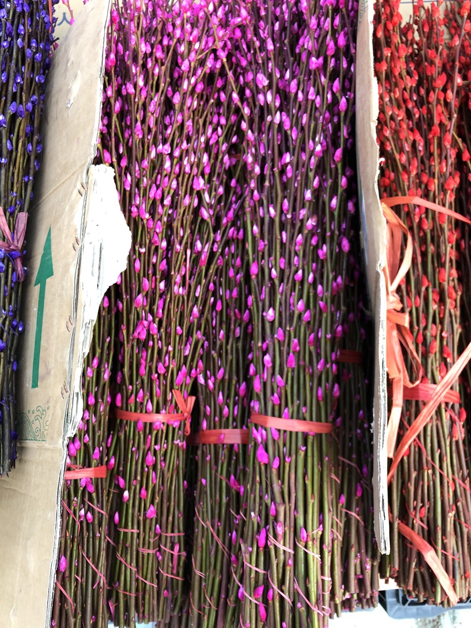 银柳主要种植在四川成都及周边地区,毎年十月底上市,花外面包一层橙色外壳,剥开为白色,可以染色成红色,玫红,粉,绿,蓝,紫,黄,橙等颜色,又称七彩柳。