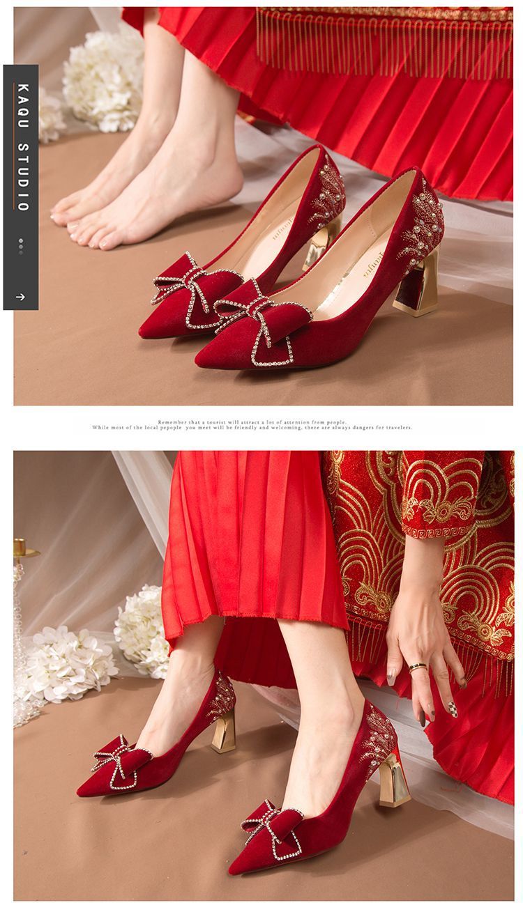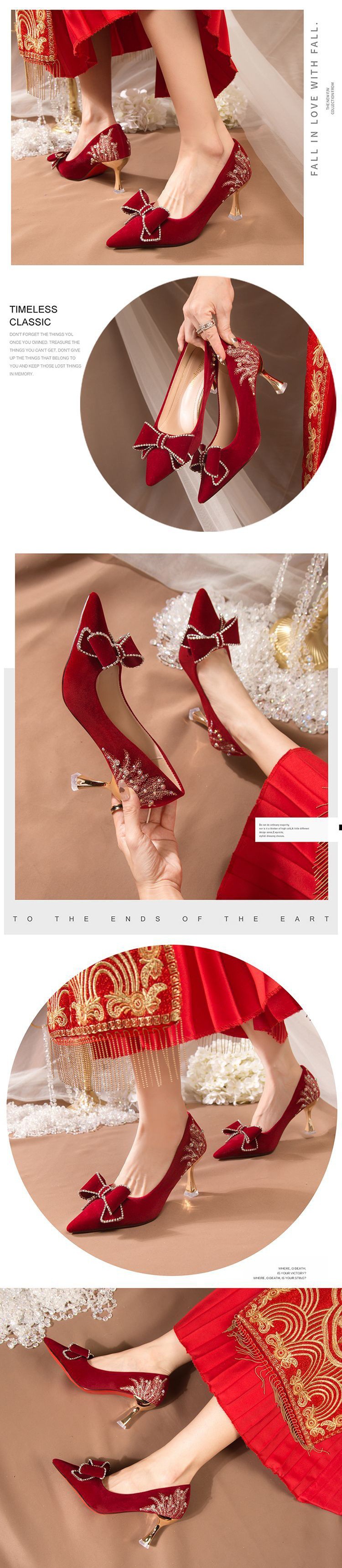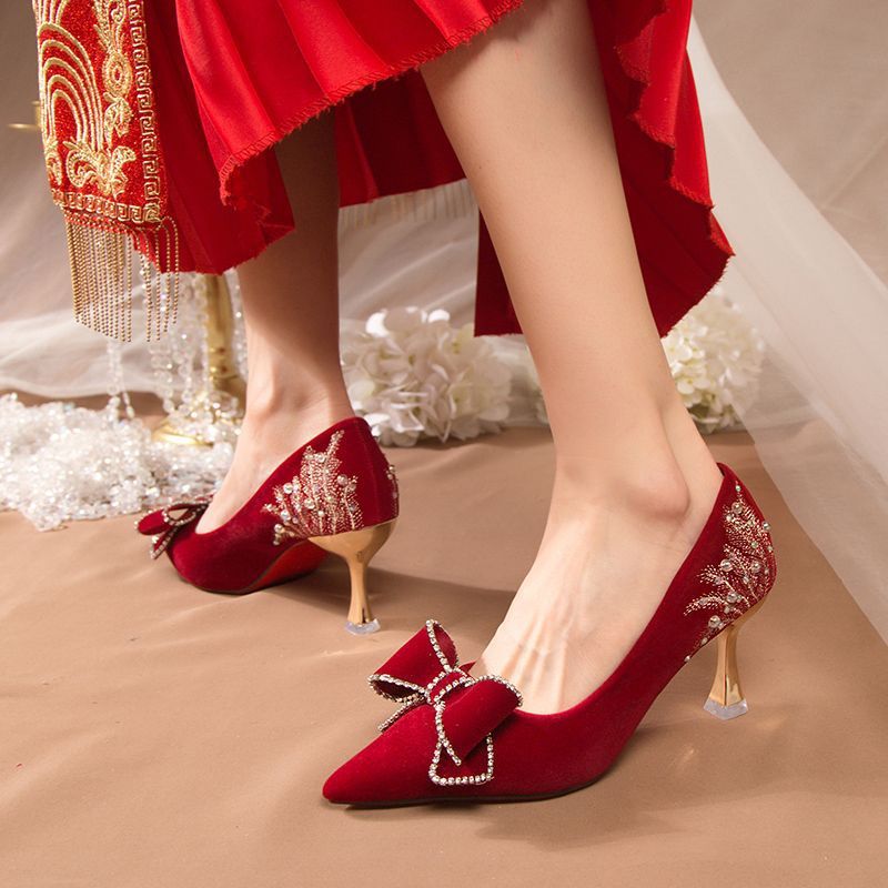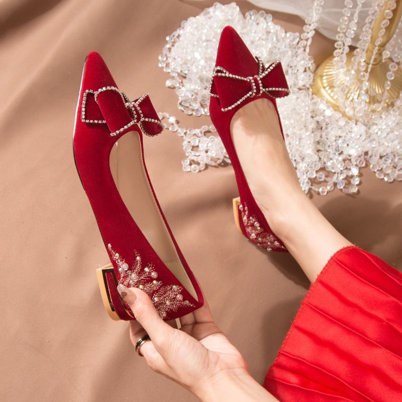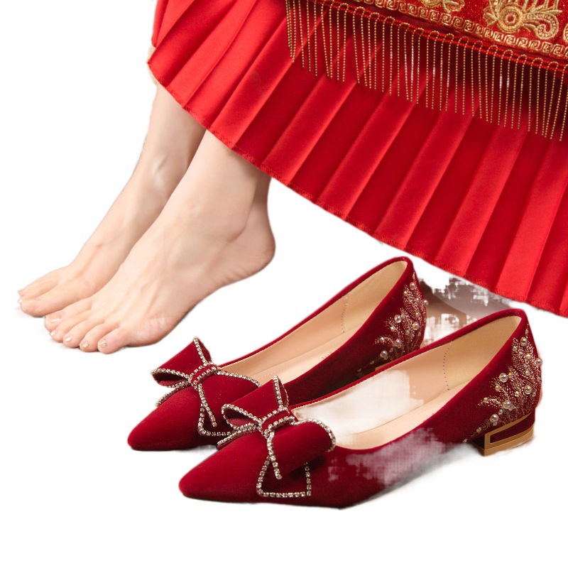 Высокие каблуки Свадебные красные туфли 2023 Новые китайские туфли с острым носком на плоской подошве Туфли невесты