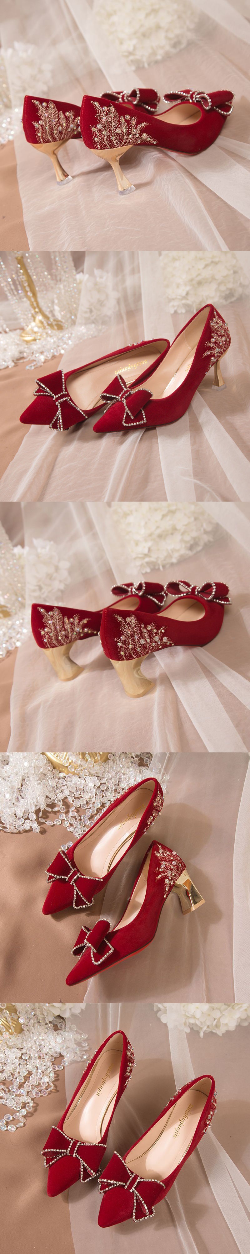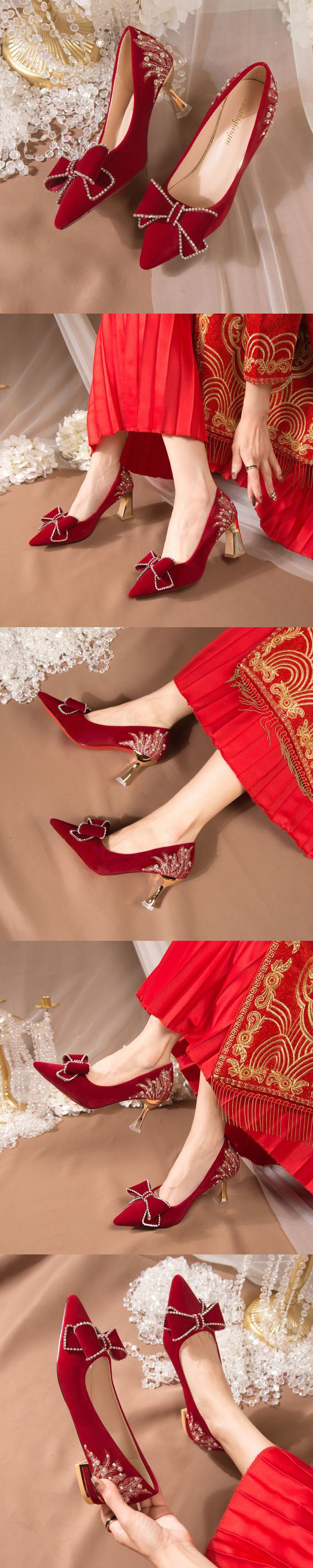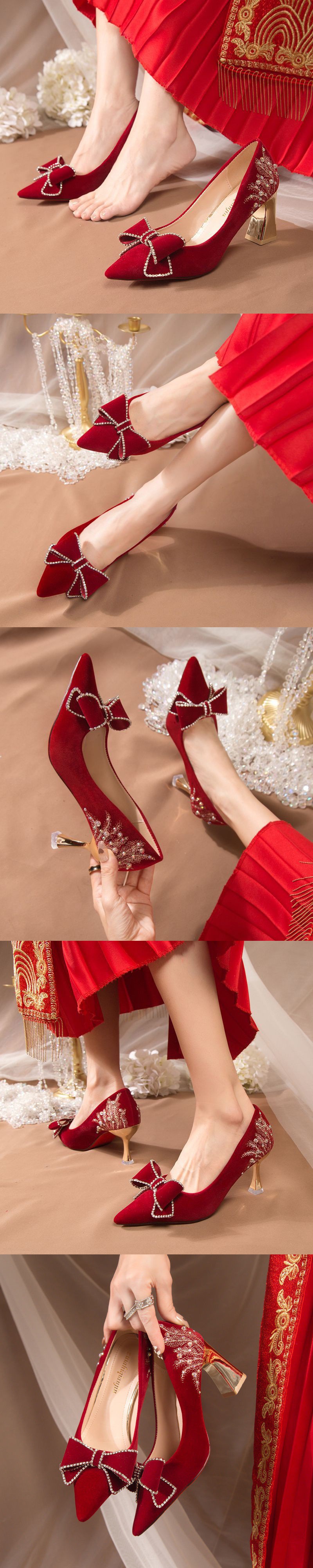 Высокие каблуки Свадебные красные туфли 2023 Новые китайские туфли с острым носком на плоской подошве Туфли невесты